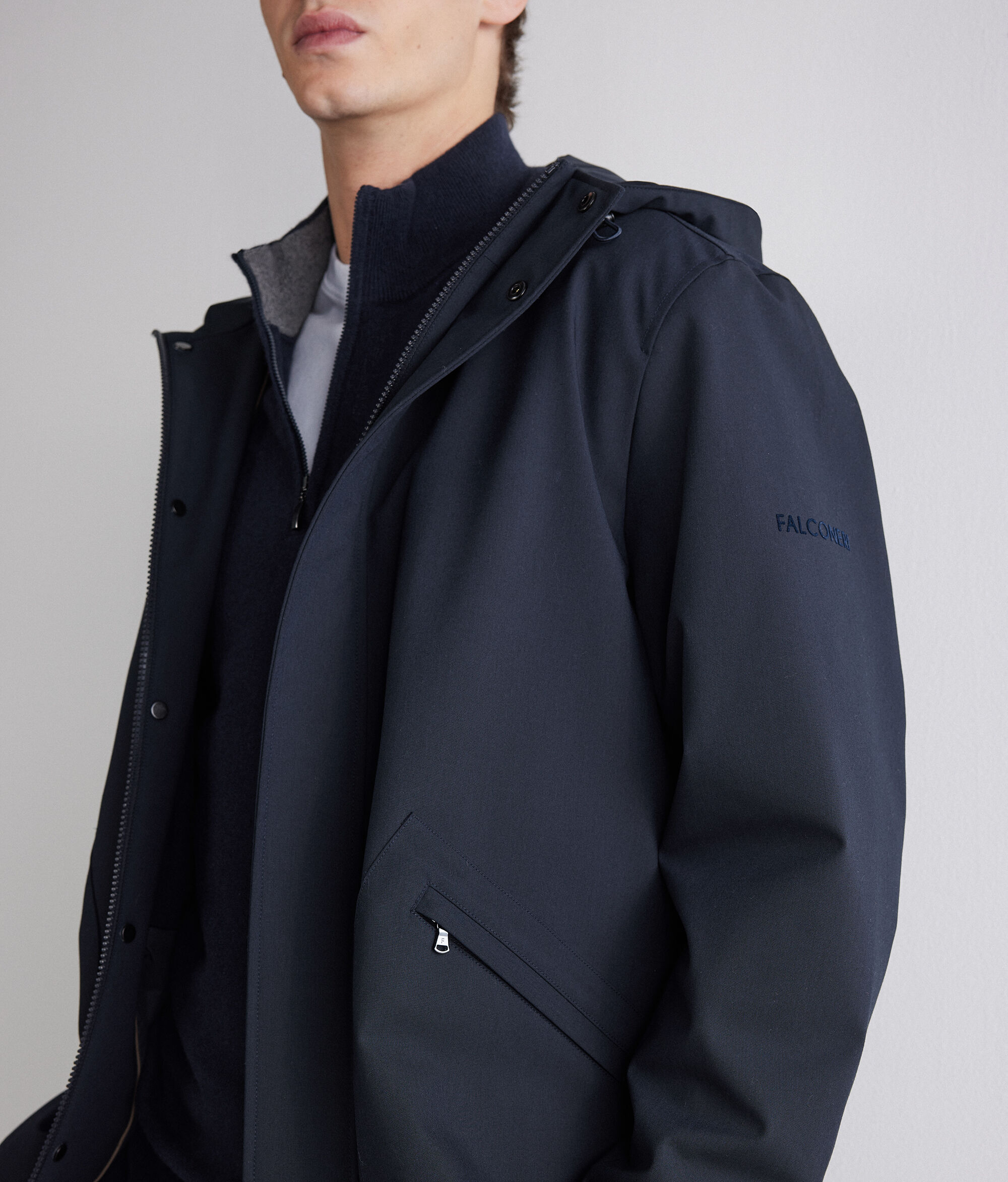 Chaqueta con capucha en tejido técnico repelente al agua: una combinación perfecta de protección y confort. El forro de cashmere ultrafine de la parte superior garantiza un efecto cálido y envolvente, equilibrado con tejido técnico en las mangas y en la parte inferior. El cierre con cremallera de doble carro y botones a presión asegura una línea esencial, mientras que los bolsillos interiores y exteriores completan su diseño con funcionalidad y versatilidad.