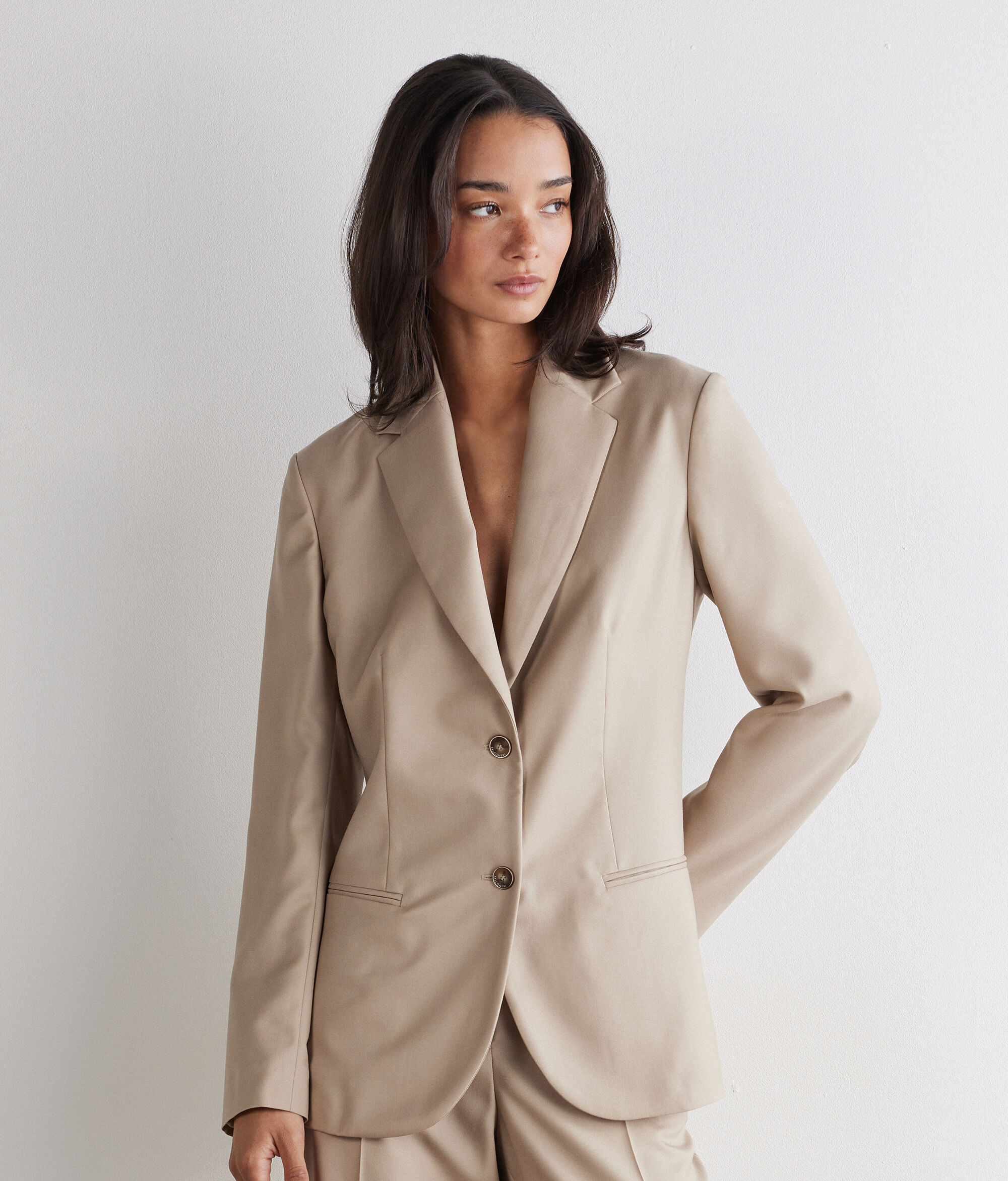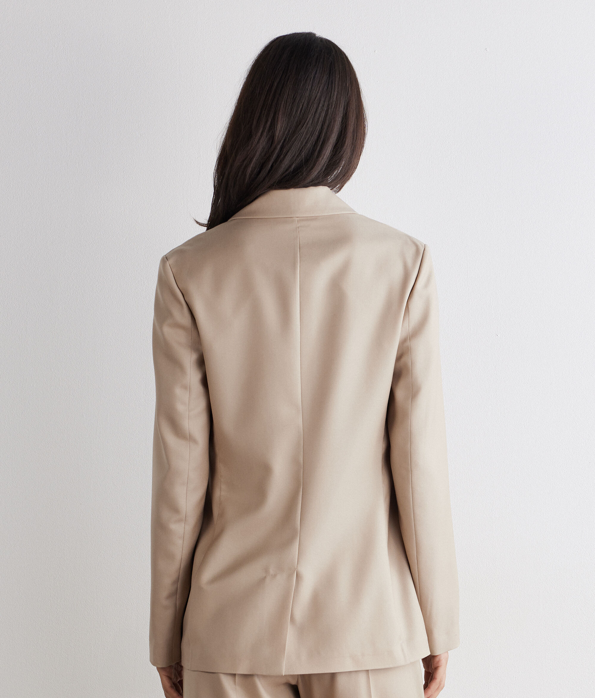 Síntesis de elegancia y encanto: Esta chaqueta en cashmere y seda envuelve la figura con luminosidad y con una suavidad impalpable. El cierre de botonadura sencilla con dos botones crea una silueta armoniosa que se completa con bolsillos de doble ojal y abertura posterior; su corte entallado le confiere un encanto elegante y contemporáneo.