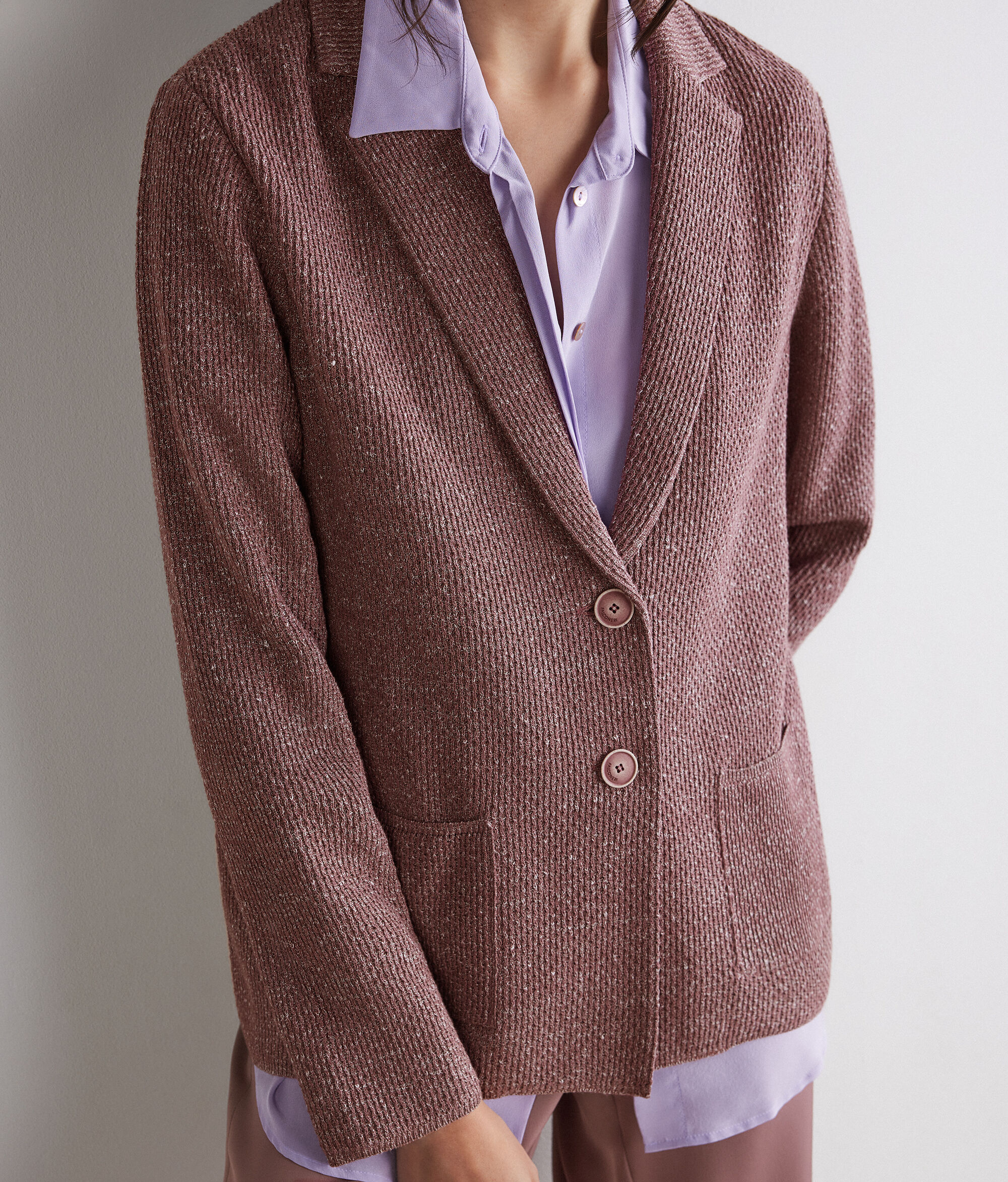 Chaqueta de algodón y lino de textura ligera y sofisticada confeccionada en punto mouliné tridimensional, que define su carácter. La solapa clásica y el cierre de botonadura sencilla con dos botones crean una línea esencial, mientras que los bolsillos aplicados en el delantero completan su diseño con un toque sofisticado. El corte estándar de esta prenda la convierte en un must-have versátil, ideal para lucir looks elegantes y de encanto atemporal.
