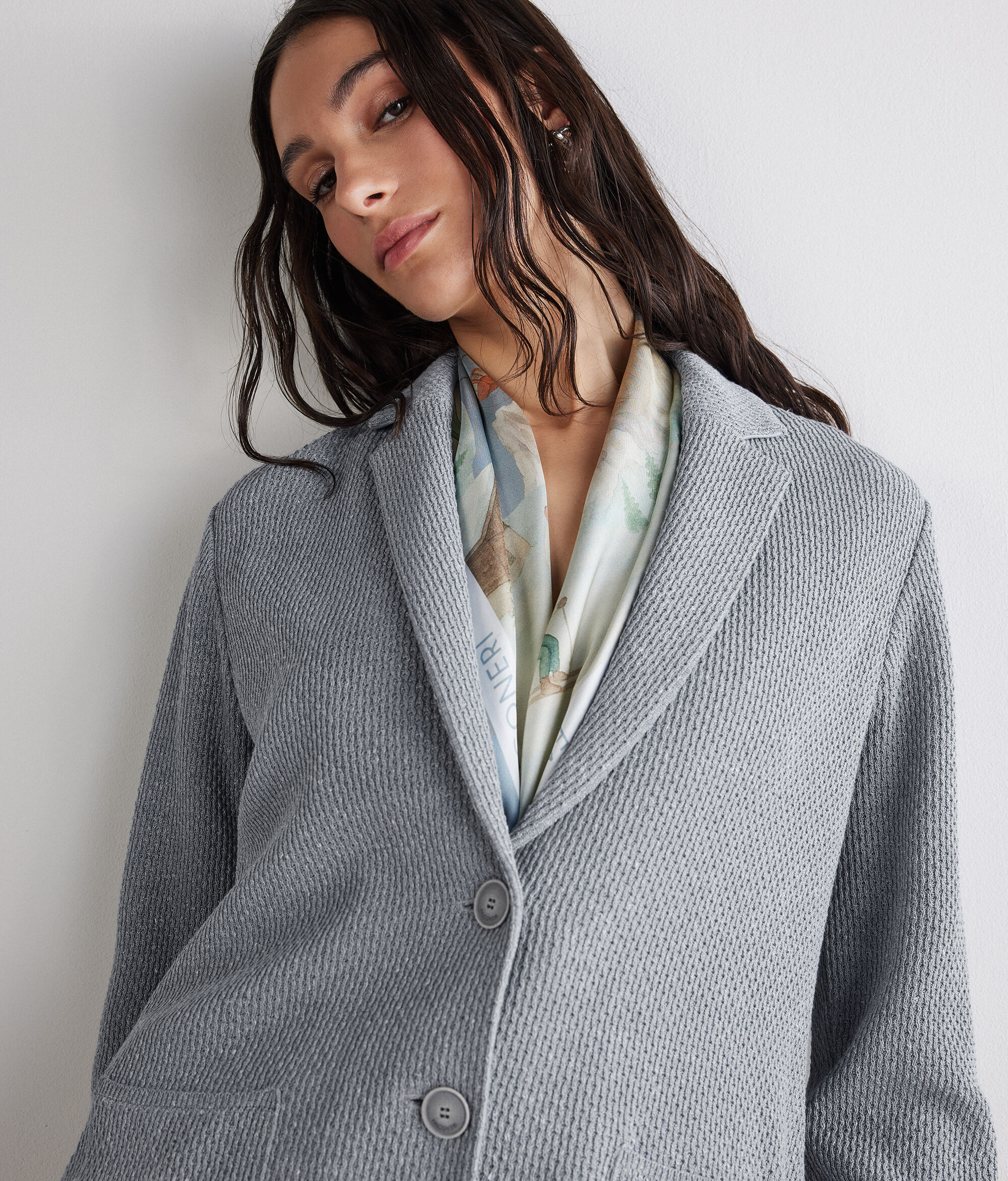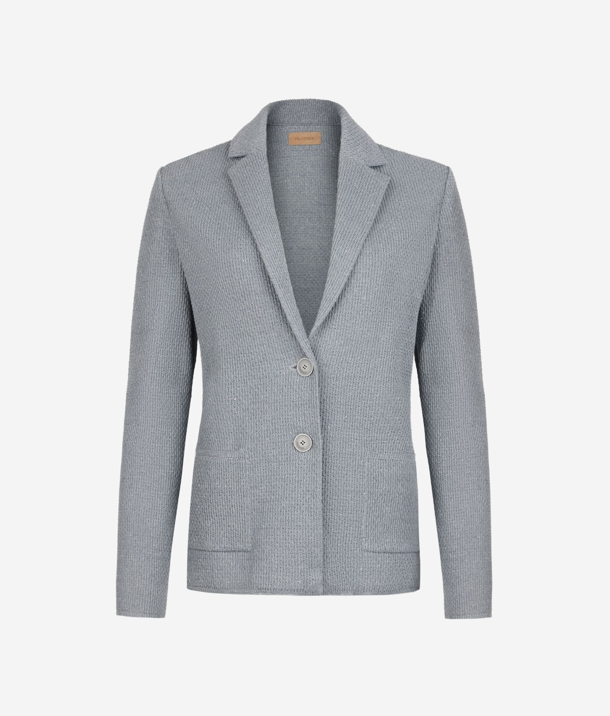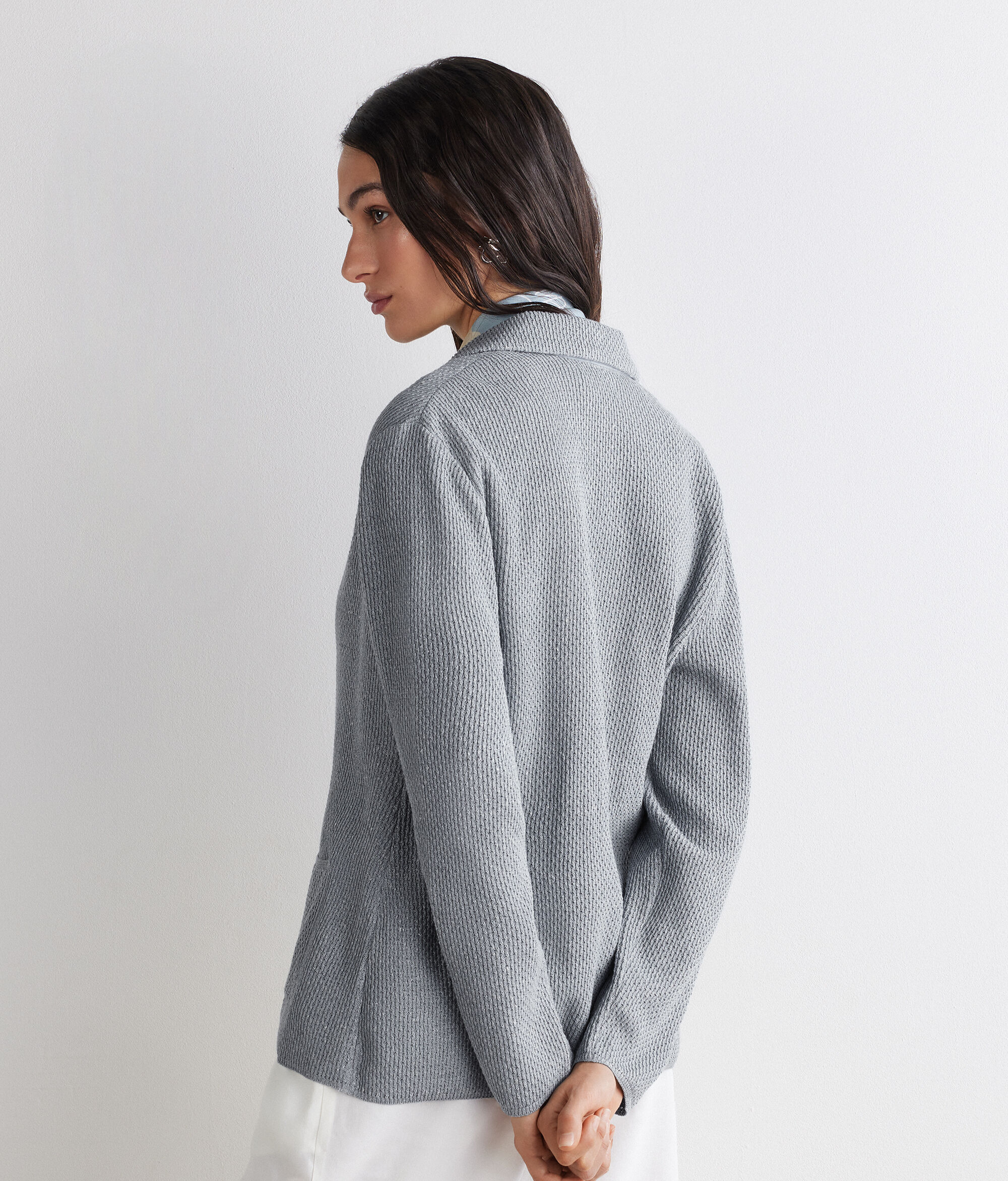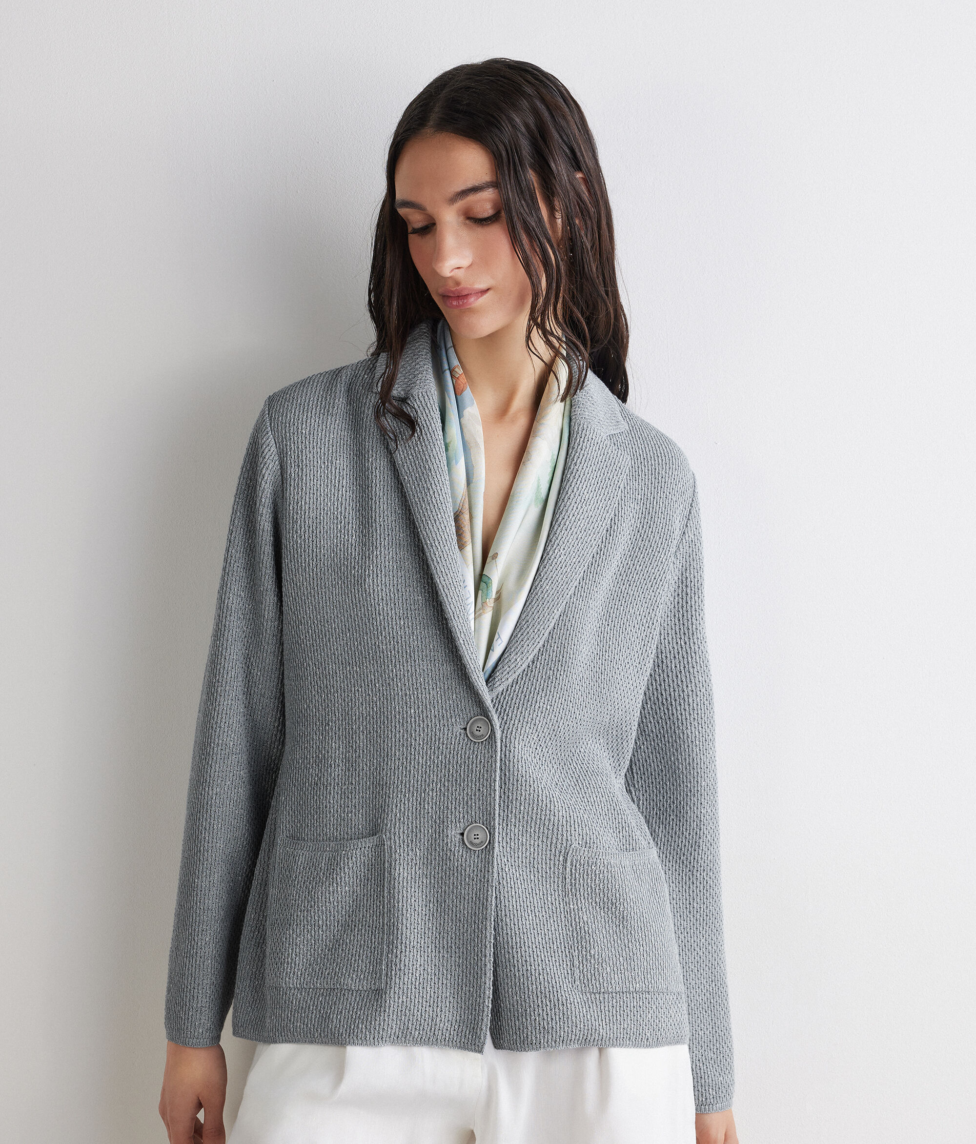 Chaqueta de algodón y lino de textura ligera y sofisticada confeccionada en punto mouliné tridimensional, que define su carácter. La solapa clásica y el cierre de botonadura sencilla con dos botones crean una línea esencial, mientras que los bolsillos aplicados en el delantero completan su diseño con un toque sofisticado. El corte estándar de esta prenda la convierte en un must-have versátil, ideal para lucir looks elegantes y de encanto atemporal.