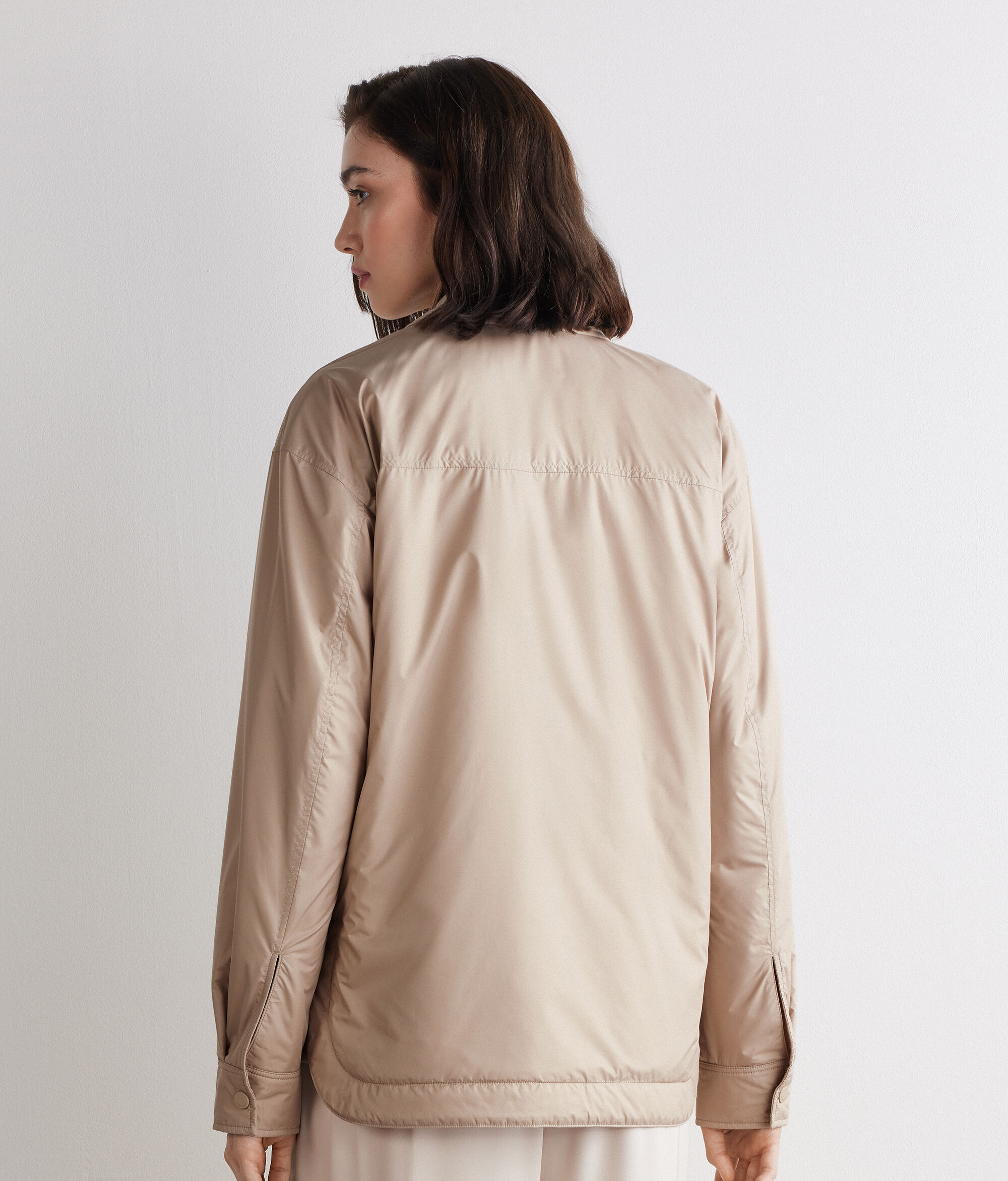 Chaqueta reversible unisex que funde lujo y funcionalidad en un diseño versátil y contemporáneo. El lado en tejido técnico repelente al agua garantiza la máxima protección y practicidad y está provisto de bolsillos de ojal y bolsillo aplicado en el pecho, mientras que el lado en cashmere ultrafine envuelve la figura con delicadeza y se completa con bolsillos de ojal con cremallera. El cuello camisero, el cierre de botonadura sencilla, las mangas con pinzas y el borde redondeado en los costados definen un diseño meticuloso y contemporáneo.