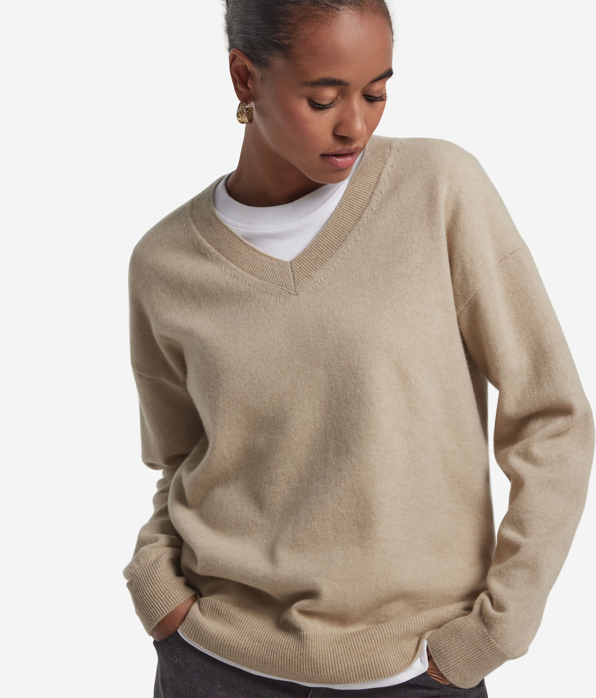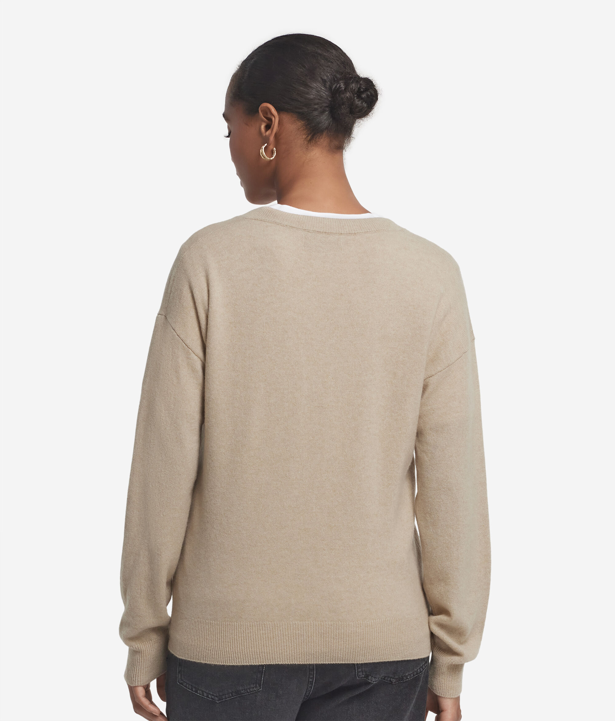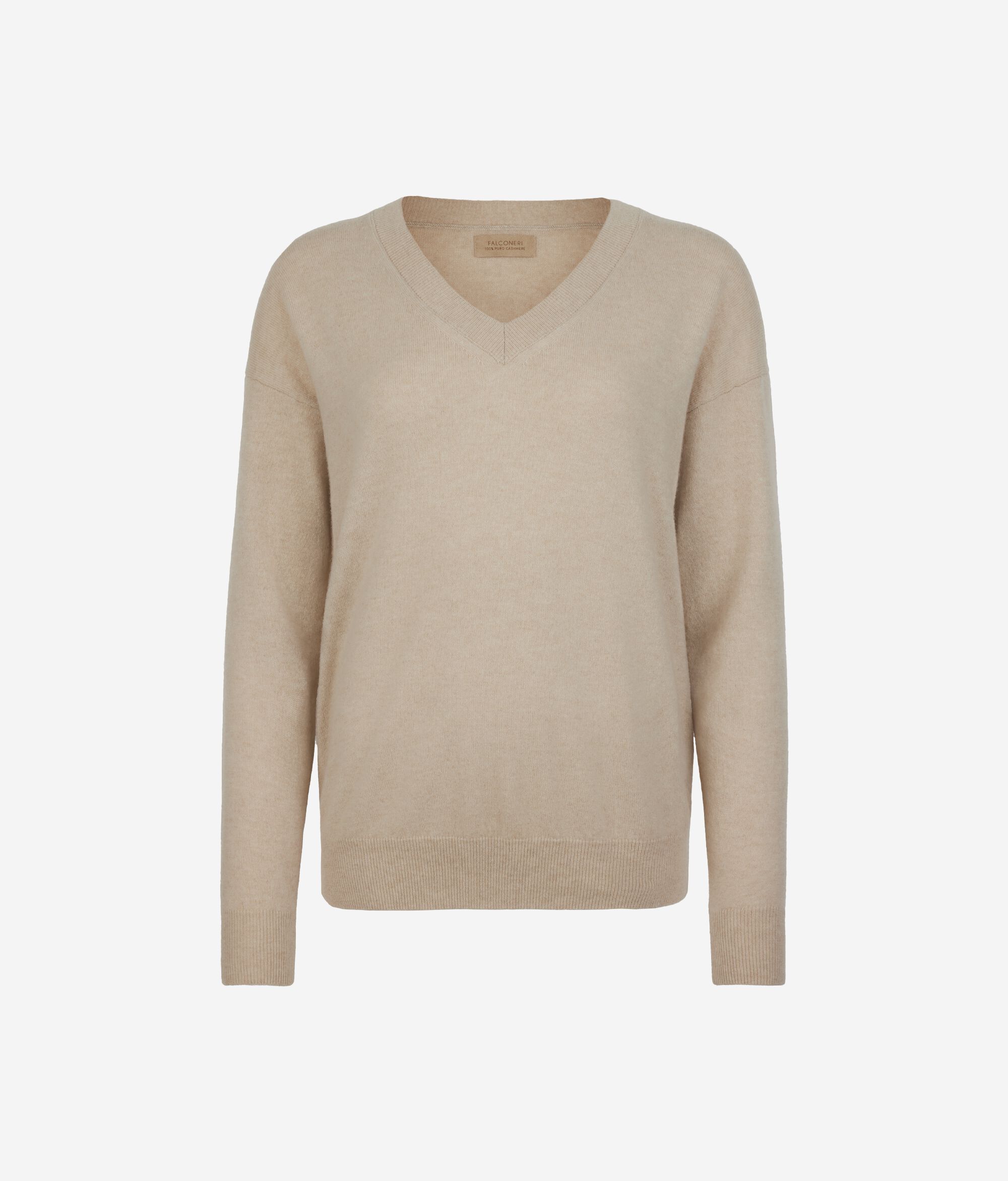 Realizado en suave cashmere ultrasoft, este jersey con cuello de pico se convertirá en una pieza clave de tu armario durante los días más frescos. El bajo, los puños y el cuello están embellecidos con punto de canalé, que añade un toque de elegancia. Su corte holgado con hombro caído produce un efecto relajado y natural que refleja un estilo actual y contemporáneo.