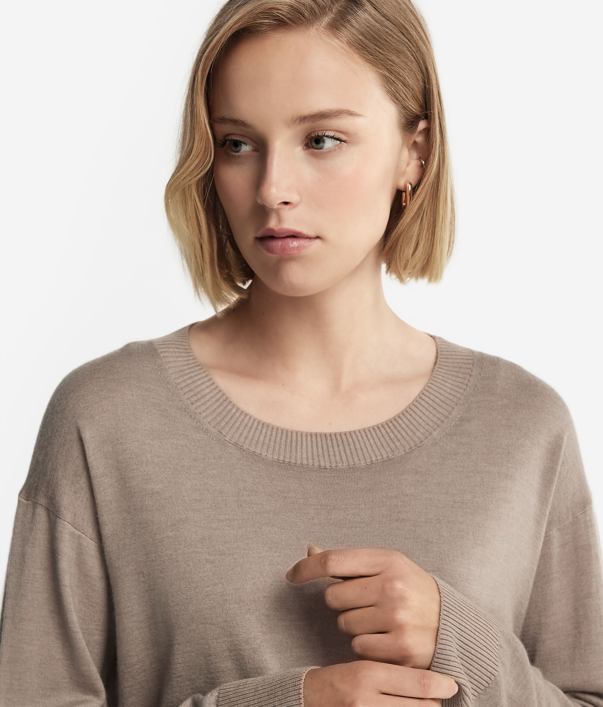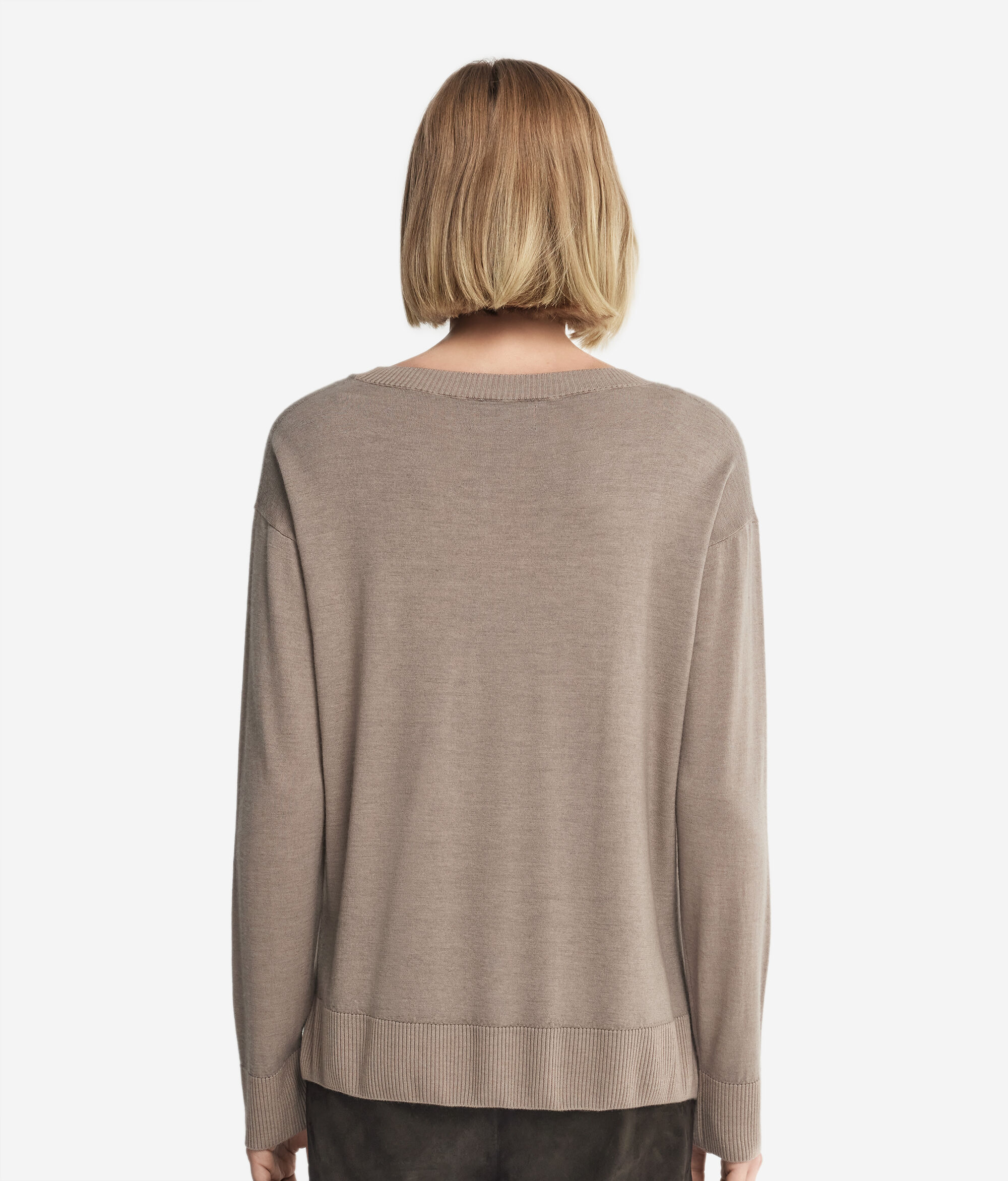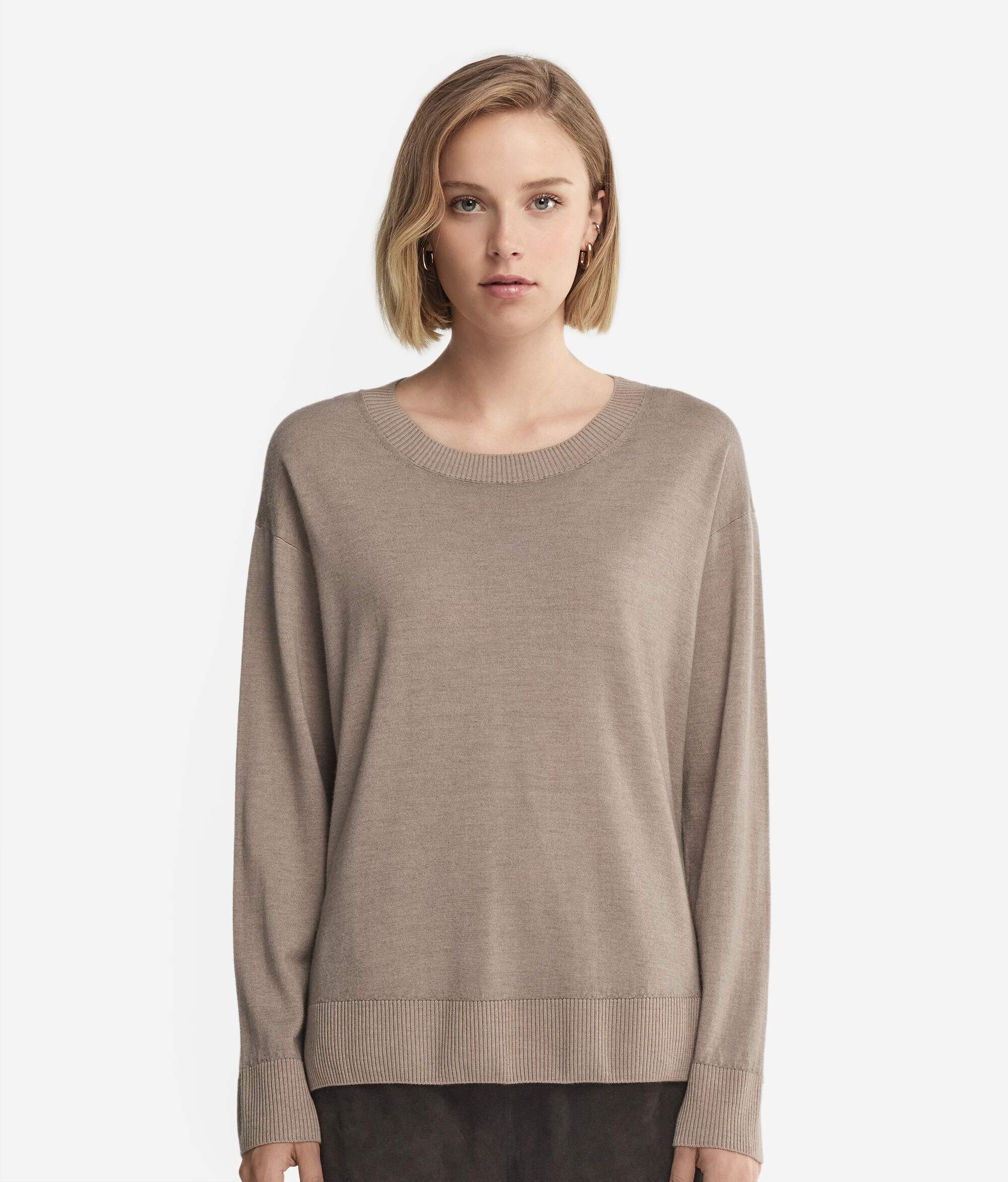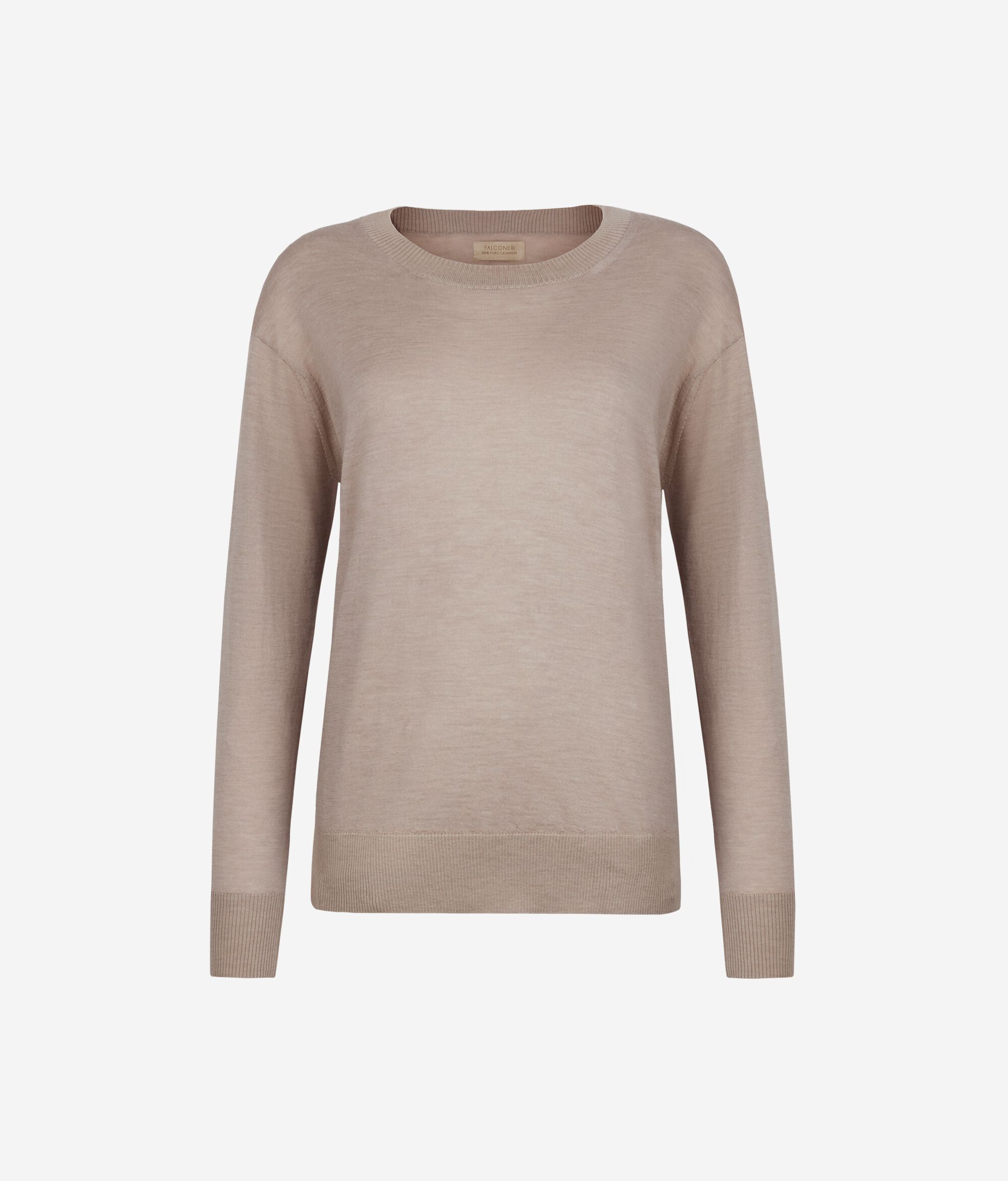 Este jersey con cuello redondo realizado en cashmere ultrafine es un modelo de manga larga con cuello, puños y bajo en punto canalé. Se distingue por sus aberturas laterales. Corte holgado, con hombro ligeramente caído.