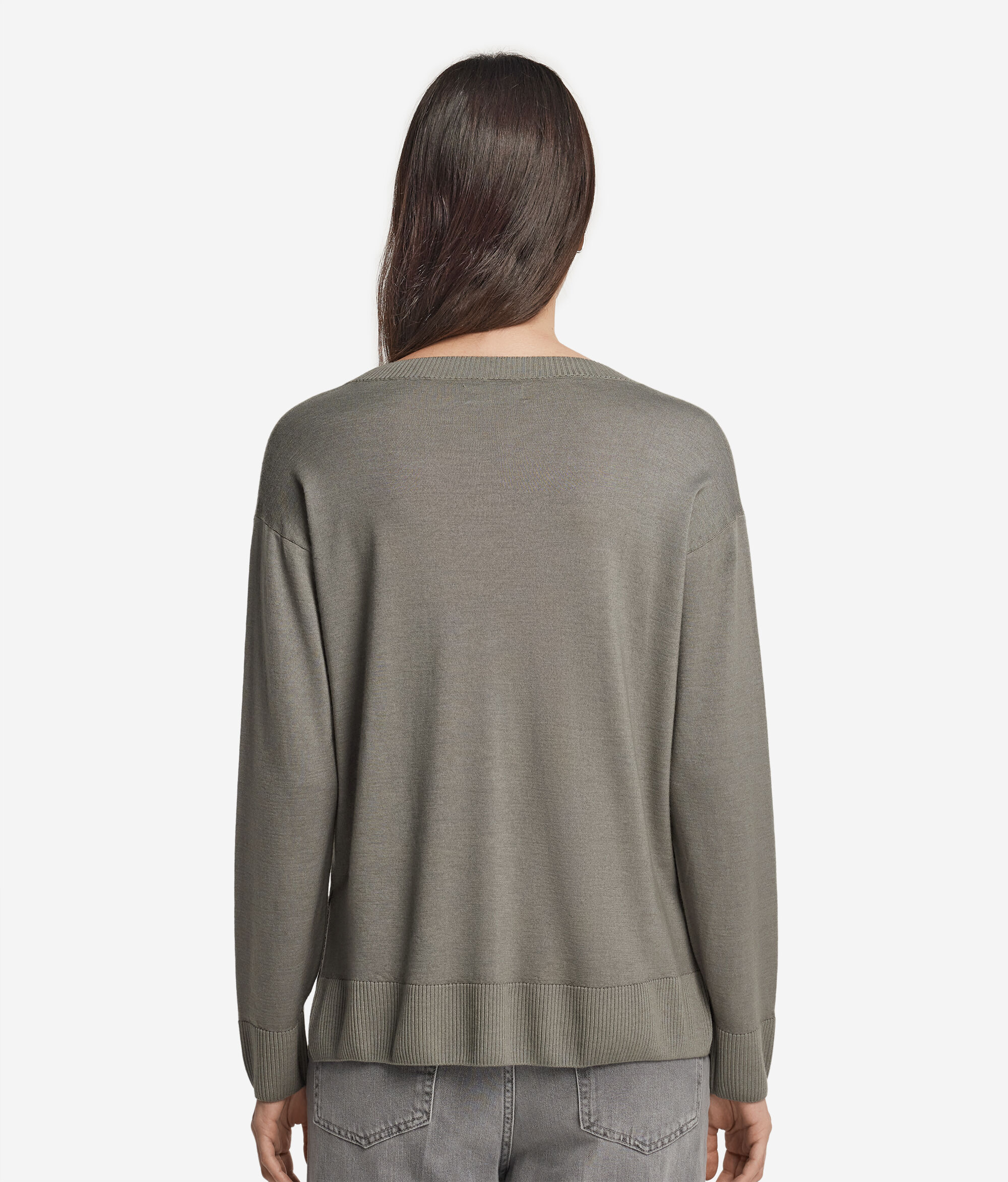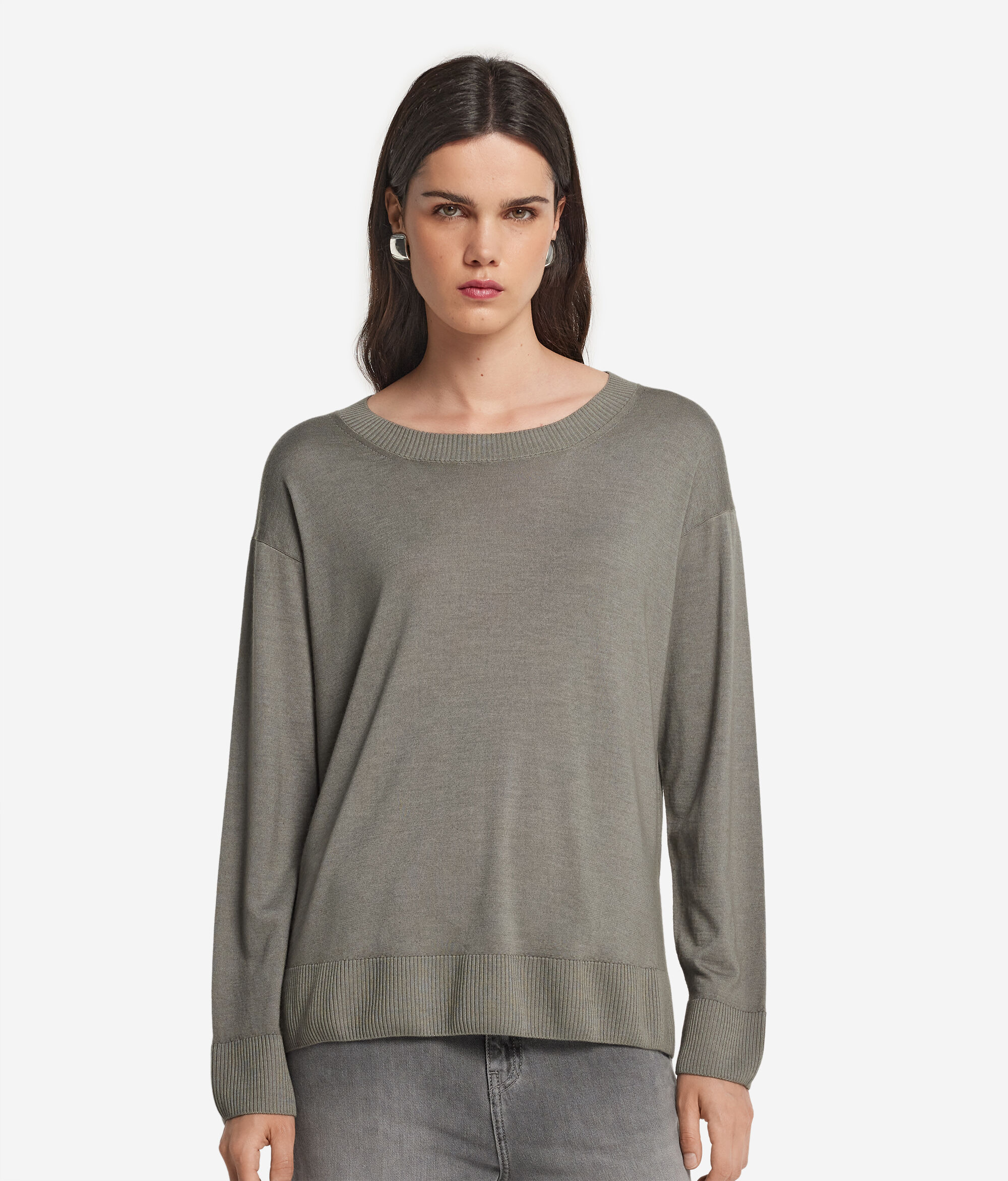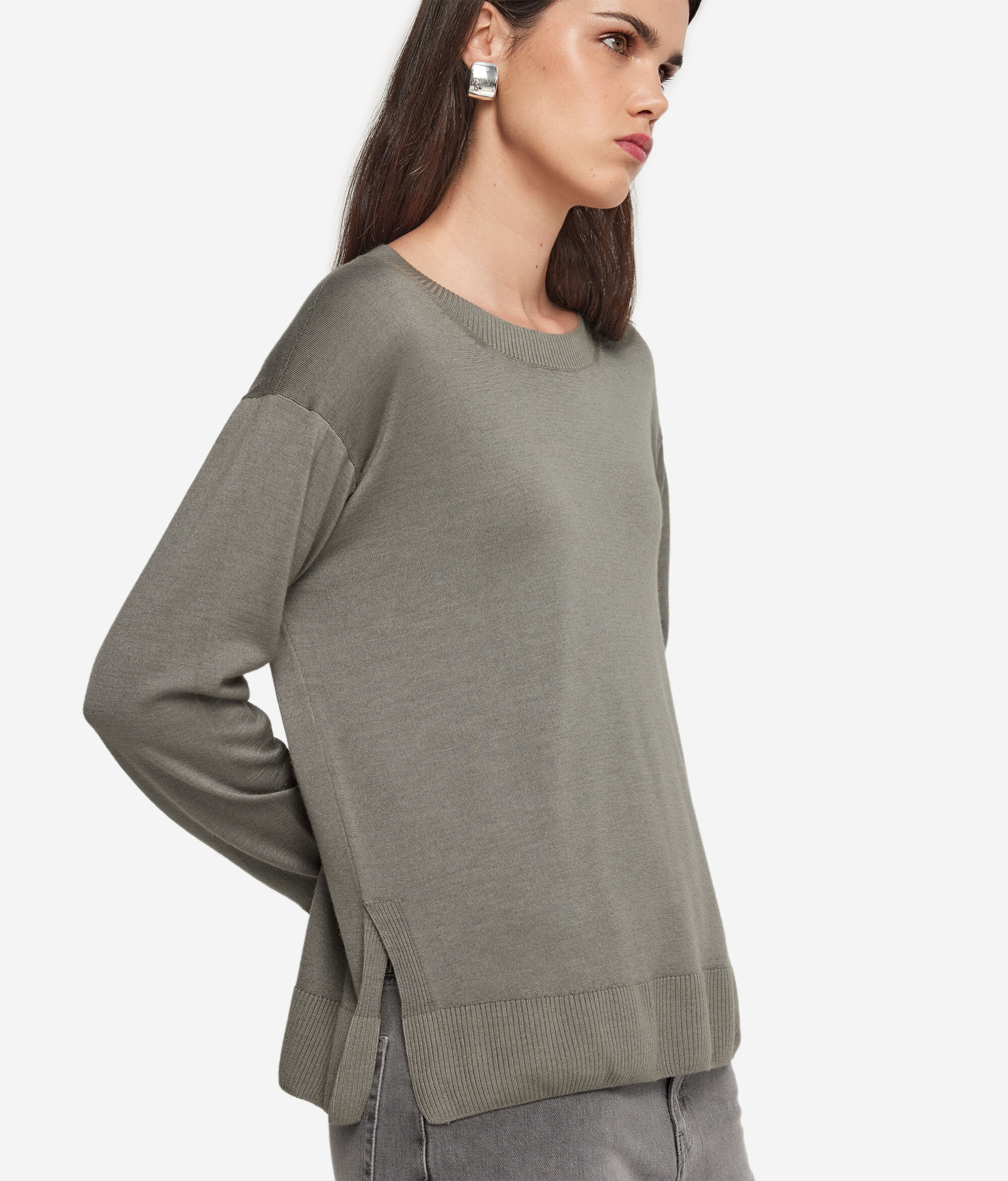 Este jersey con cuello redondo realizado en cashmere ultrafine es un modelo de manga larga con cuello, puños y bajo en punto canalé. Se distingue por sus aberturas laterales. Corte holgado, con hombro ligeramente caído.