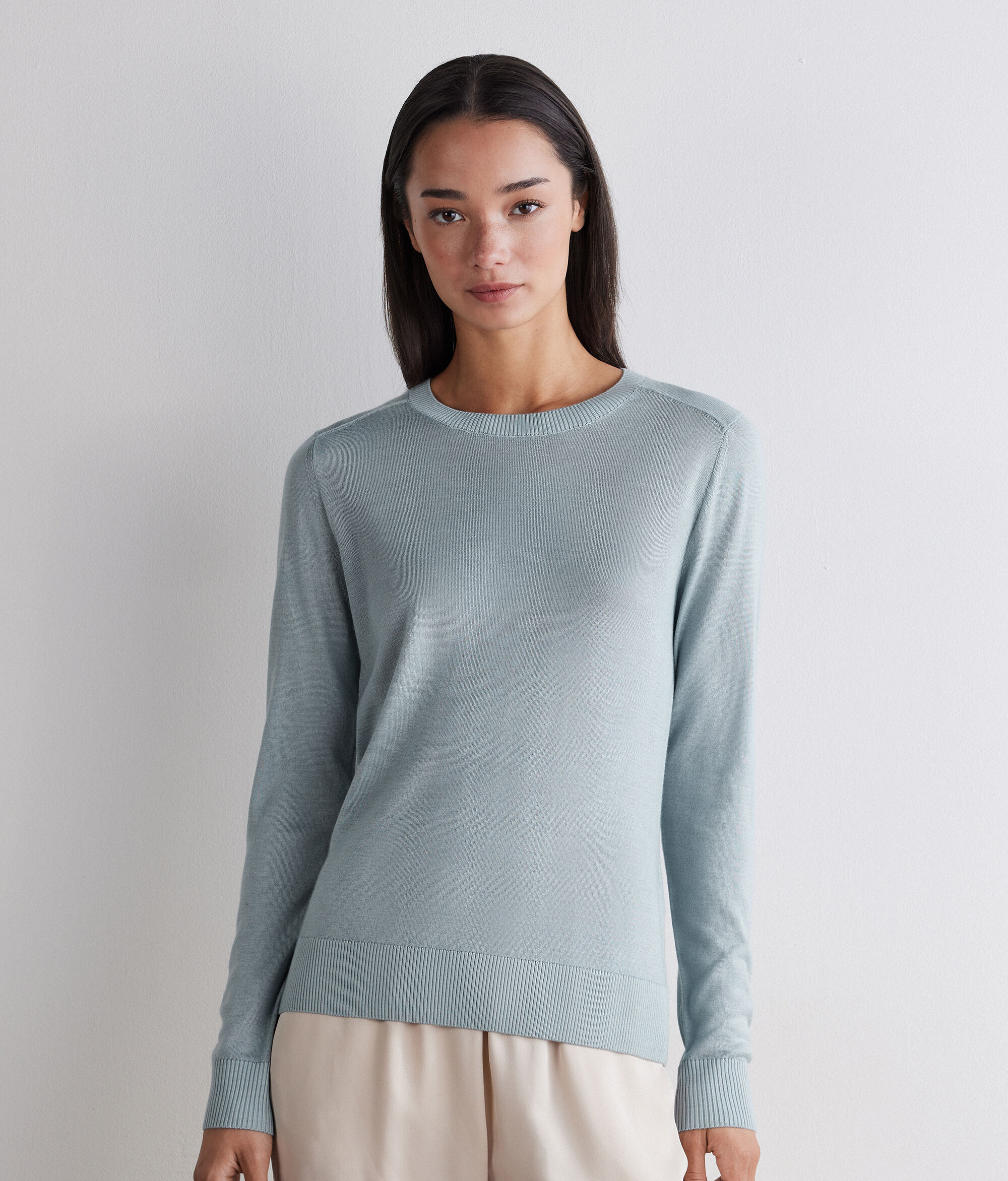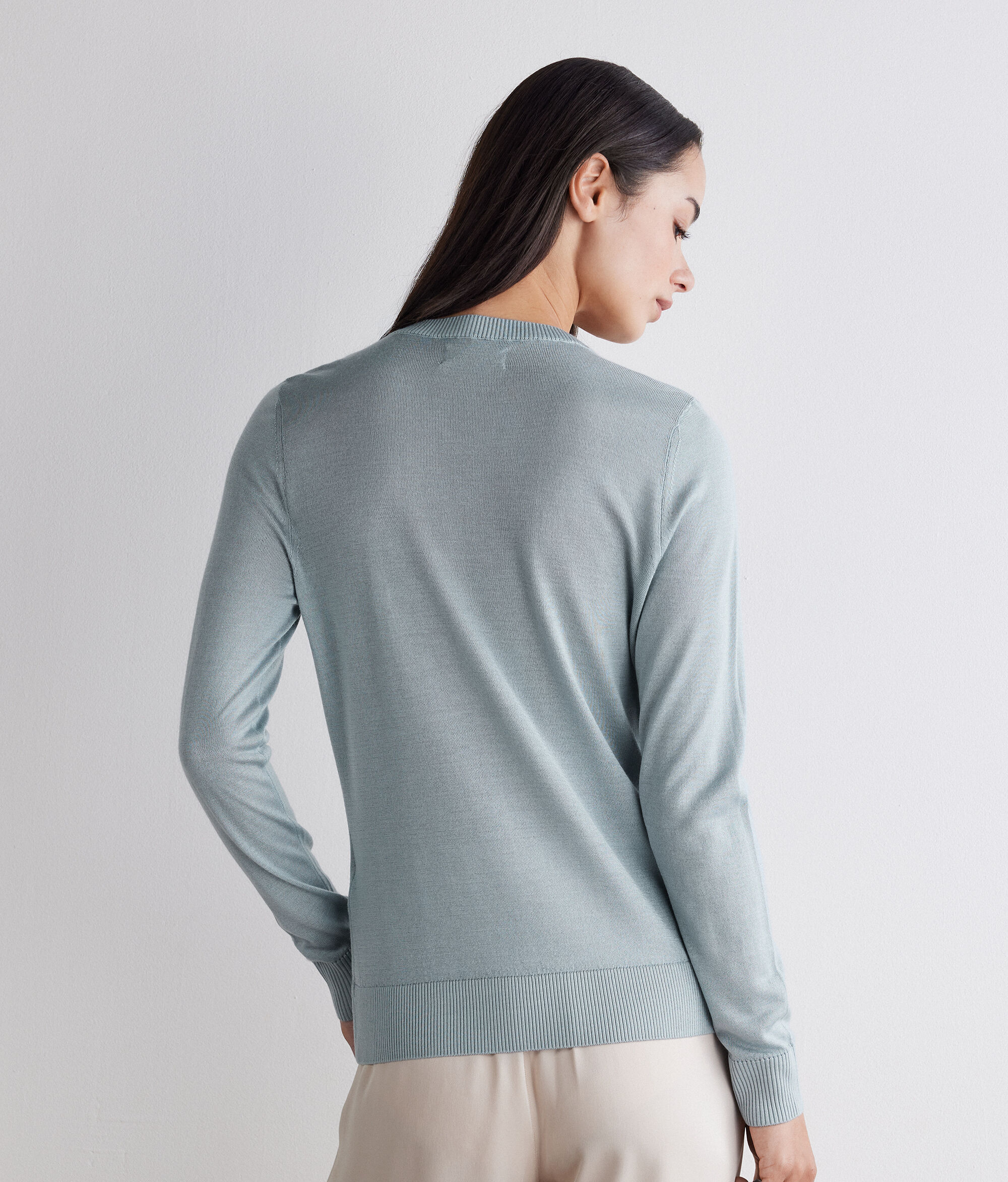 La caricia impalpable del cashmere se funde con el brillo natural de la seda en este jersey con cuello redondo de encanto esencial. El motivo de canalé del cuello, los puños y el borde aporta estructura a la prenda añadiendo un toque de carácter a su diseño depurado y minimalista. Gracias a su corte entallado, la prenda sigue con delicadeza las líneas del cuerpo dando vida a un look elegante y versátil, perfecto tanto de día como de noche.