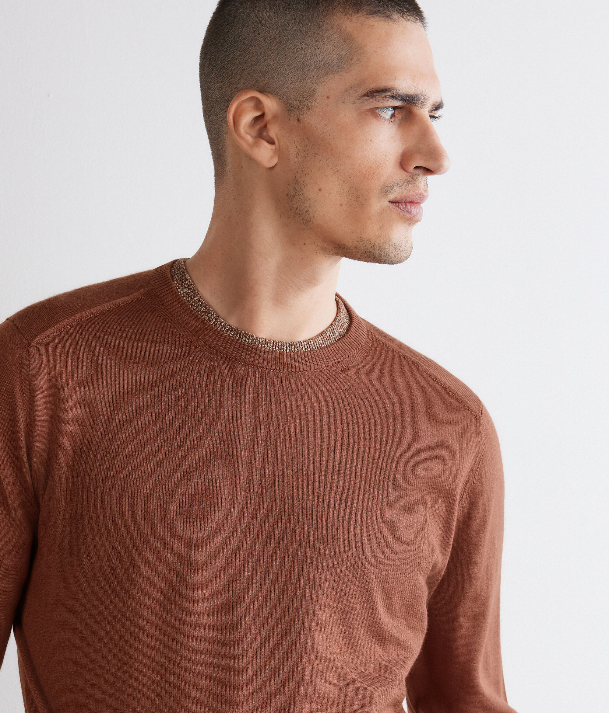 La caricia impalpable del cashmere se funde con el brillo natural de la seda en este jersey con cuello redondo de encanto esencial. El motivo de canalé de los puños y el borde aporta estructura a la prenda añadiendo un toque de carácter a su diseño depurado y minimalista. Gracias a su corte estándar, la prenda sigue con delicadeza las líneas del cuerpo dando vida a un look elegante y versátil, perfecto tanto de día como de noche.