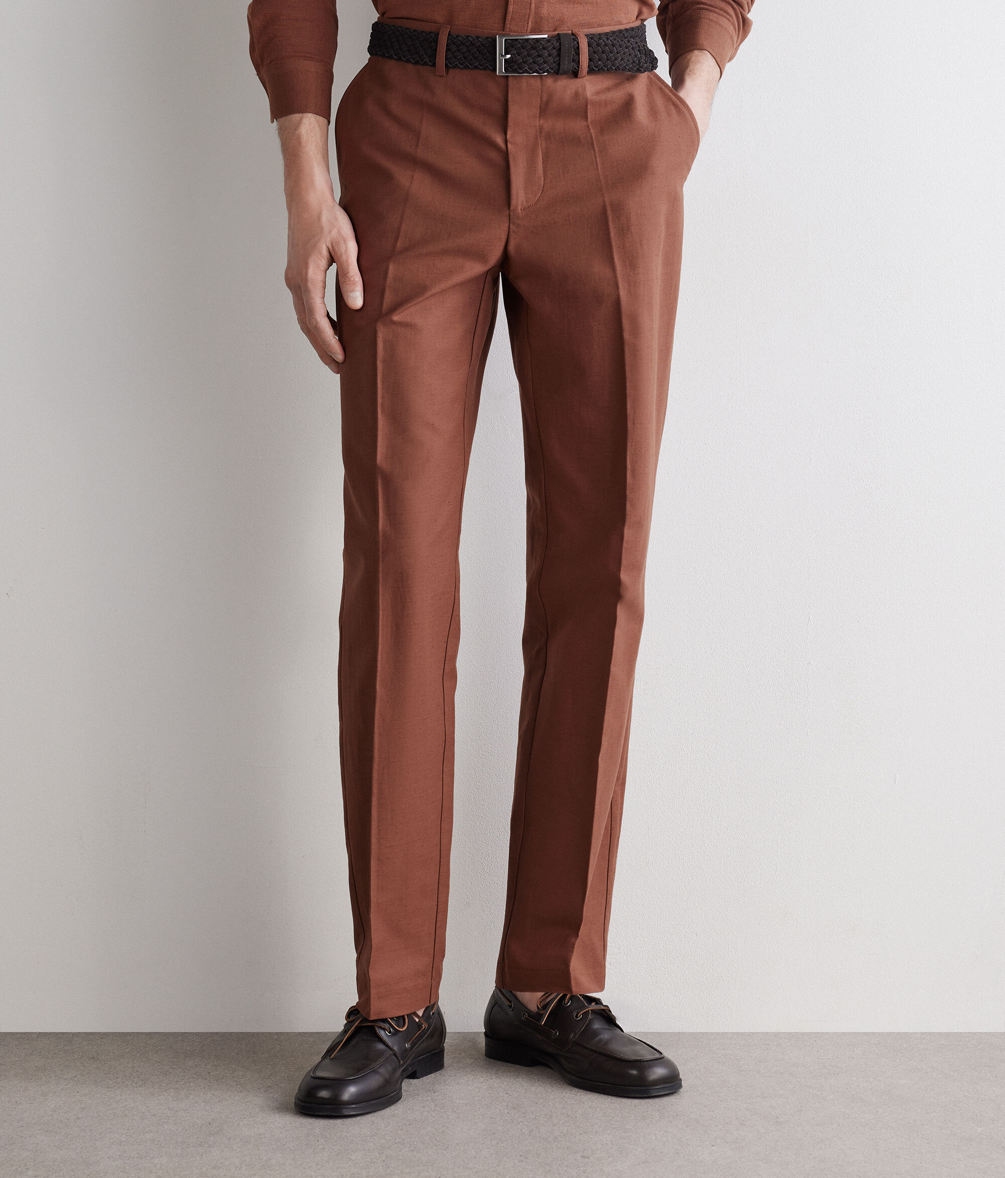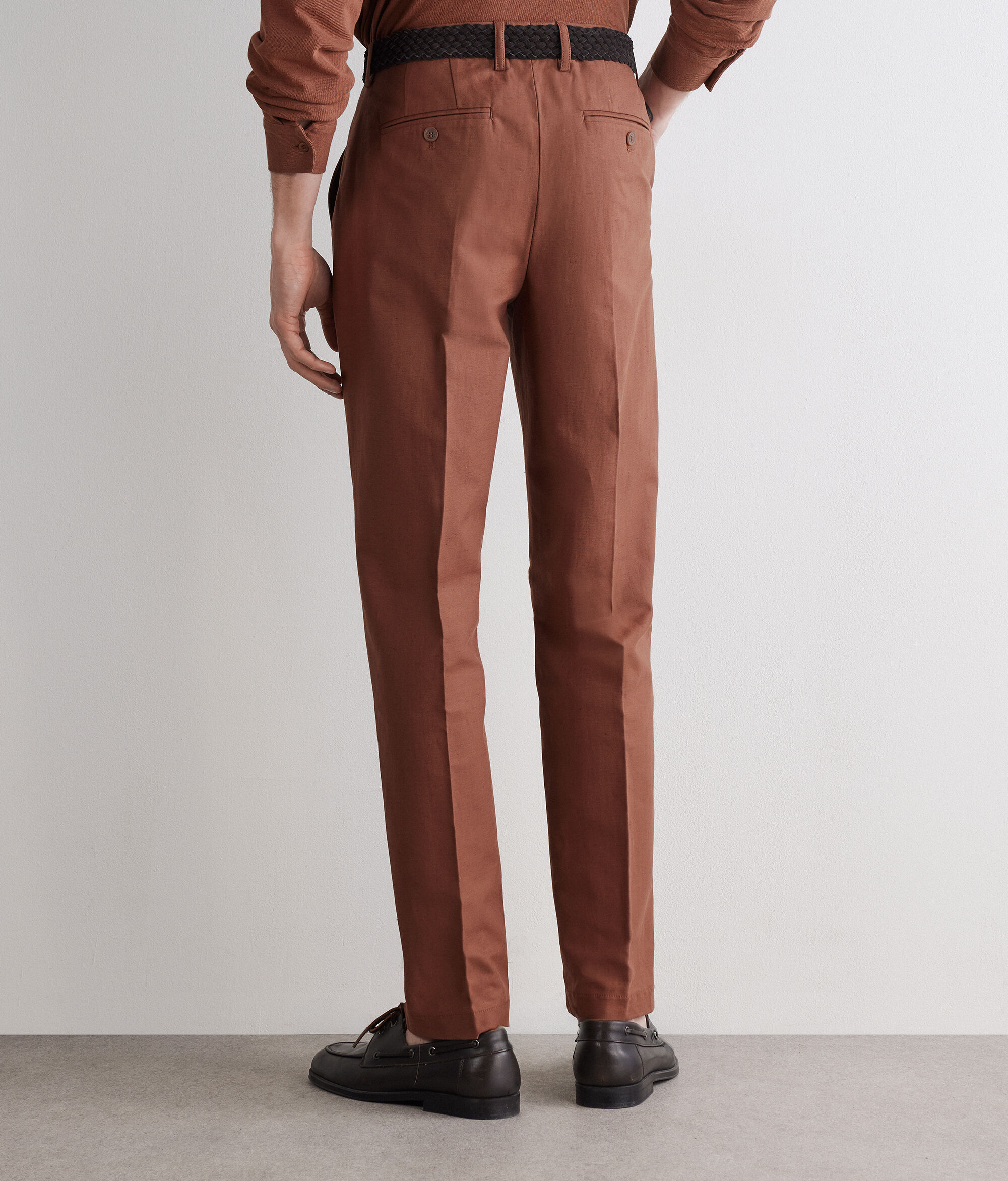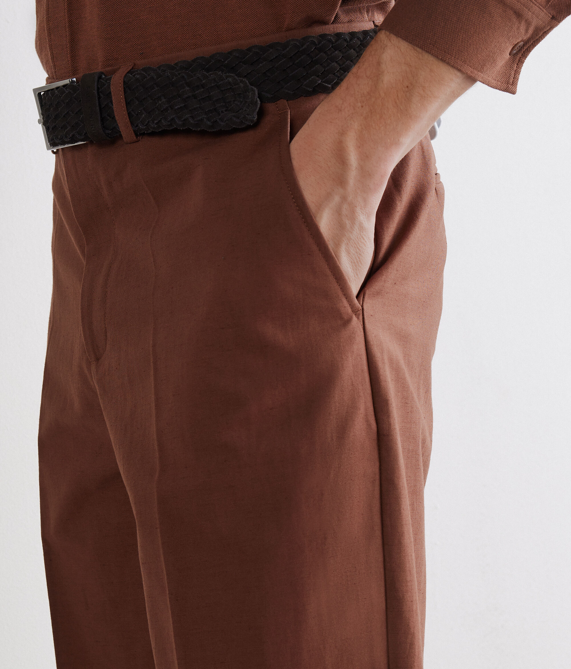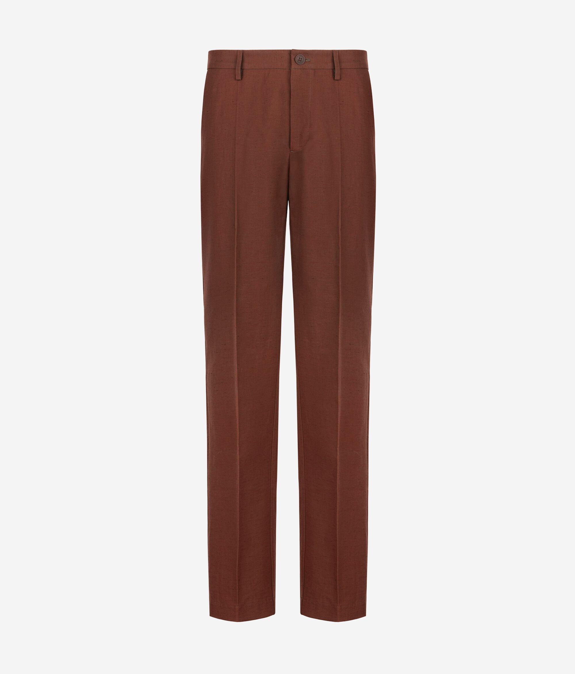 Pantalón de algodón y lino con silueta de pernera ancha. El modelo presenta cinturón con trabillas, cierre con botón y cremallera y raya central planchada para añadir un toque sartorial.