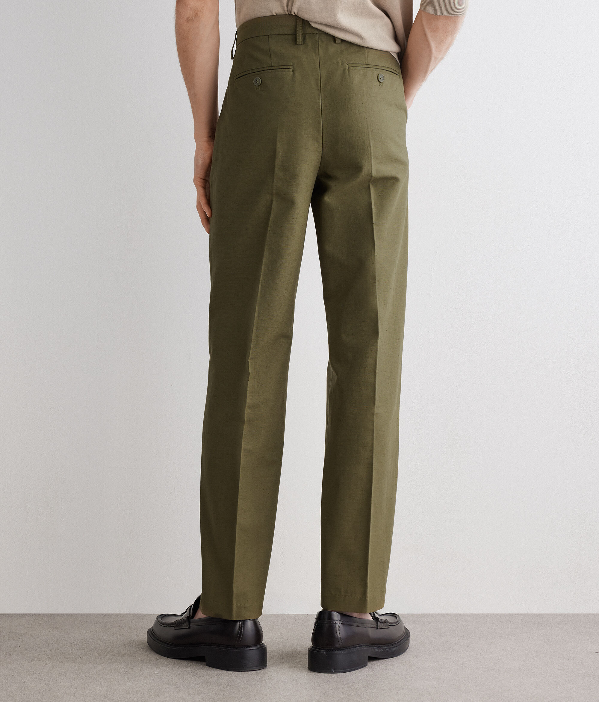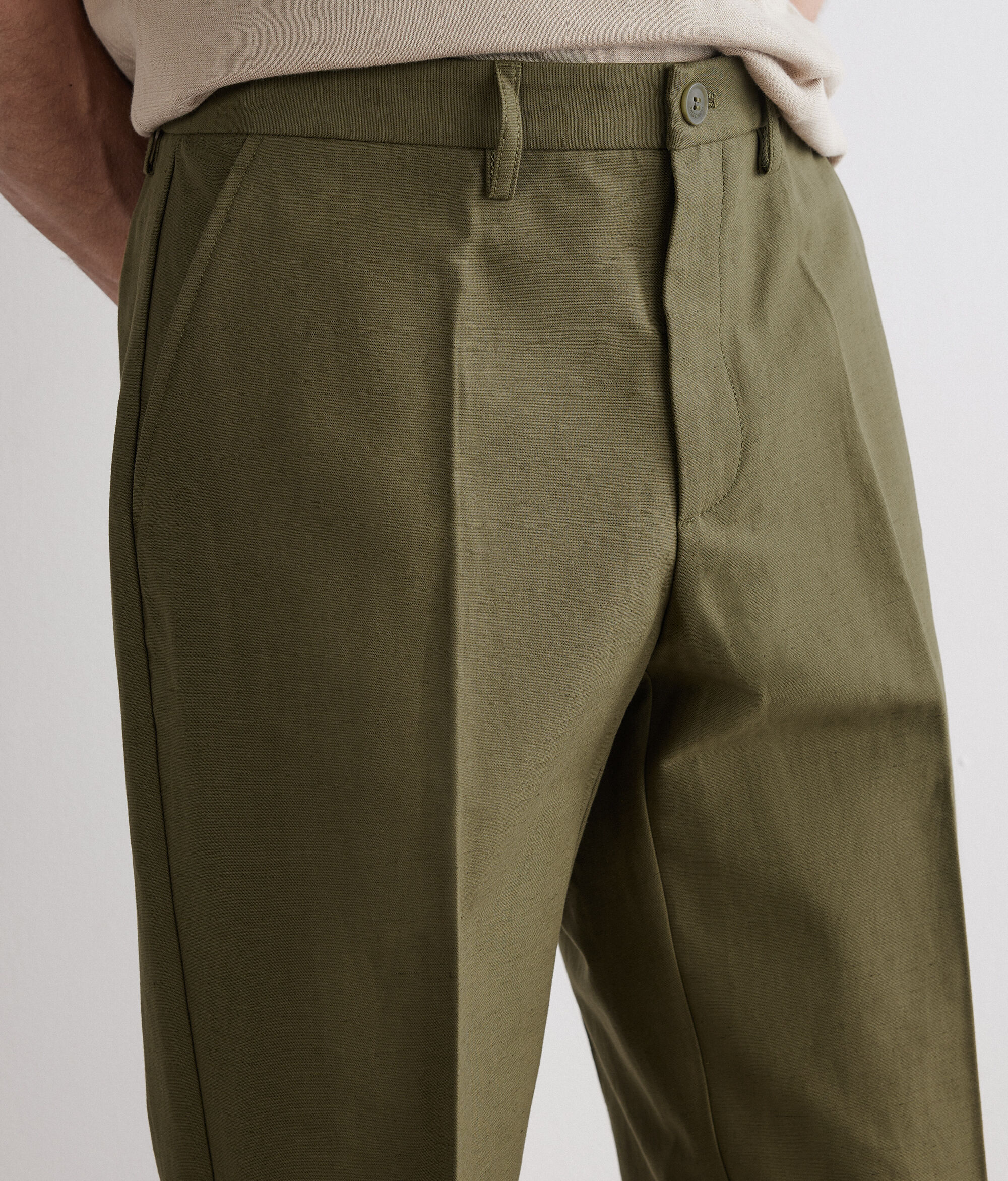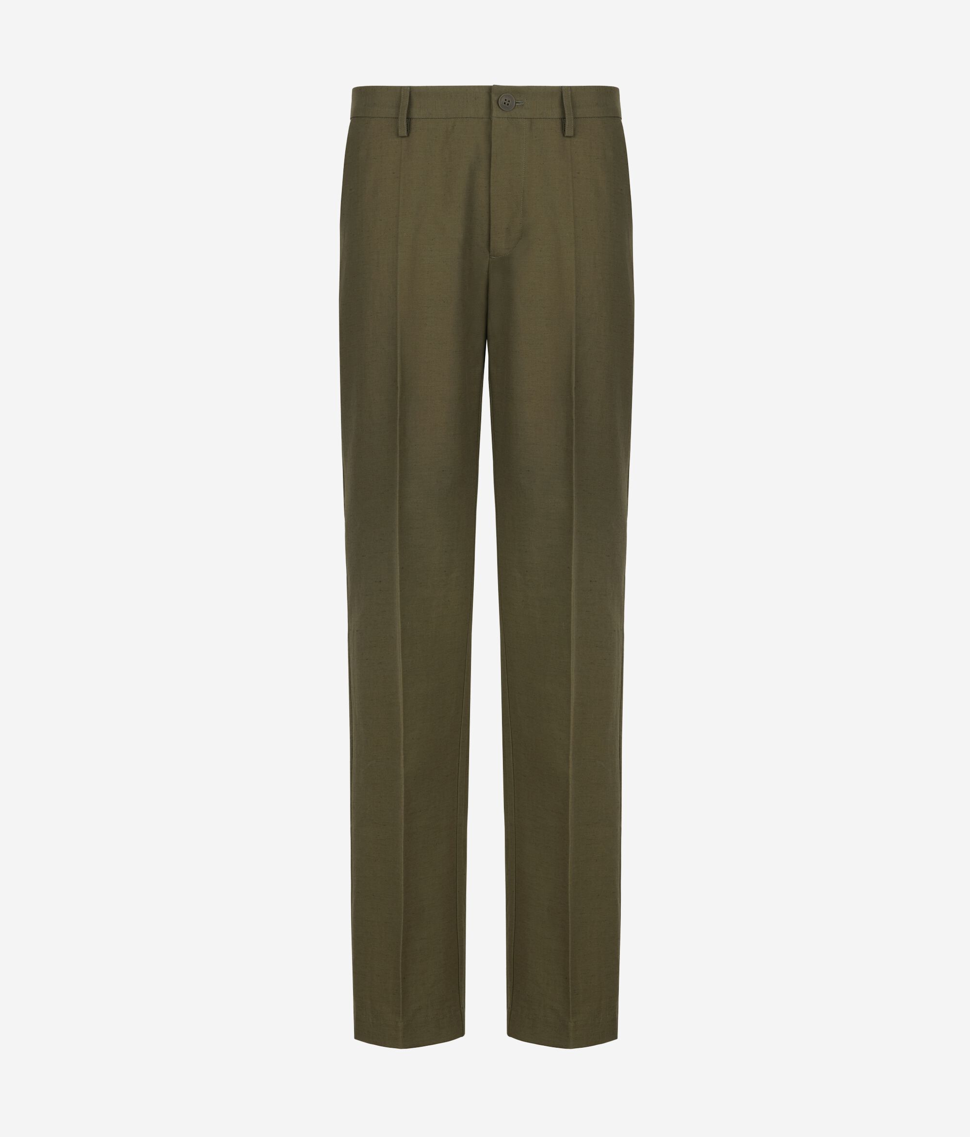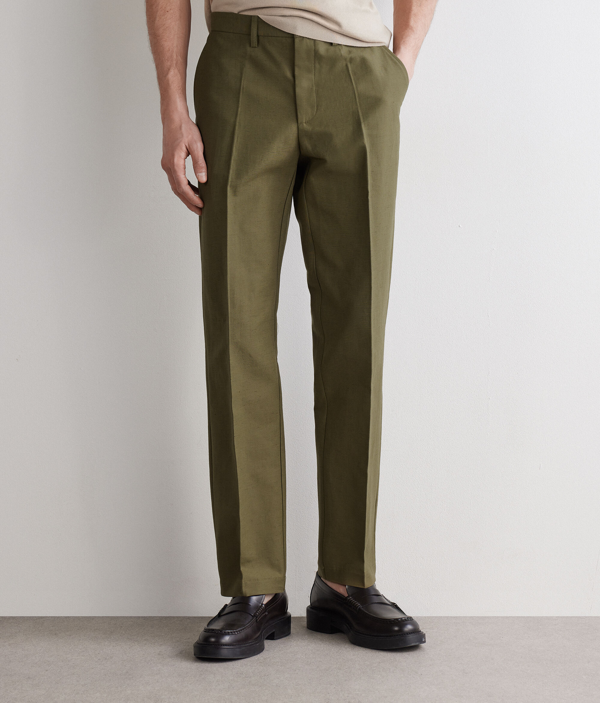 Pantalón de algodón y lino con silueta de pernera ancha. El modelo presenta cinturón con trabillas, cierre con botón y cremallera y raya central planchada para añadir un toque sartorial.