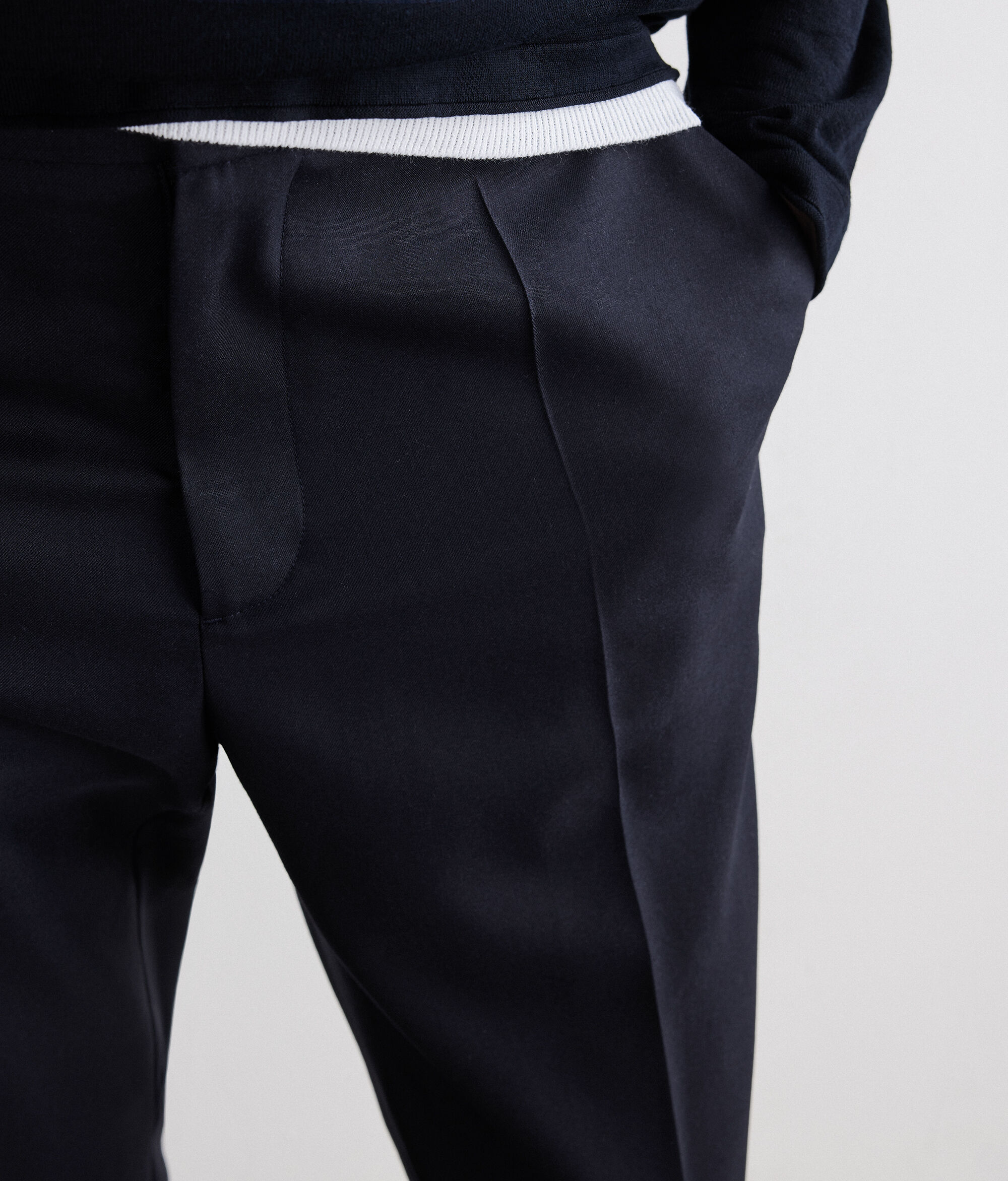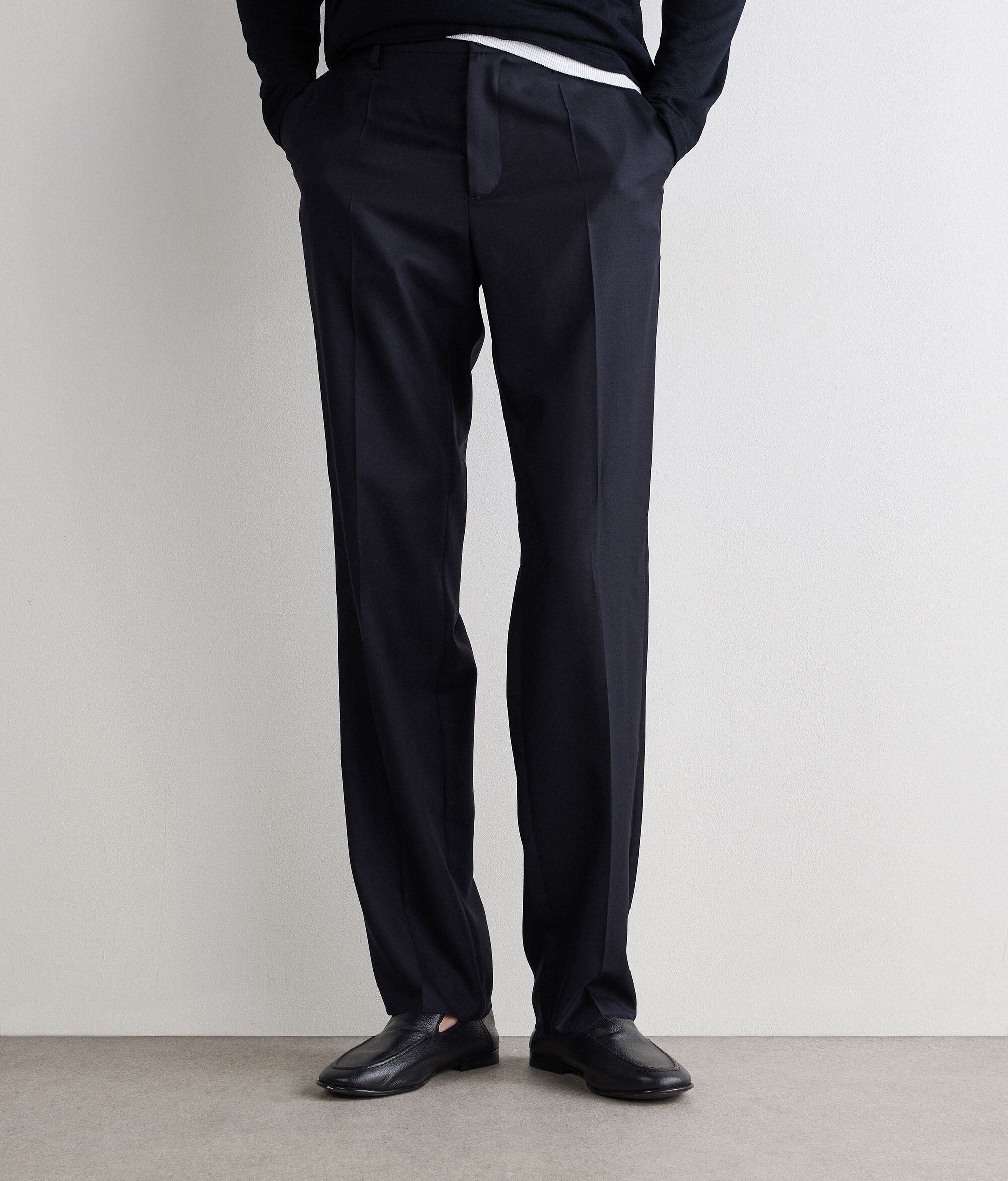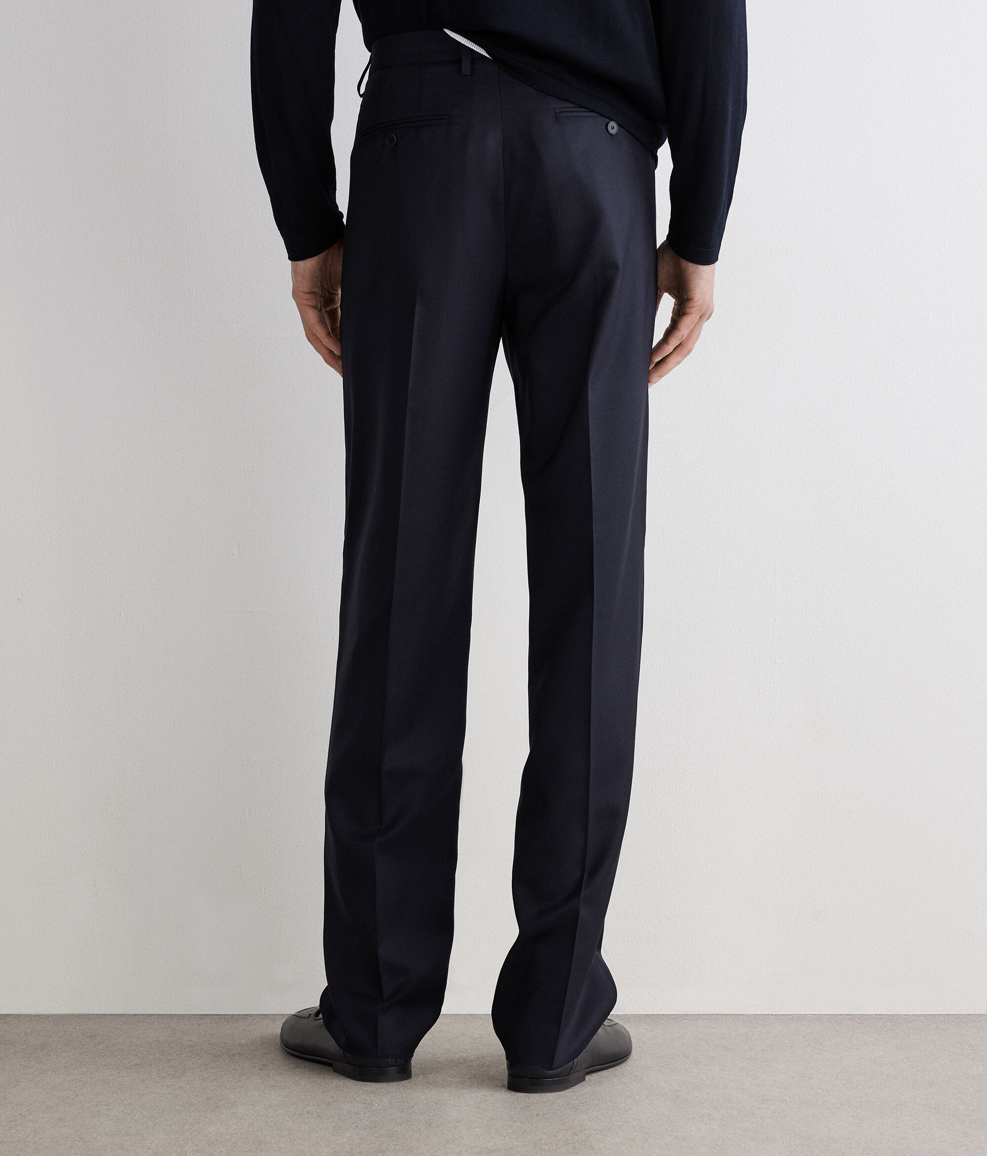 Pantalón en mezcla de cashmere y seda de alta gama, suave y de ligereza impalpable. El modelo de pernera recta define una línea esencial, realzada por la raya central planchada. El cinturón con trabillas y el cierre con botón y cremallera garantizan un cómodo corte estándar, mientras que los bolsillos franceses del delantero y los bolsillos de doble ojal de la espalda completan su diseño con detalles sofisticados.