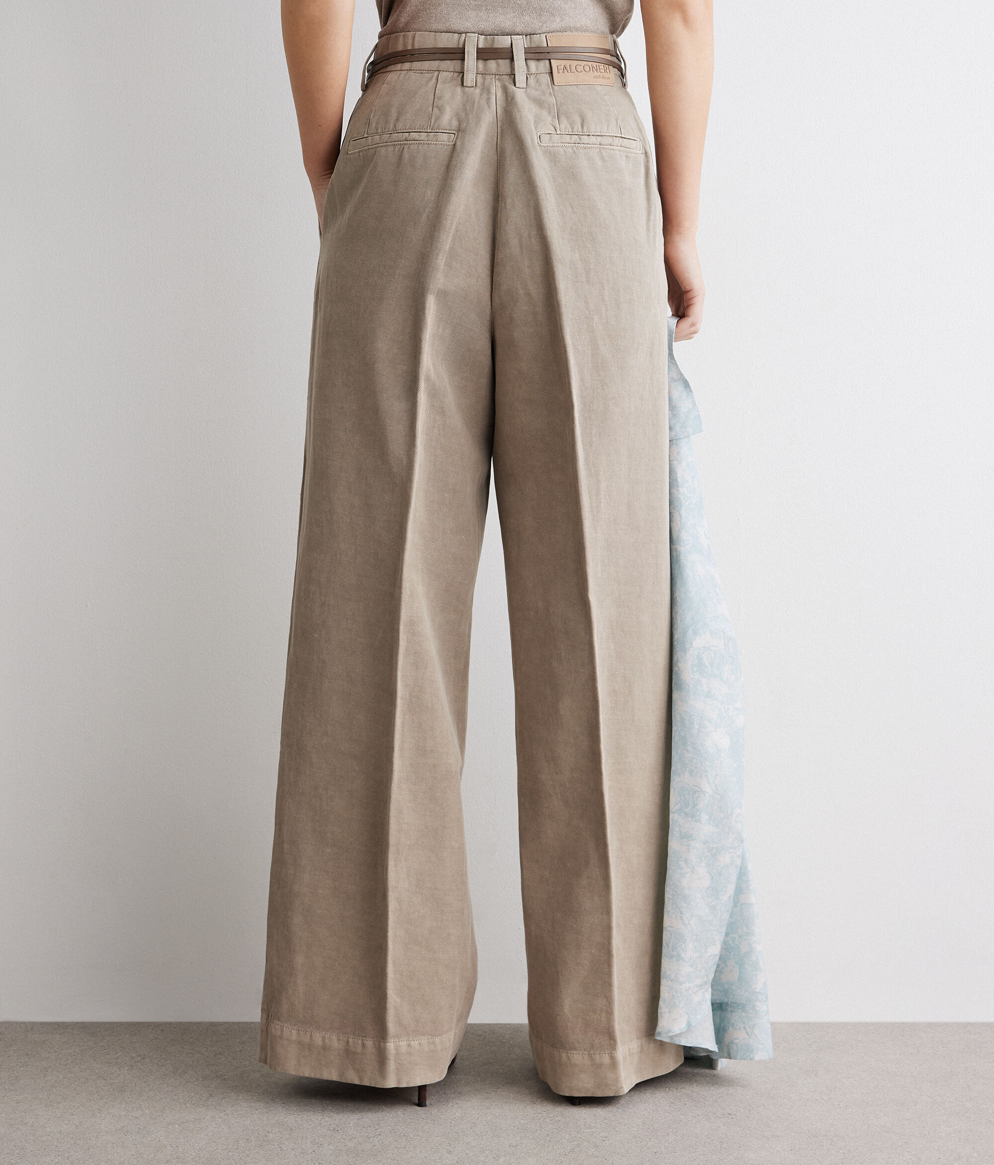 Confeccionado en algodón y lino, este pantalón palazzo con pinzas combina diseño y fluidez en una silueta sofisticada. La cinturilla con trabillas y el elástico de la espalda garantizan el máximo confort y un corte natural, mientras que el cierre con cremallera, tapeta, contrabotón y corchete asegura un ajuste impecable. Los bolsillos franceses del delantero y los bolsillos posteriores de ojal completan la prenda con elegantes detalles sartoriales.