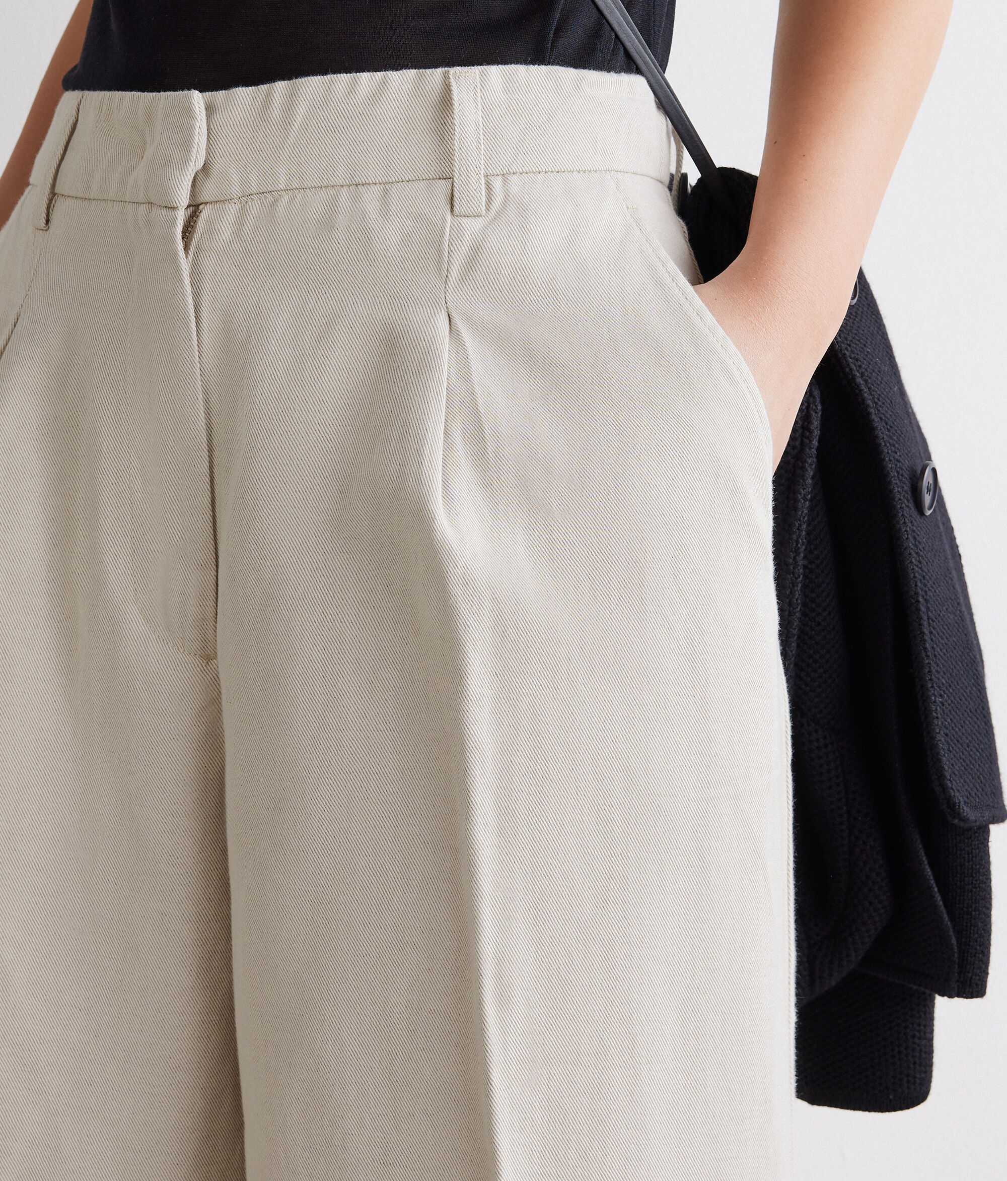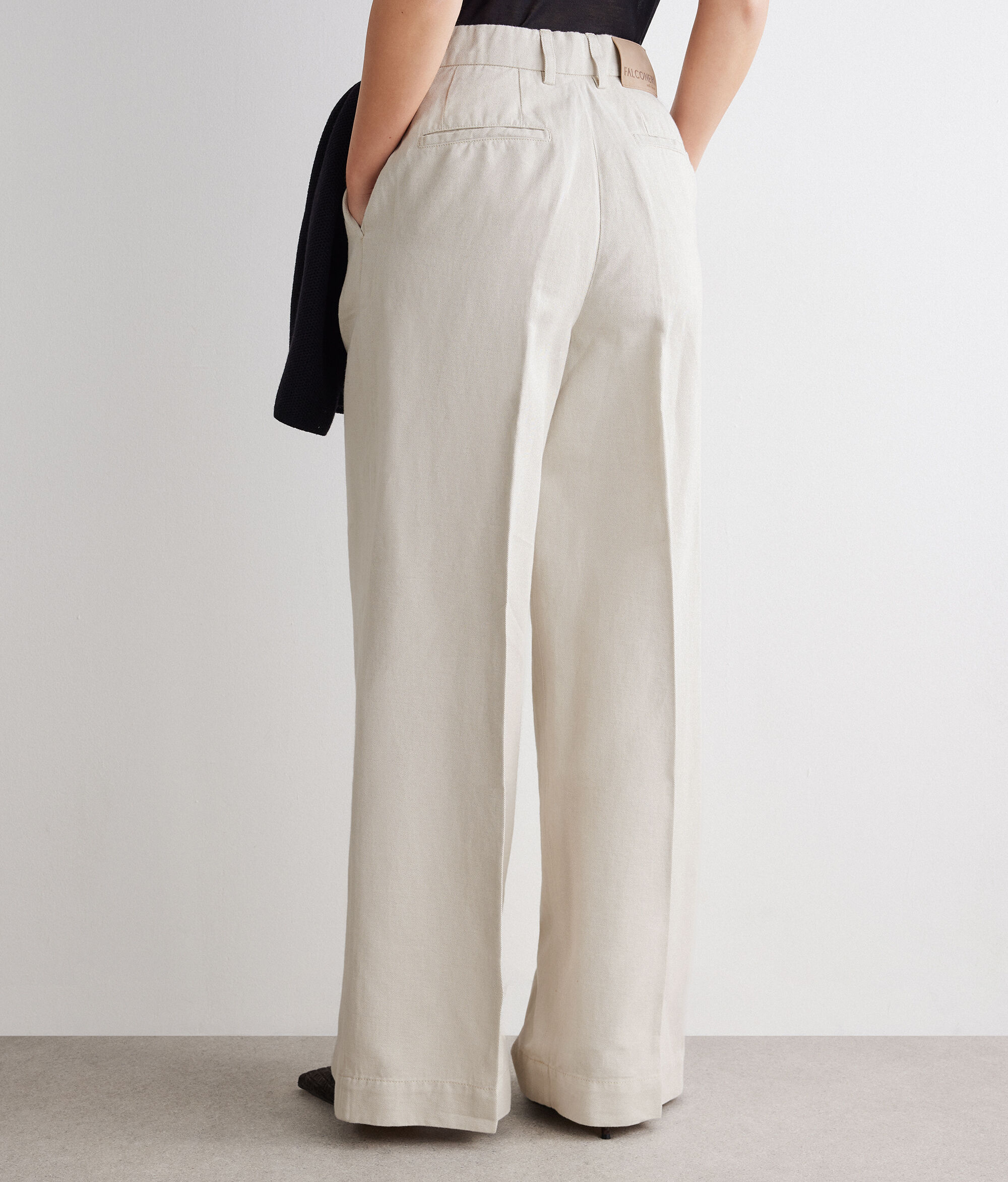 Confeccionado en algodón y lino, este pantalón palazzo con pinzas combina diseño y fluidez en una silueta sofisticada. La cinturilla con trabillas y el elástico de la espalda garantizan el máximo confort y un corte natural, mientras que el cierre con cremallera, tapeta, contrabotón y corchete asegura un ajuste impecable. Los bolsillos franceses del delantero y los bolsillos posteriores de ojal completan la prenda con elegantes detalles sartoriales.