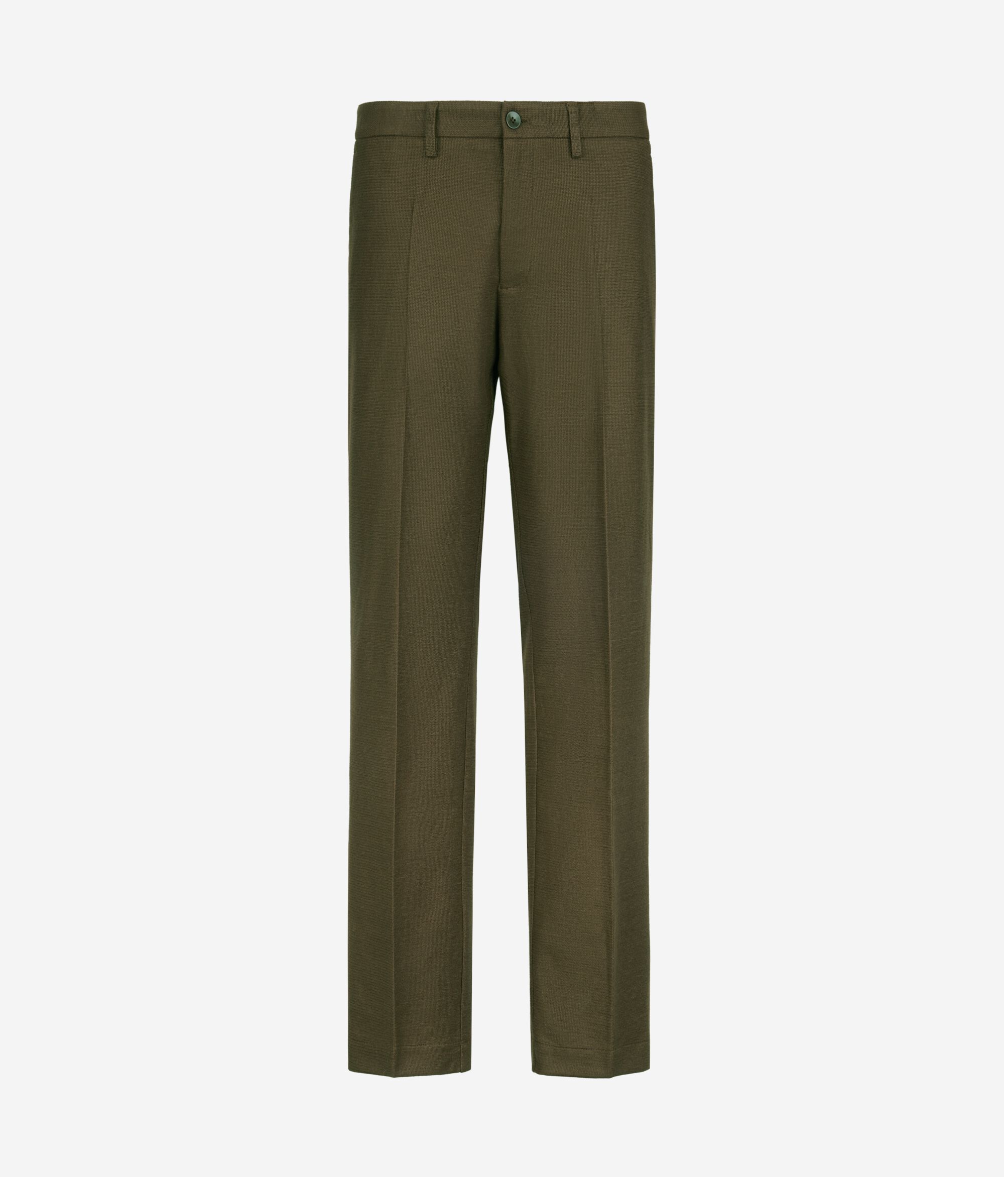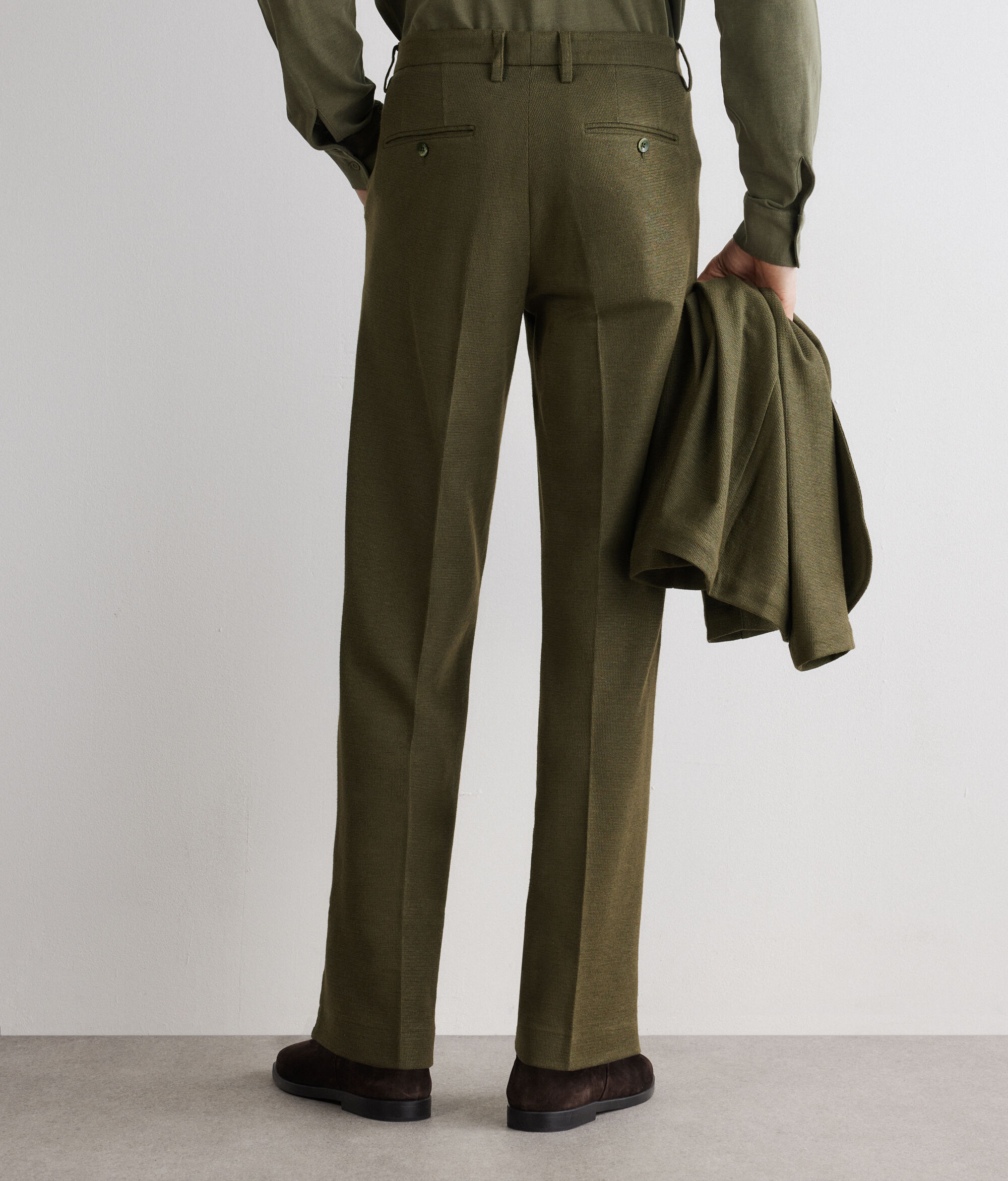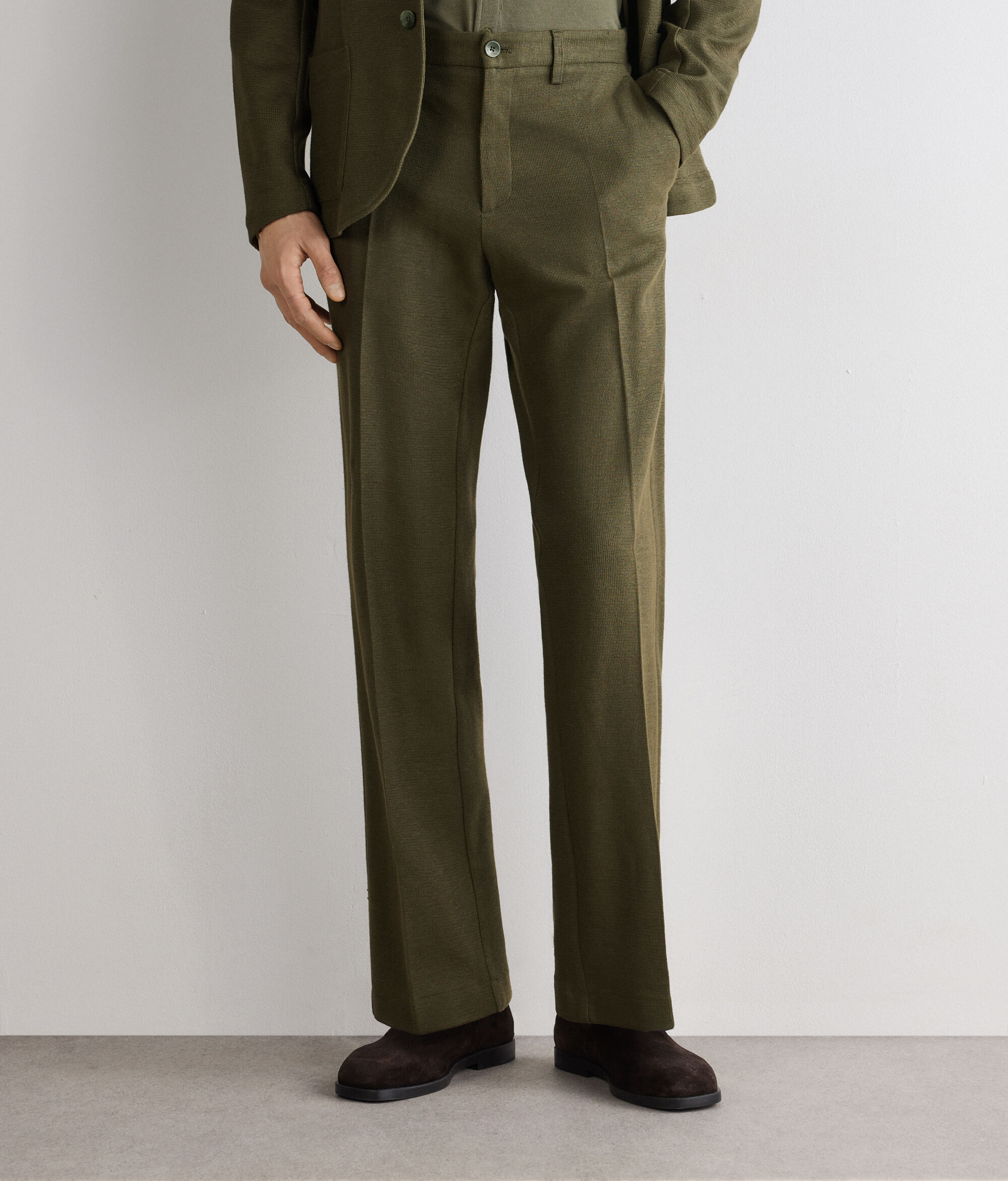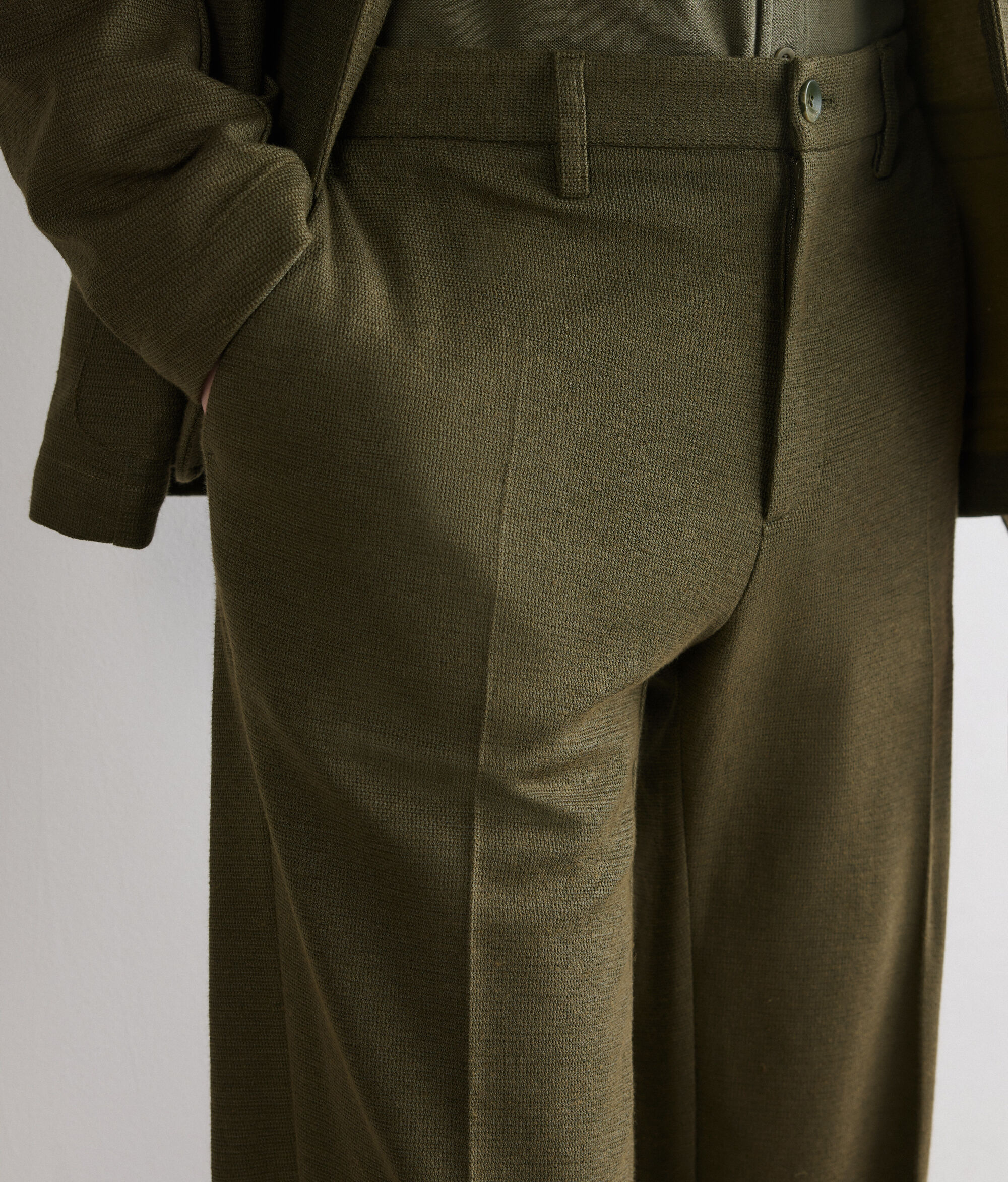 Confeccionado en tejido waffle de lino y algodón, este pantalón de pernera recta presenta una efecto texturizado que añade profundidad y carácter a cualquier conjunto. El cinturón con trabillas y el cierre con cremallera y botón garantizan un ajuste impecable, mientras que los bolsillos franceses del delantero y los bolsillos traseros de doble ojal con botón añaden un detalle elegante y atemporal.