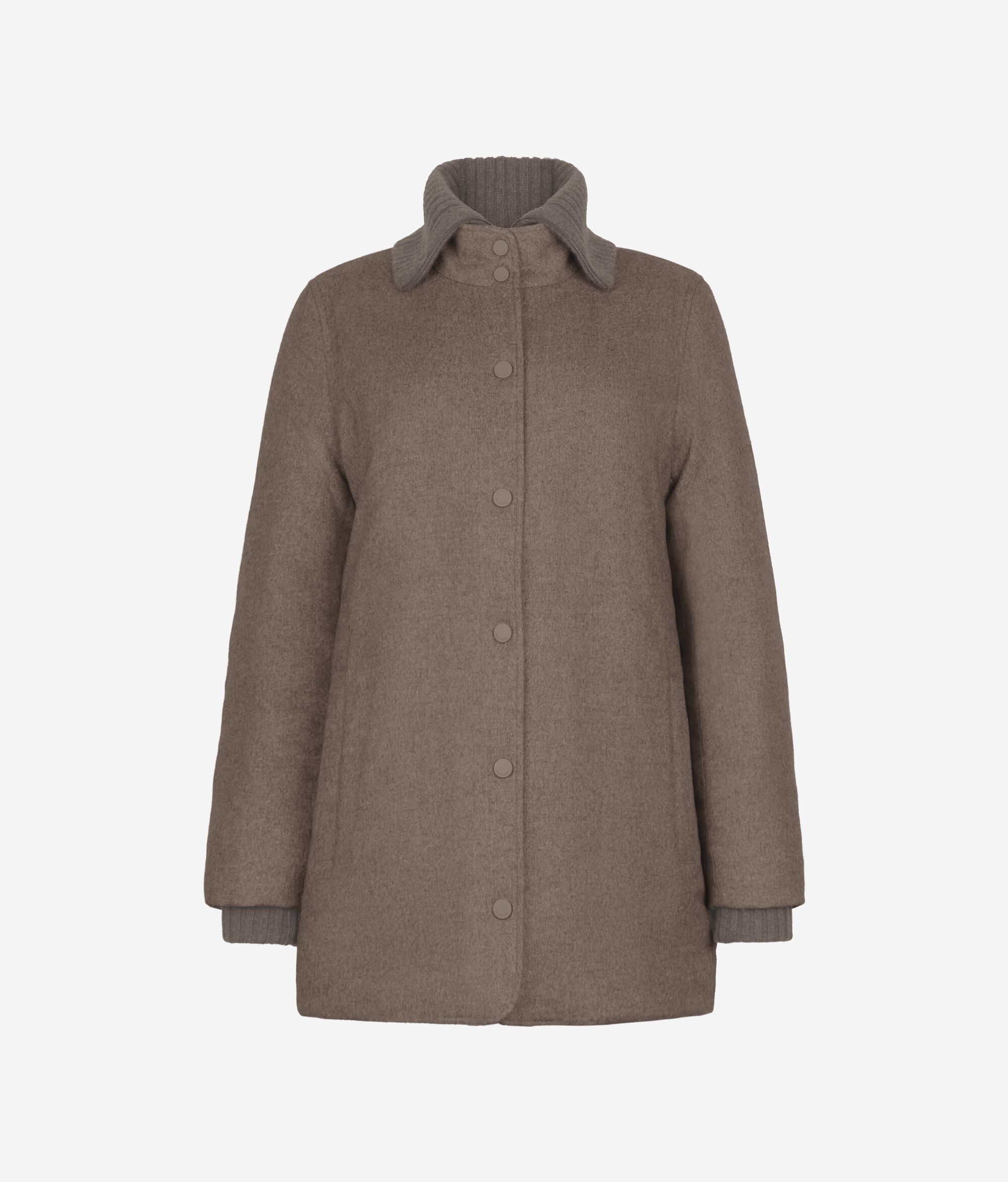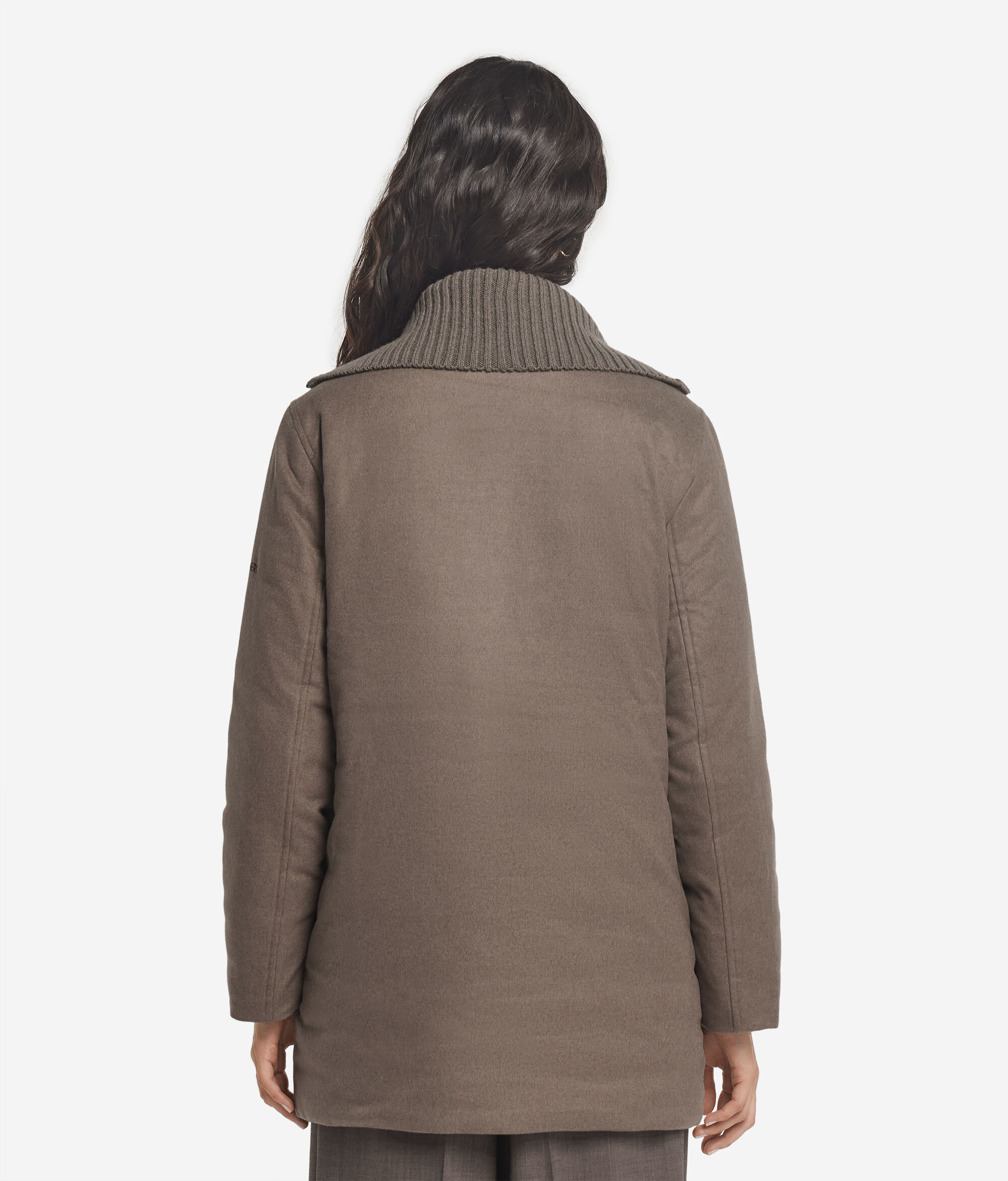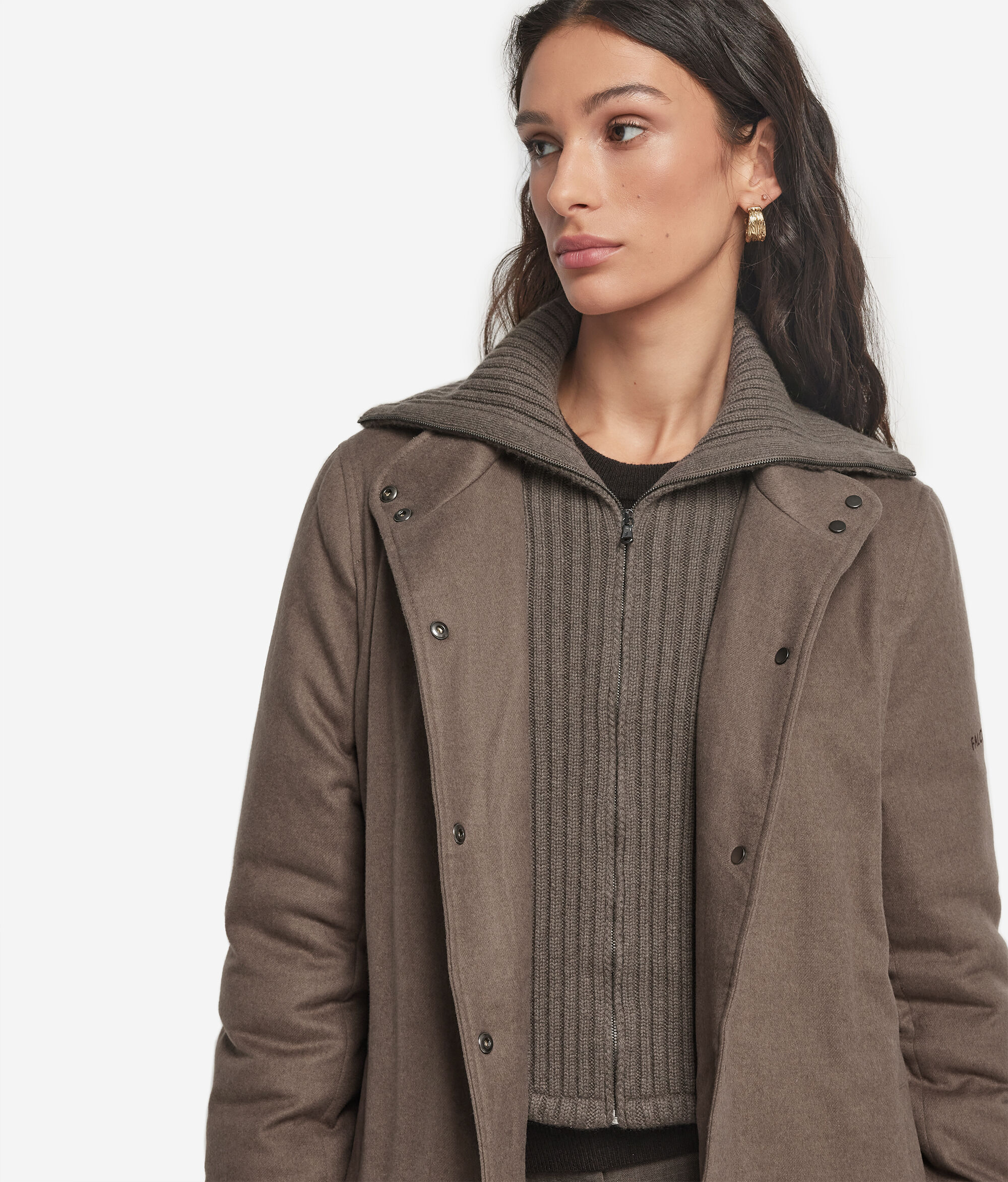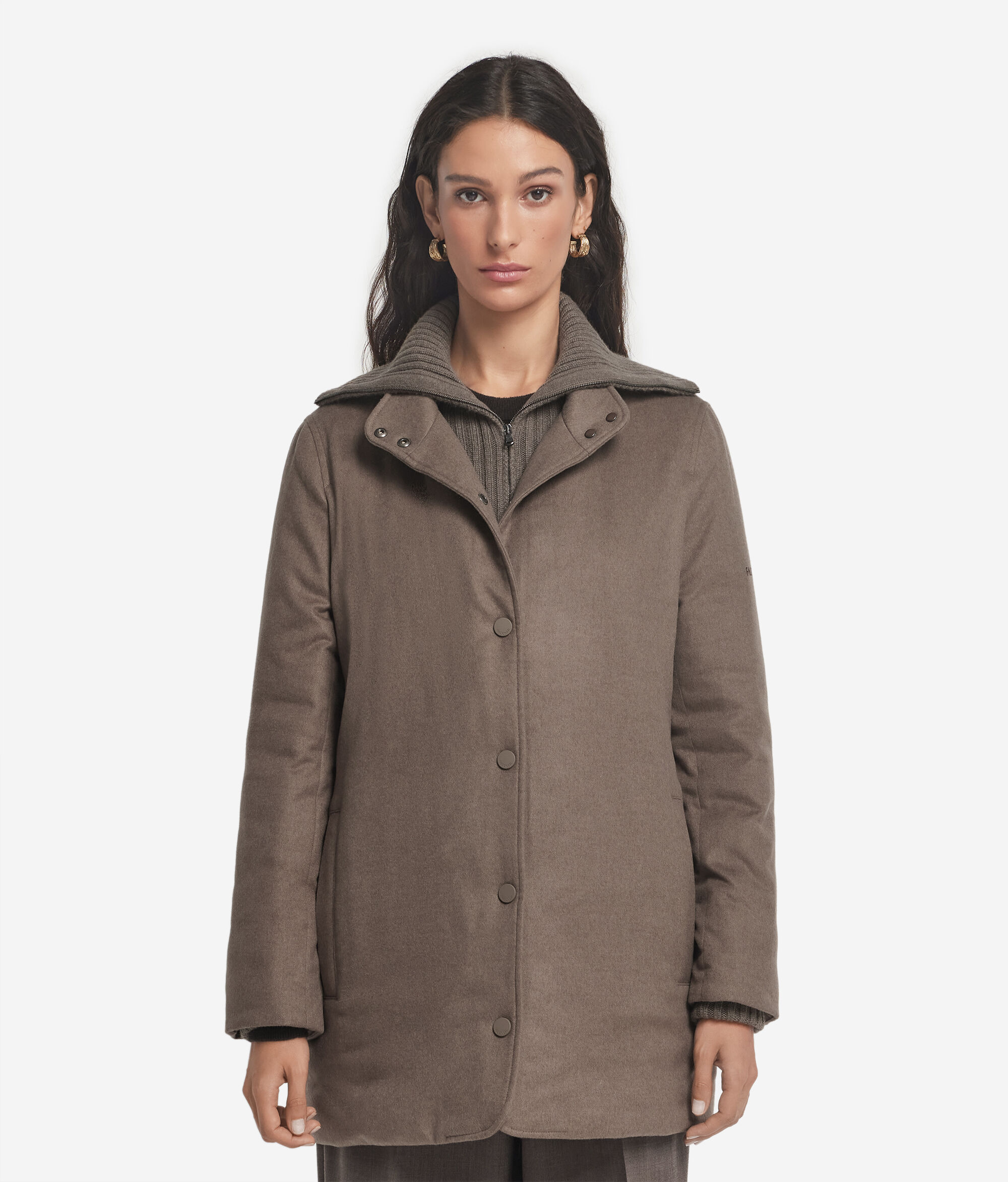 Confeccionado en una mezcla de seda y cashmere de alta gama, con interior de nailon, este plumífero ha sido concebido para combinar elegancia y protección térmica. El cuello alto de punto canalé añade un toque sofisticado, mientras que la cremallera metálica realza el diseño moderno de la prenda. Su línea holgada con hombro estándar y cierre con botones automáticos se completa con prácticos bolsillos de ojal. El largo hasta debajo de la cadera es ideal para protegerse con estilo y practicidad en los días más frescos.