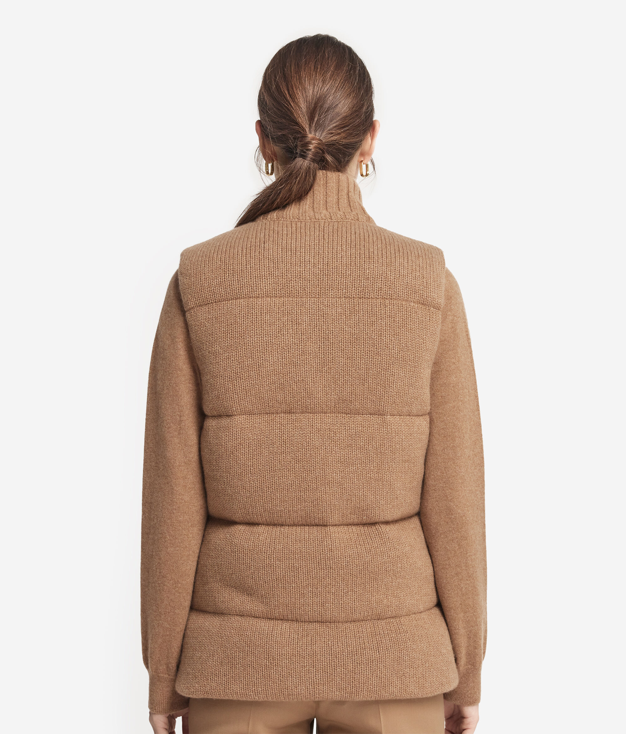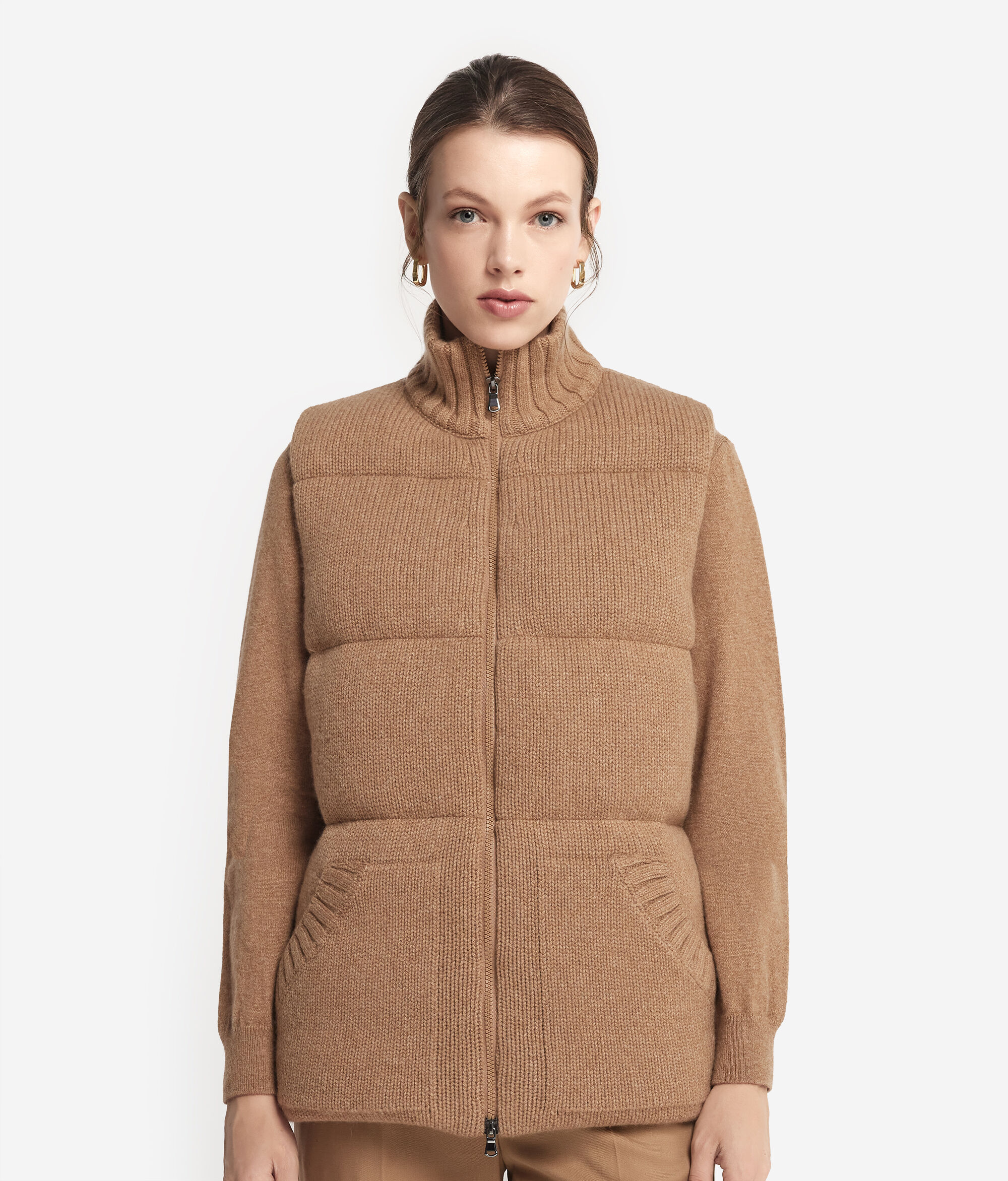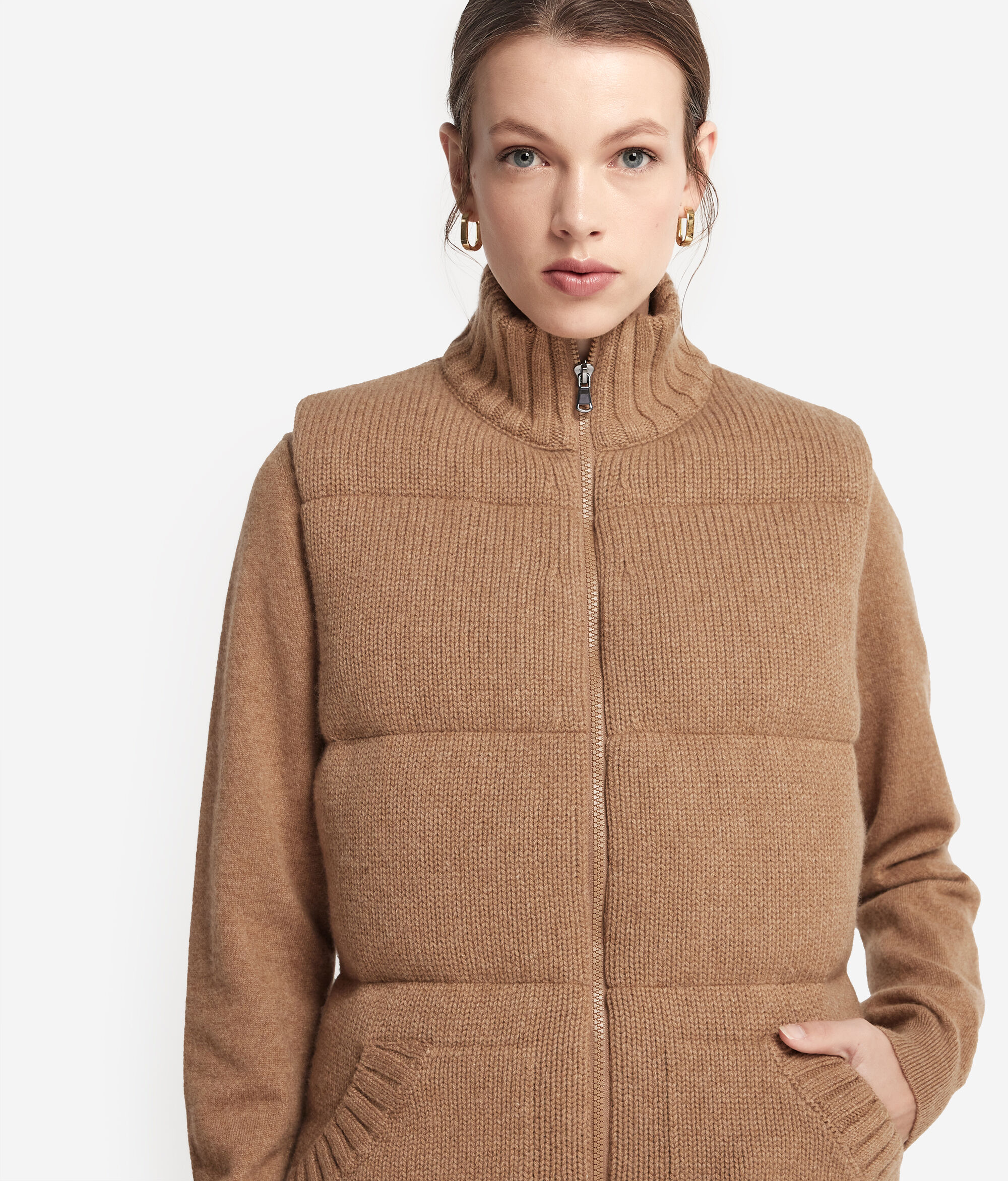 Descubre la elegancia y la delicadeza de este plumífero sin mangas. El interior, de tejido técnico, garantiza una protección óptima en las jornadas más frescas, mientras que el exterior de cashmere ultrasoft confeccionado en punto ofrece una sensación de calor envolvente. Cuenta con dos cómodos bolsillos que adornan el modelo y un cuello alto con detalle de canalé que hacen de esta una prenda exclusiva y práctica.