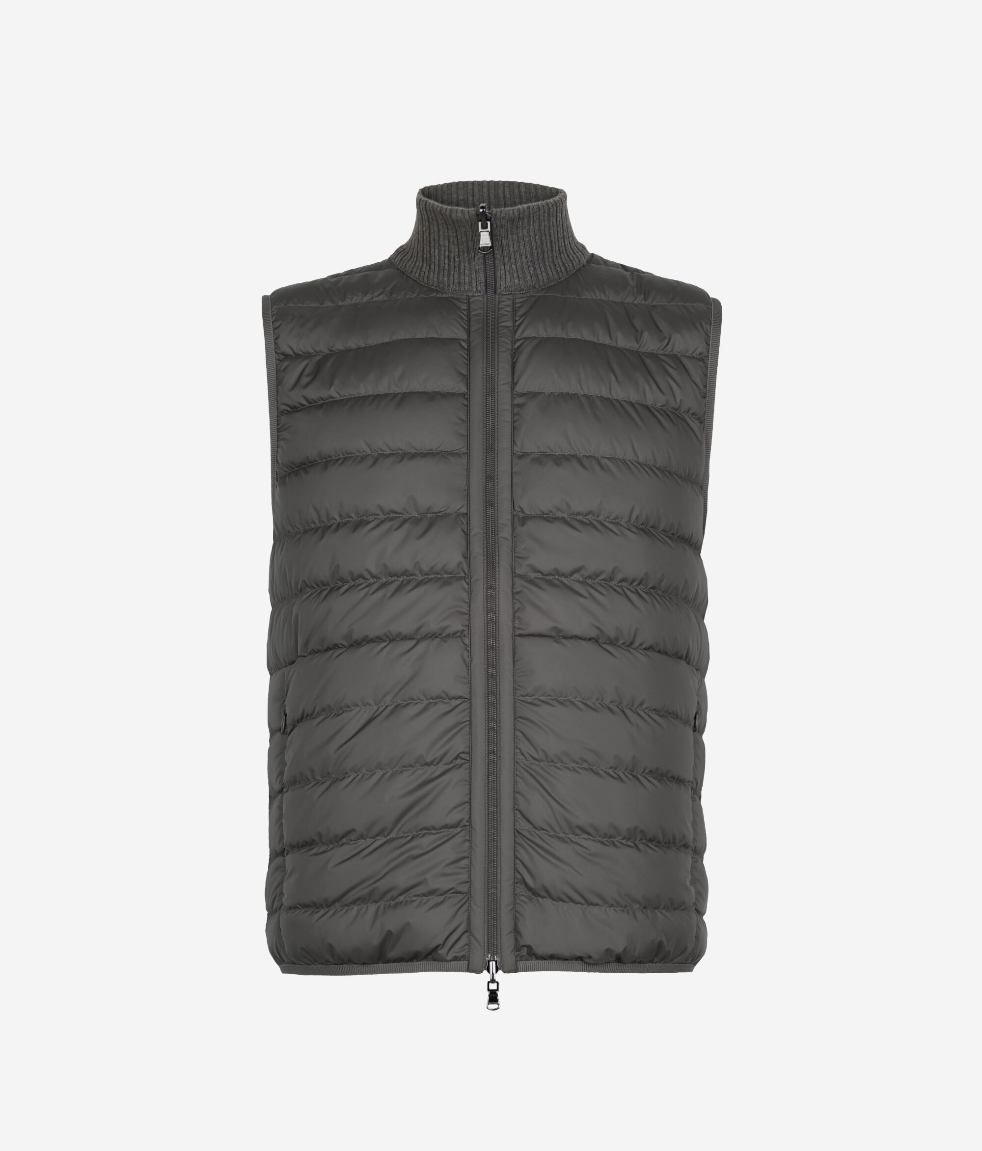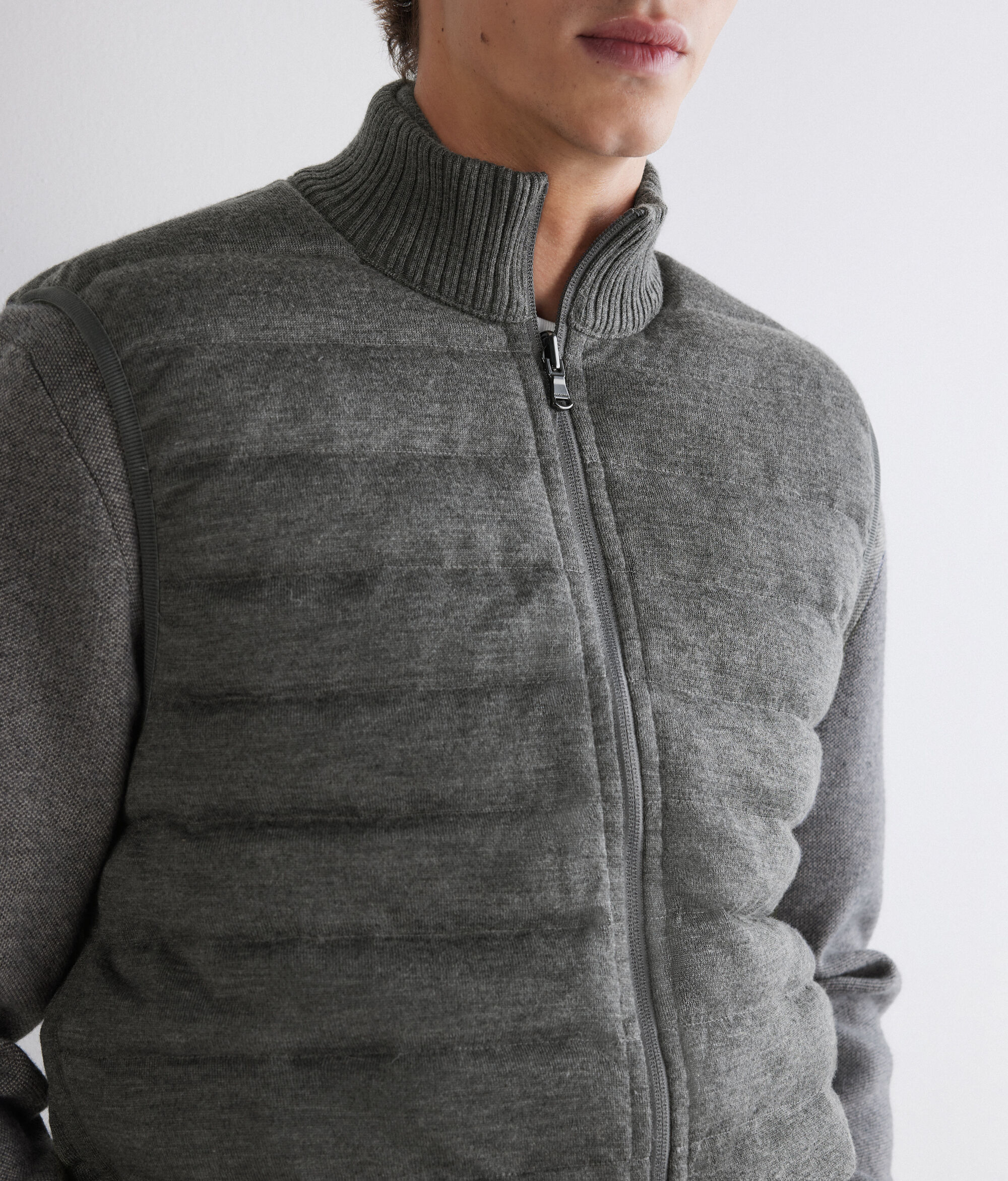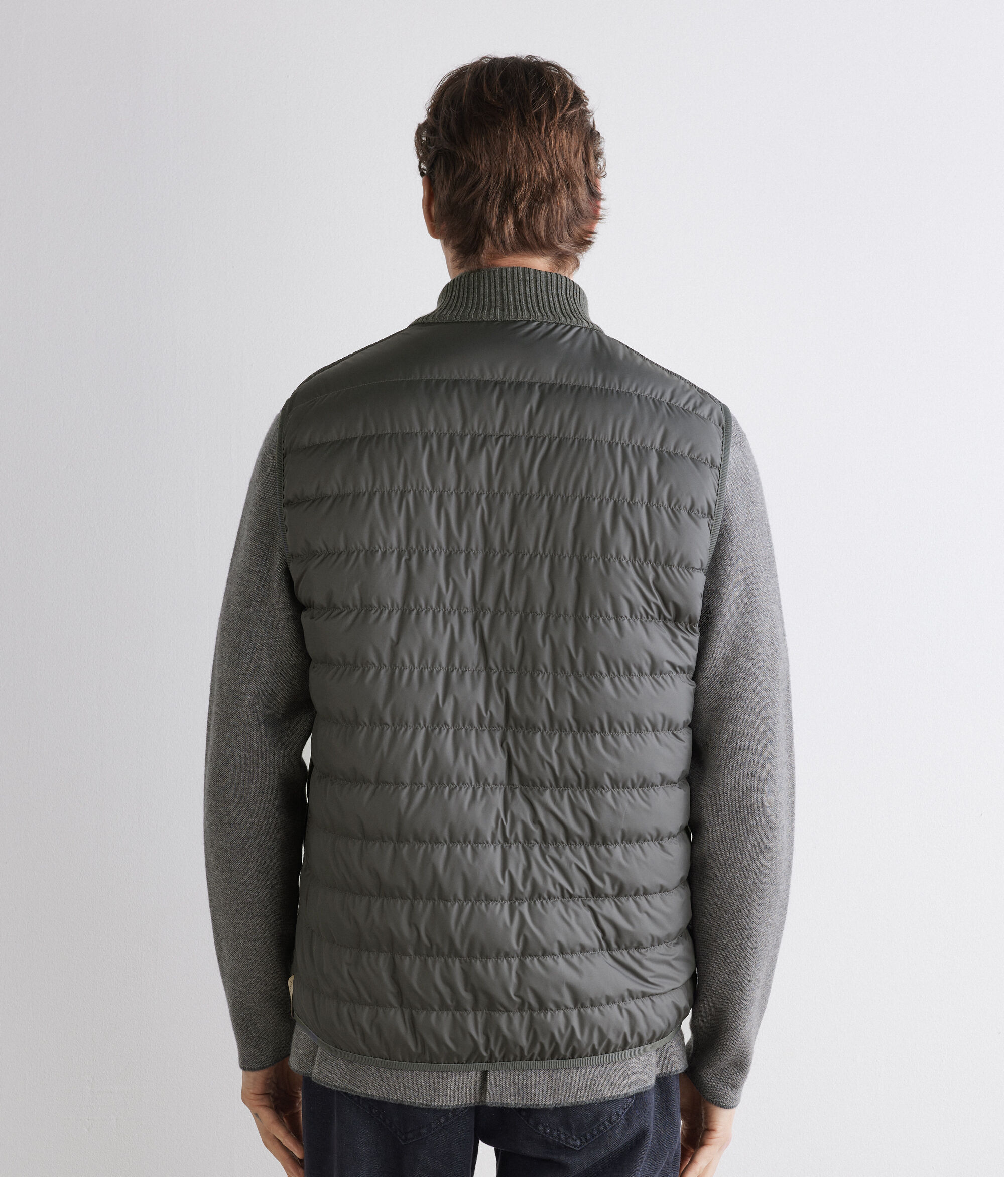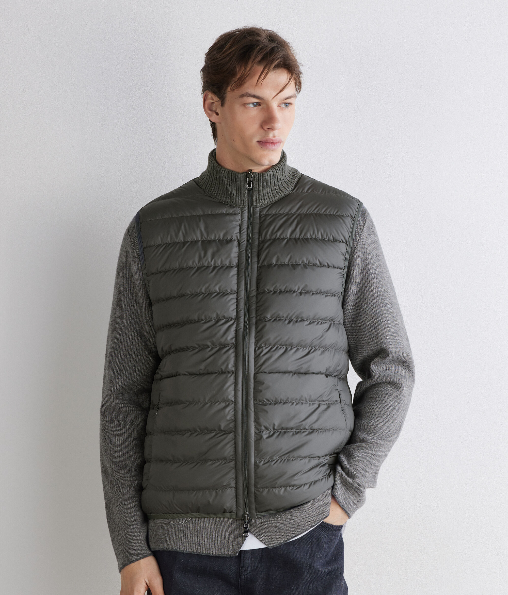 Este plumífero sin mangas reversible ofrece una mezcla perfecta de elegancia y funcionalidad. Confeccionado en tejido técnico mate por un lado y en cashmere ultrafine con punto en relieve por el otro, presenta un contraste de materiales sofisticado y contemporáneo. El cuello alto de punto de cashmere, la cremallera de doble carro y los bolsillos invisibles aportan detalles prácticos y elegantes, mientras que su corte entallado con remates de tira elástica completan su diseño elegante y versátil.