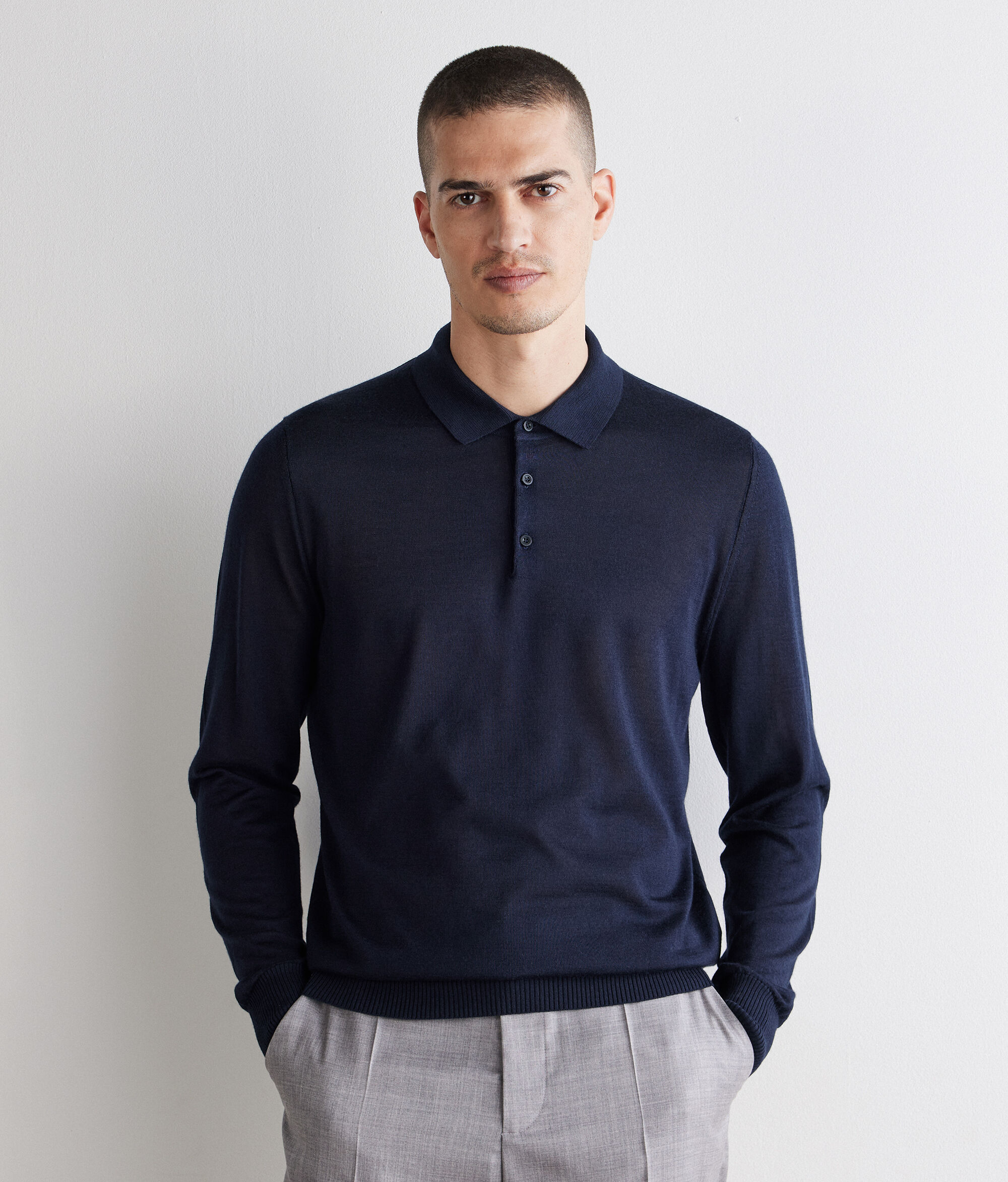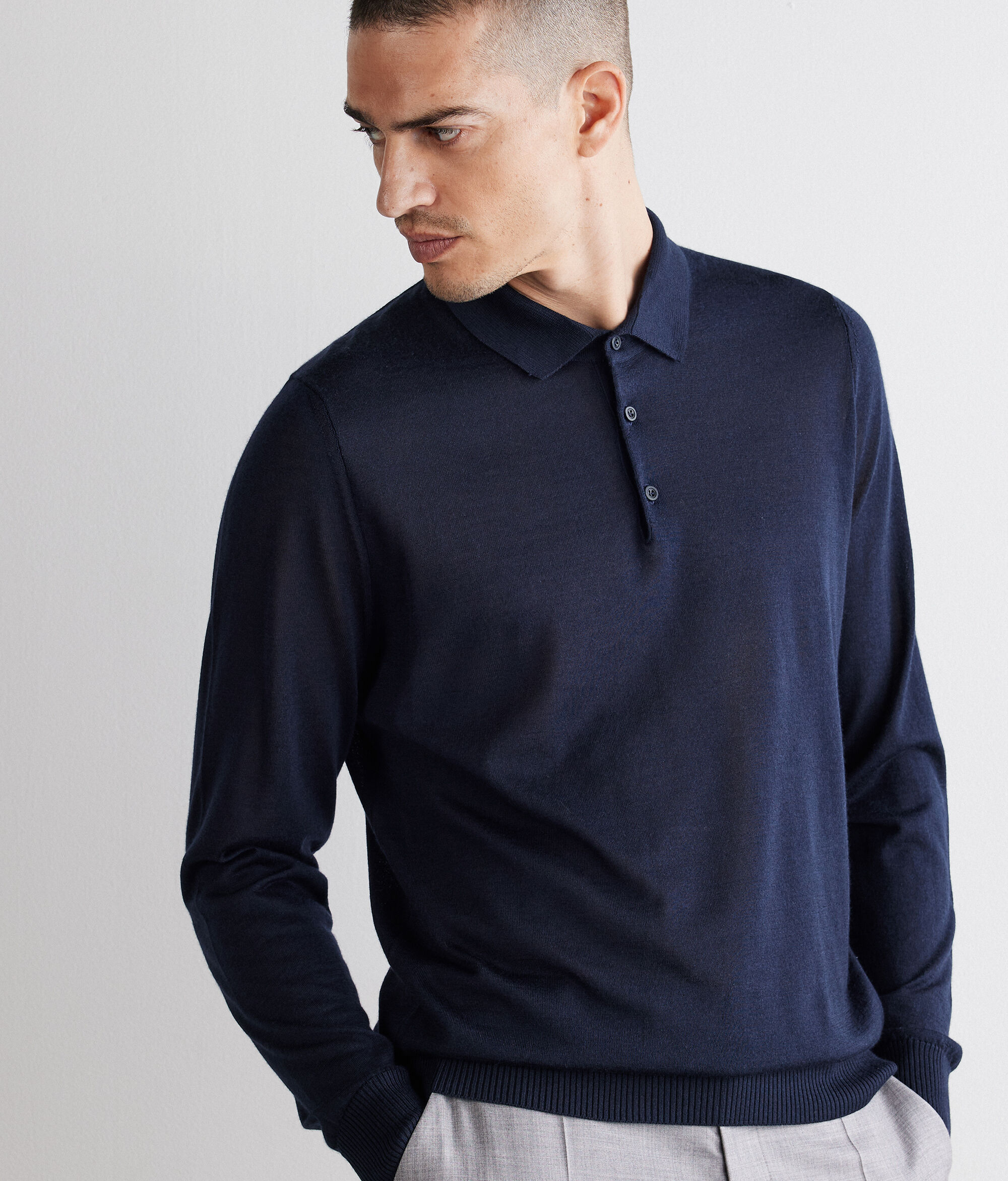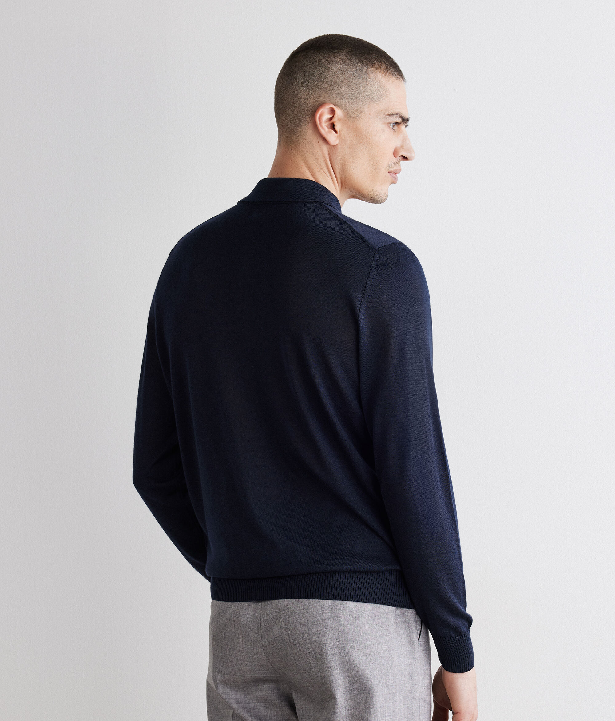 Polo esencial en cashmere y seda, de textura lisa y luminosa. De corte estándar, se distingue por el detalle del hombro en la parte delantera y es perfecto para llevarlo solo o debajo de la chaqueta.