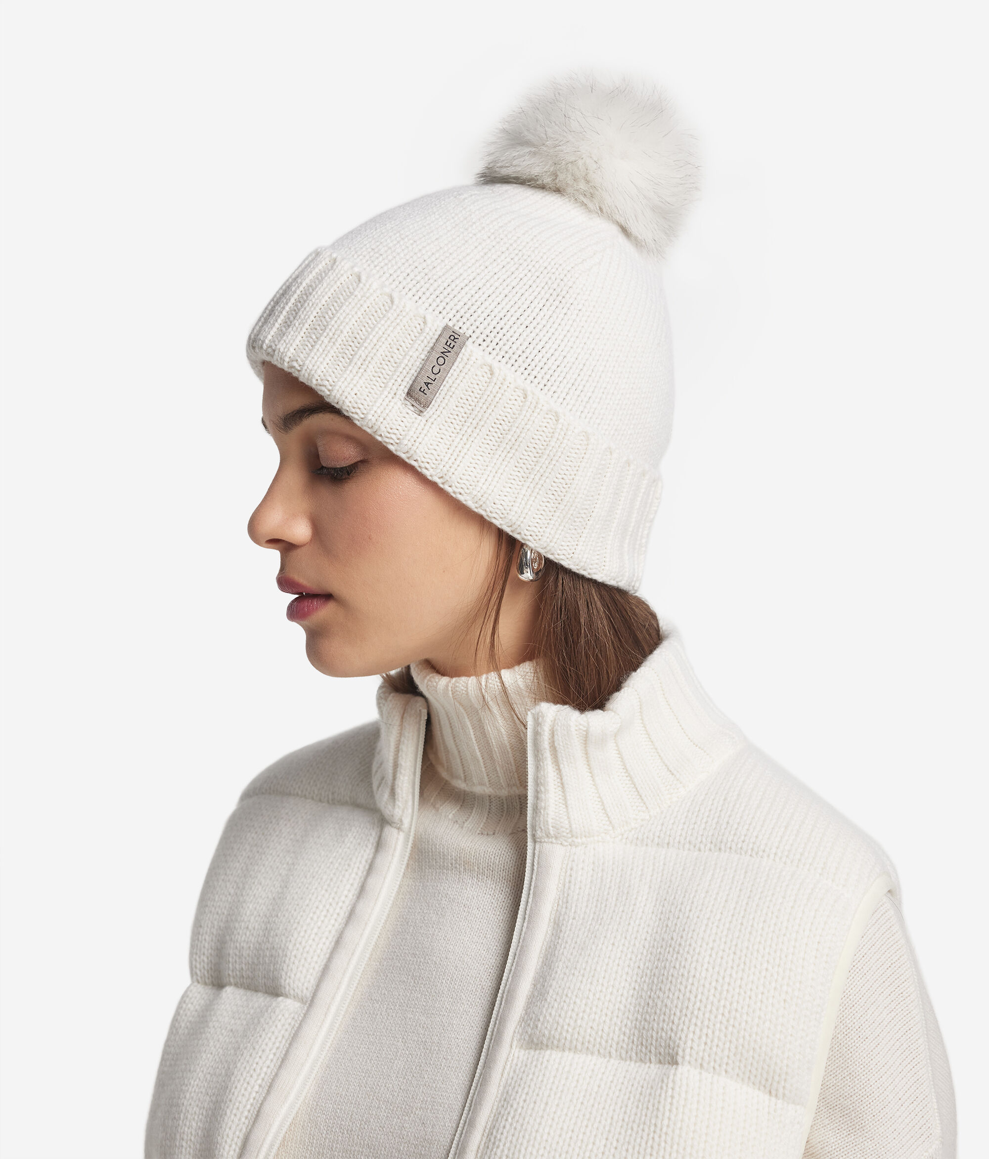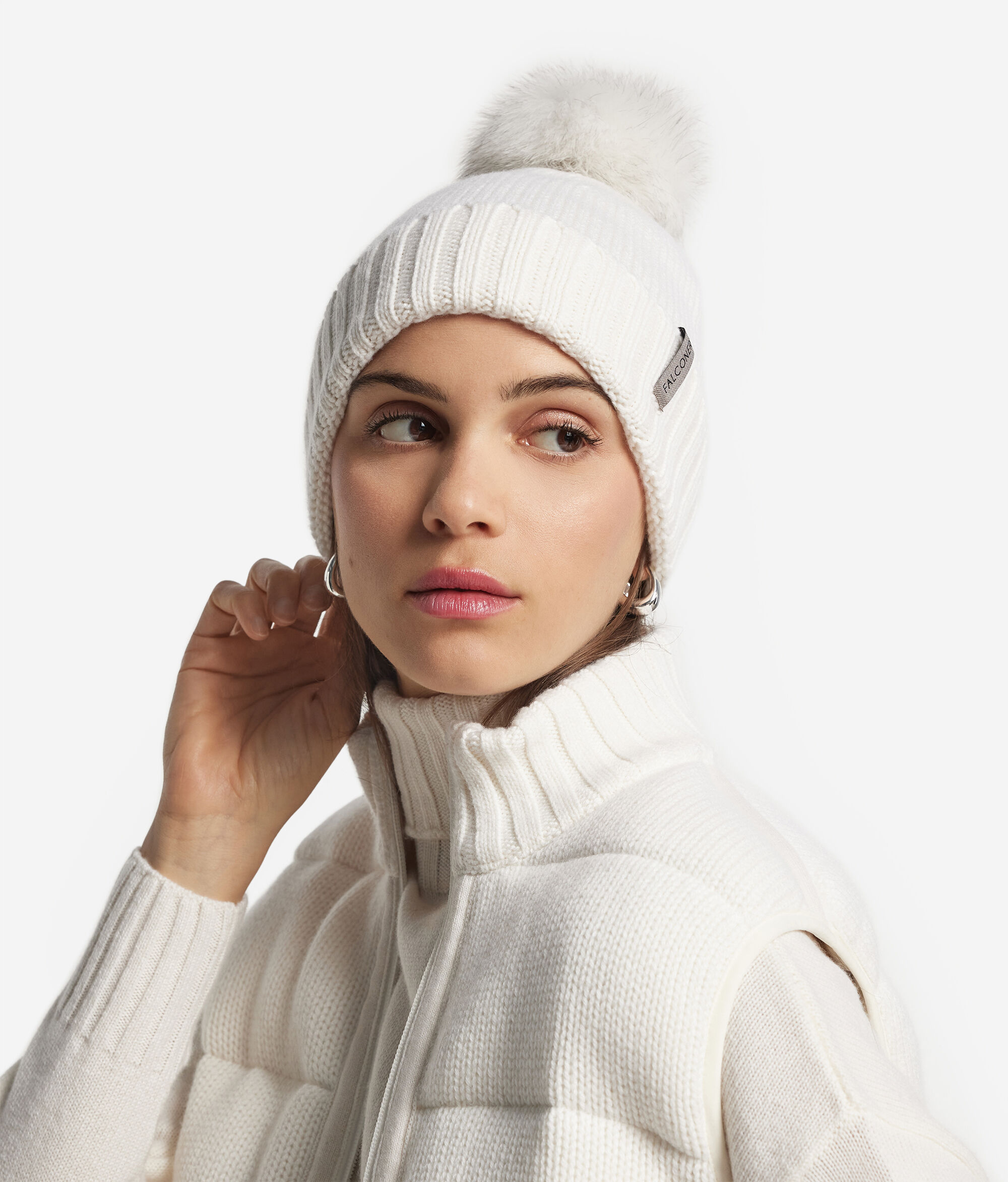Un elegante pompón de pelo de zorro auténtico embellece las líneas básicas de los gorros de punto invernales.