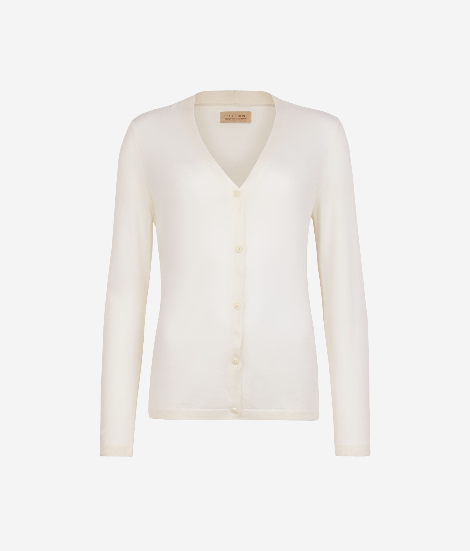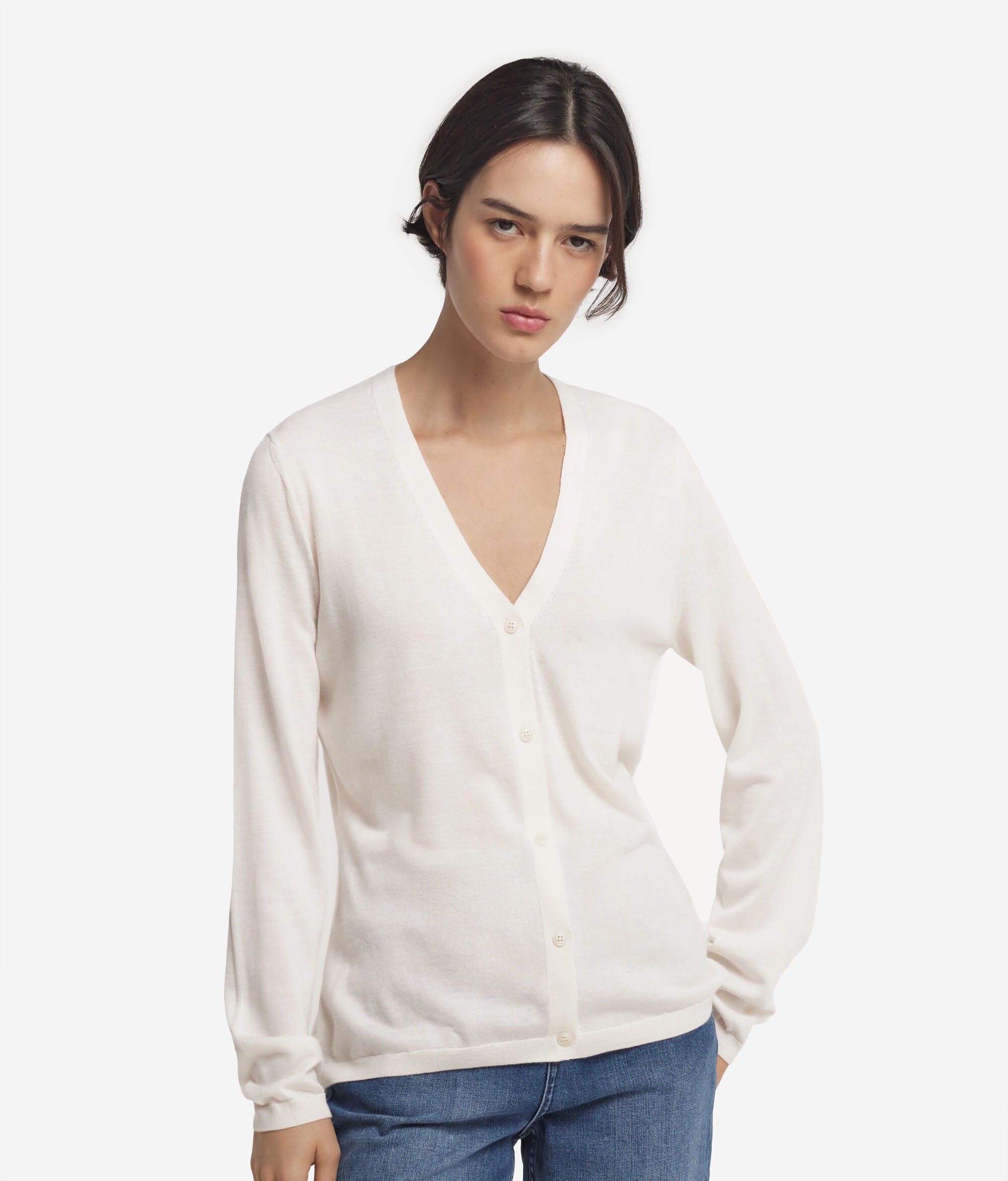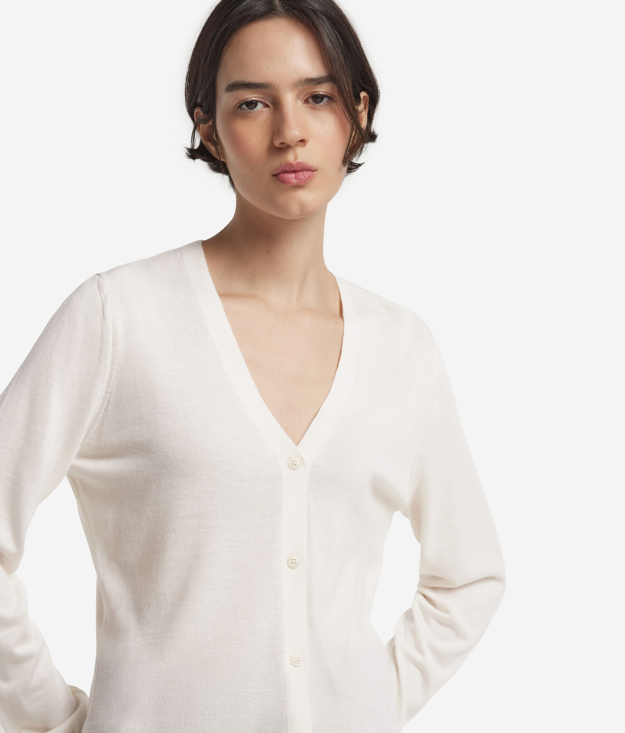 Este cárdigan de cashmere ultrafine combina estilo y funcionalidad y se caracteriza por un elegante cuello de pico y una práctica botonadura en la parte central. El diseño de canalé en los puños y el bajo completa el estilo sencillo y sofisticado de la prenda.