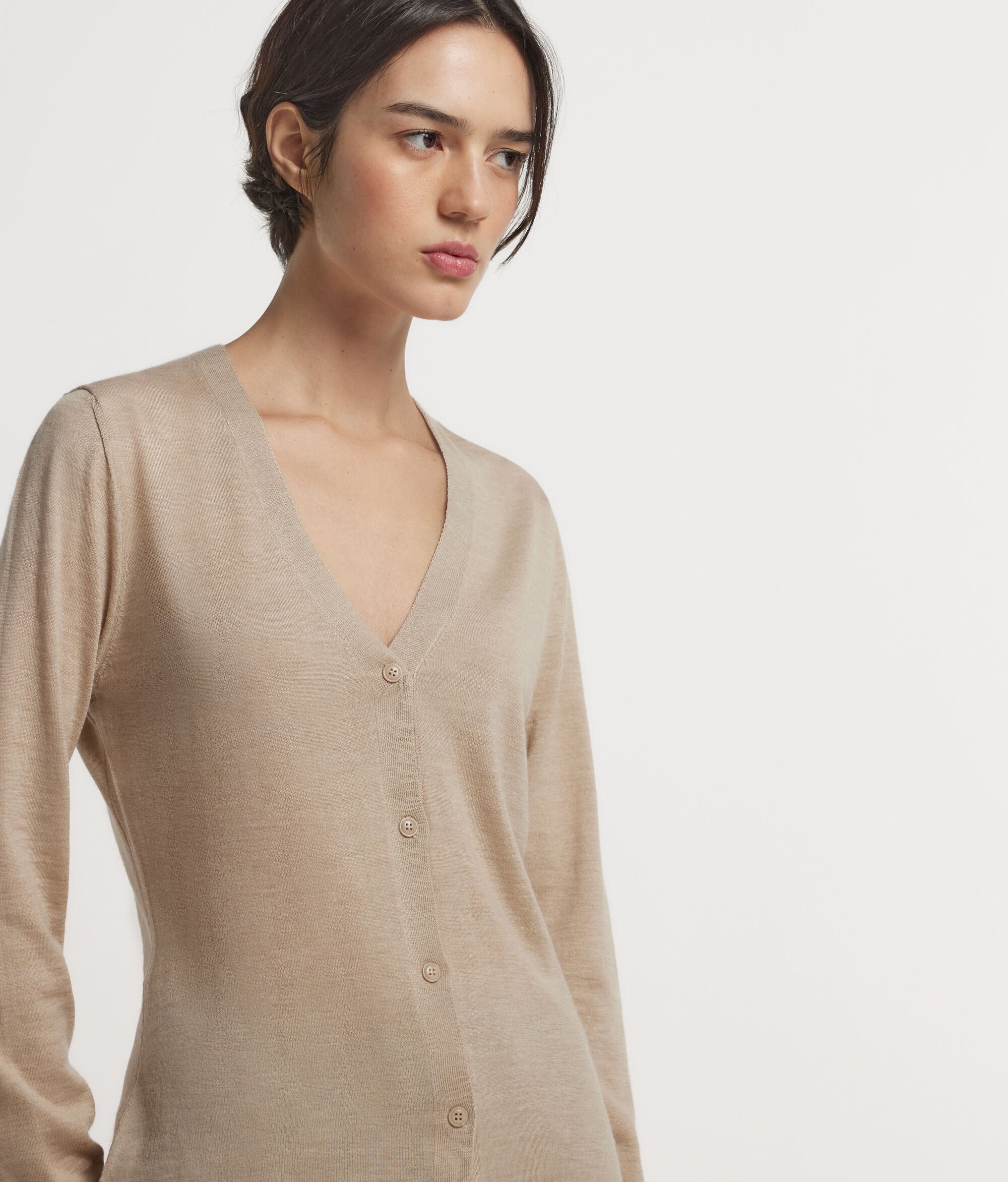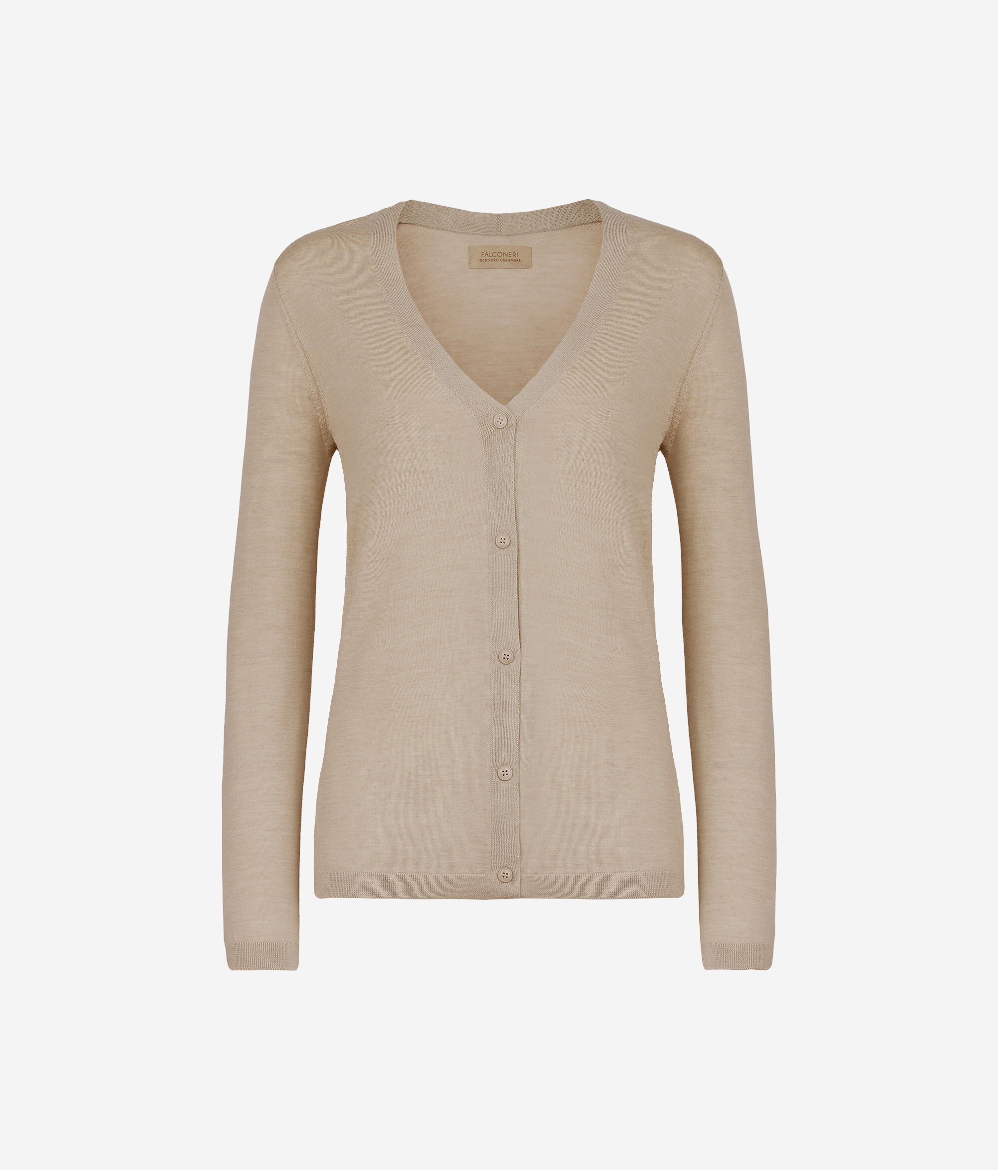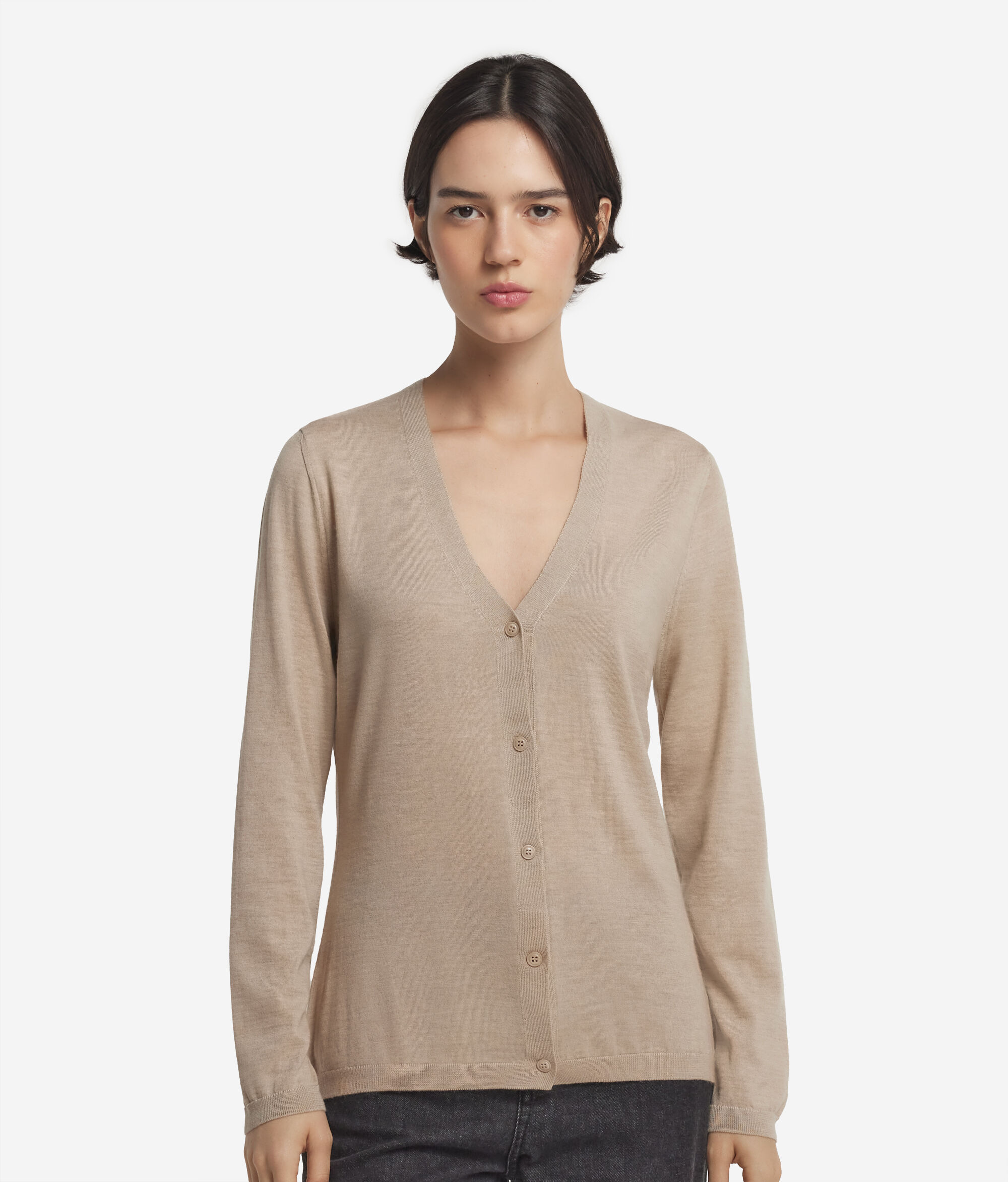 Este cárdigan de cashmere ultrafine combina estilo y funcionalidad y se caracteriza por un elegante cuello de pico y una práctica botonadura en la parte central. El diseño de canalé en los puños y el bajo completa el estilo sencillo y sofisticado de la prenda.