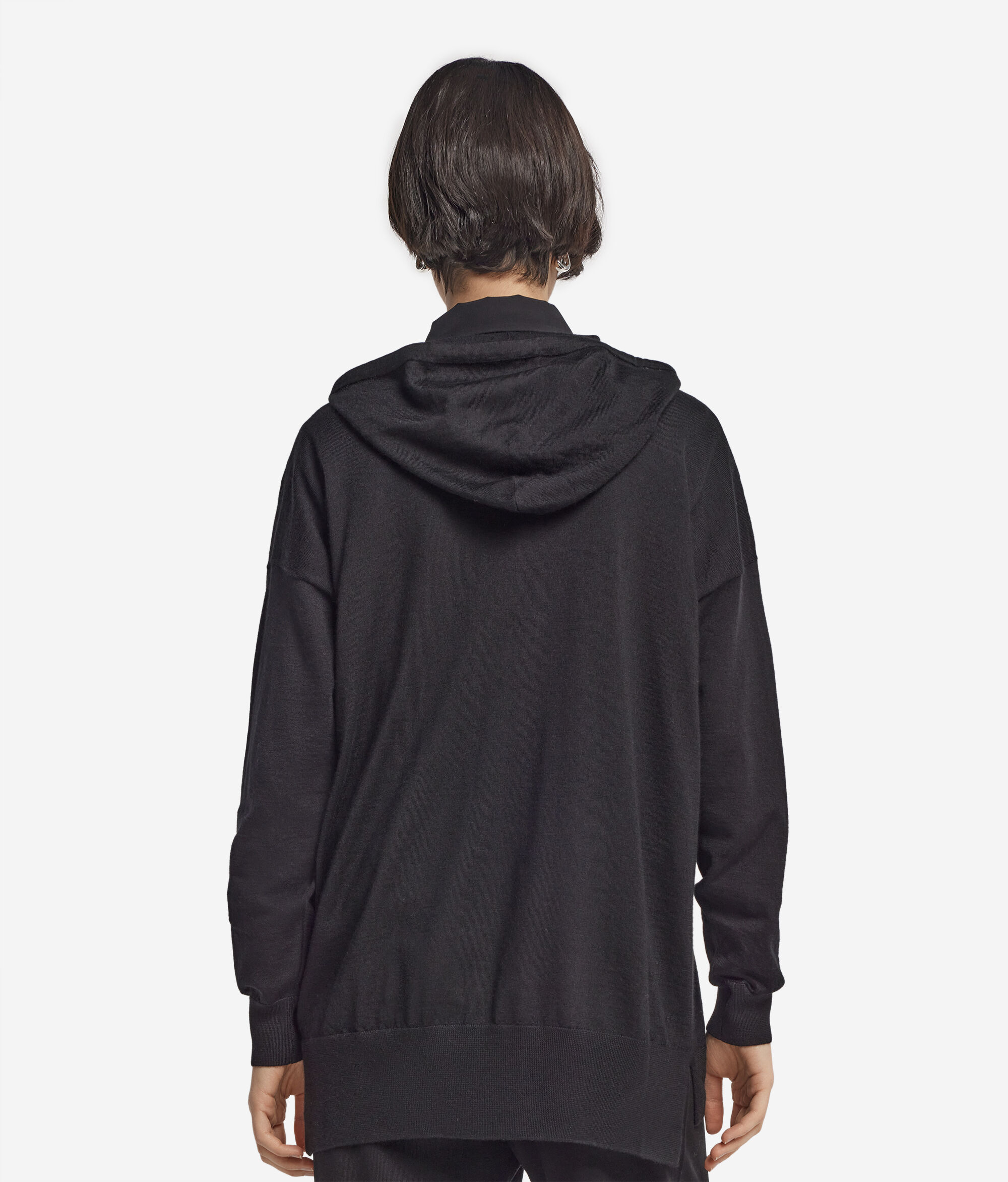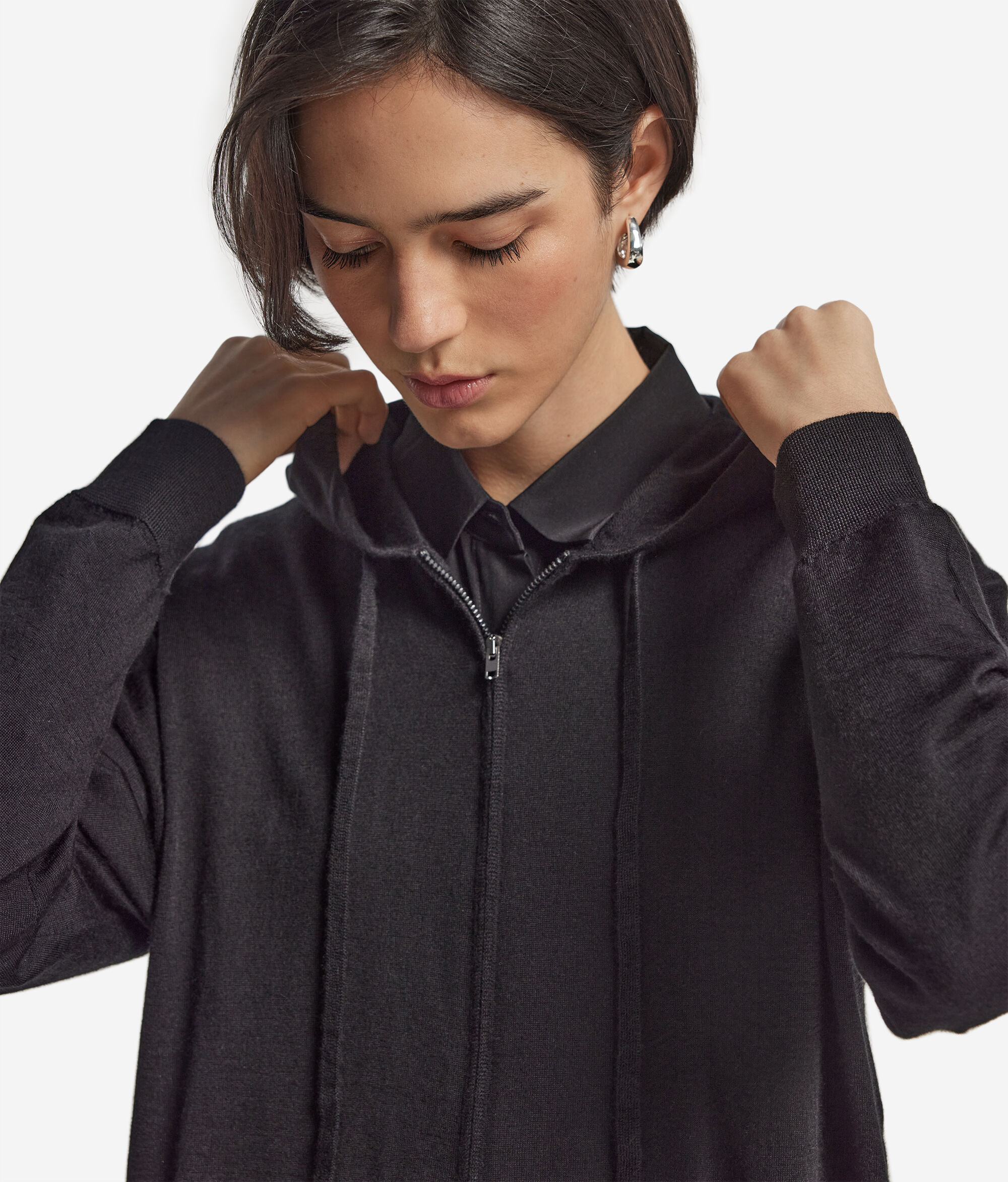 Sudadera confeccionada en cashmere ultrafine con capucha. La prenda presenta una abertura con cremallera hasta el bajo, bolsillos laterales abiertos y hombros ligeramente caídos. Corte holgado.