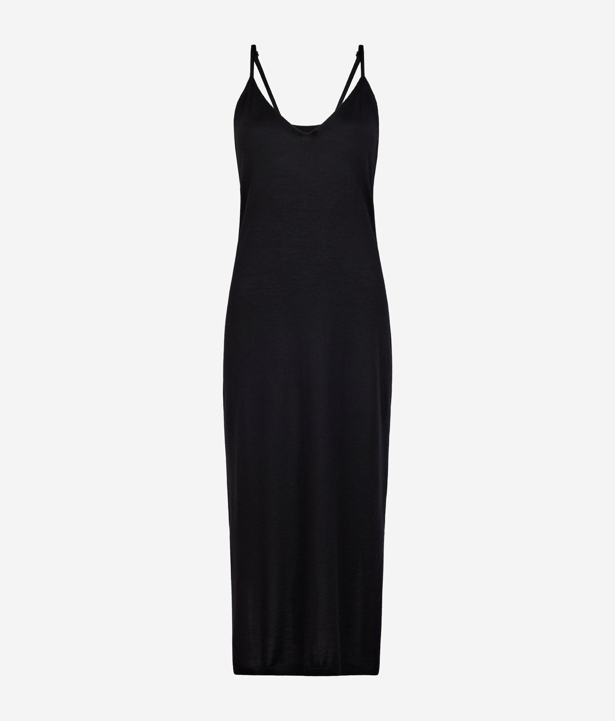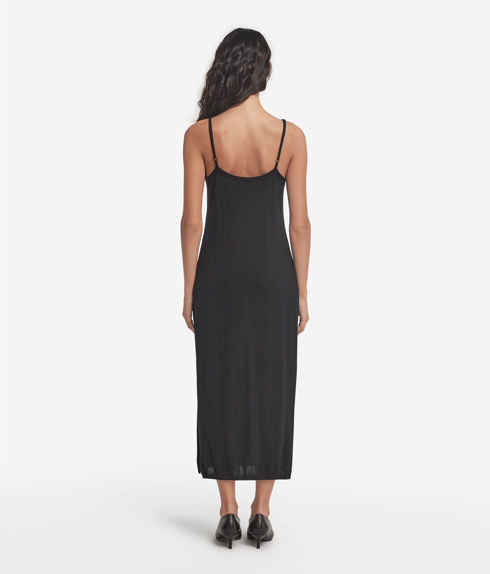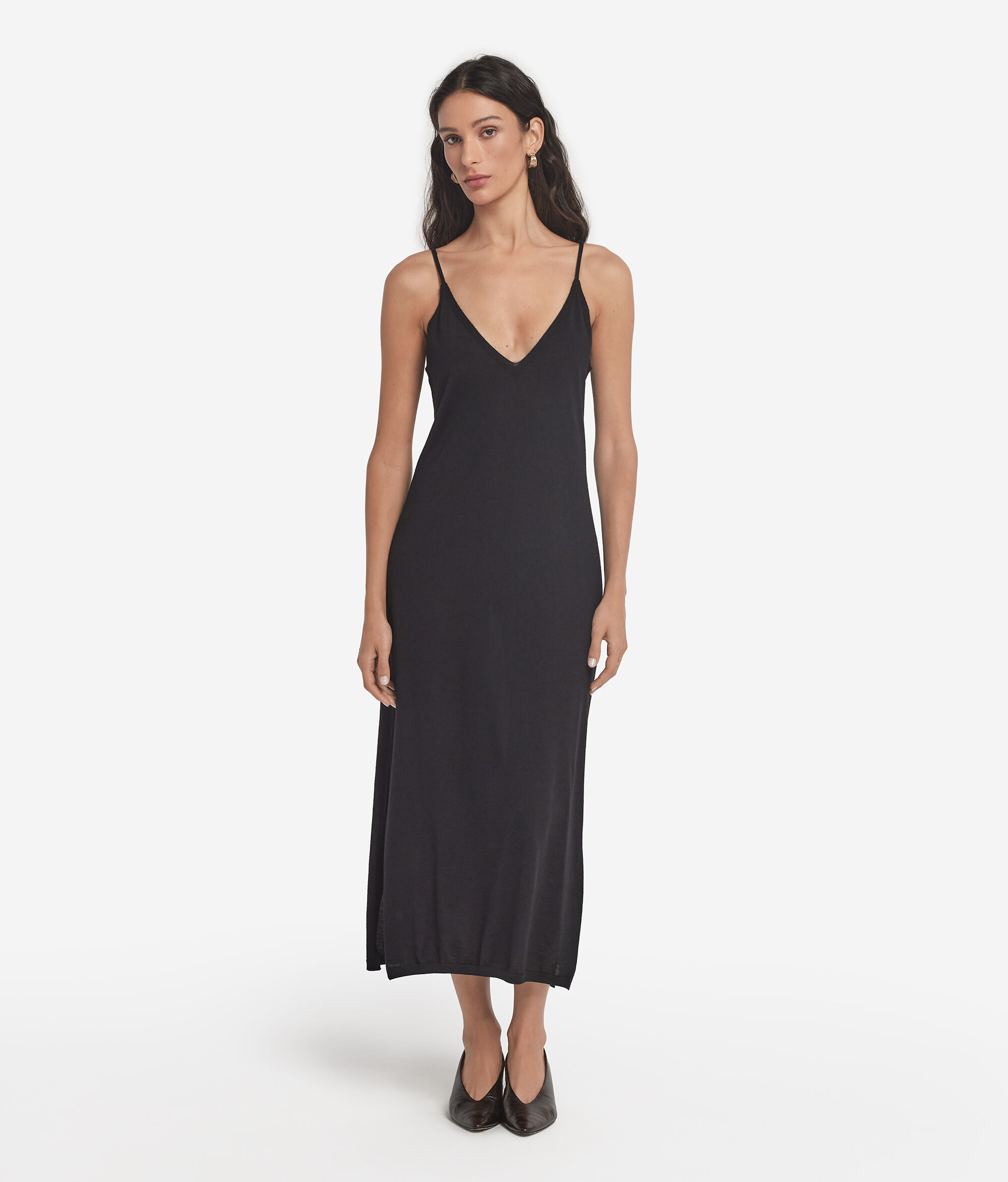 Este sofisticado vestido lencero en cashmere ultrafine se caracteriza por su elegante cuello de pico y por su largo hasta debajo de la rodilla. Las líneas limpias y simples del modelo realzan la silueta, mientras que las aberturas laterales añaden un toque de movimiento y femineidad. Los finos tirantes regulables y los detalles embellecidos con remate de canalé aportan textura y definición al diseño minimalista y contemporáneo de la prenda.