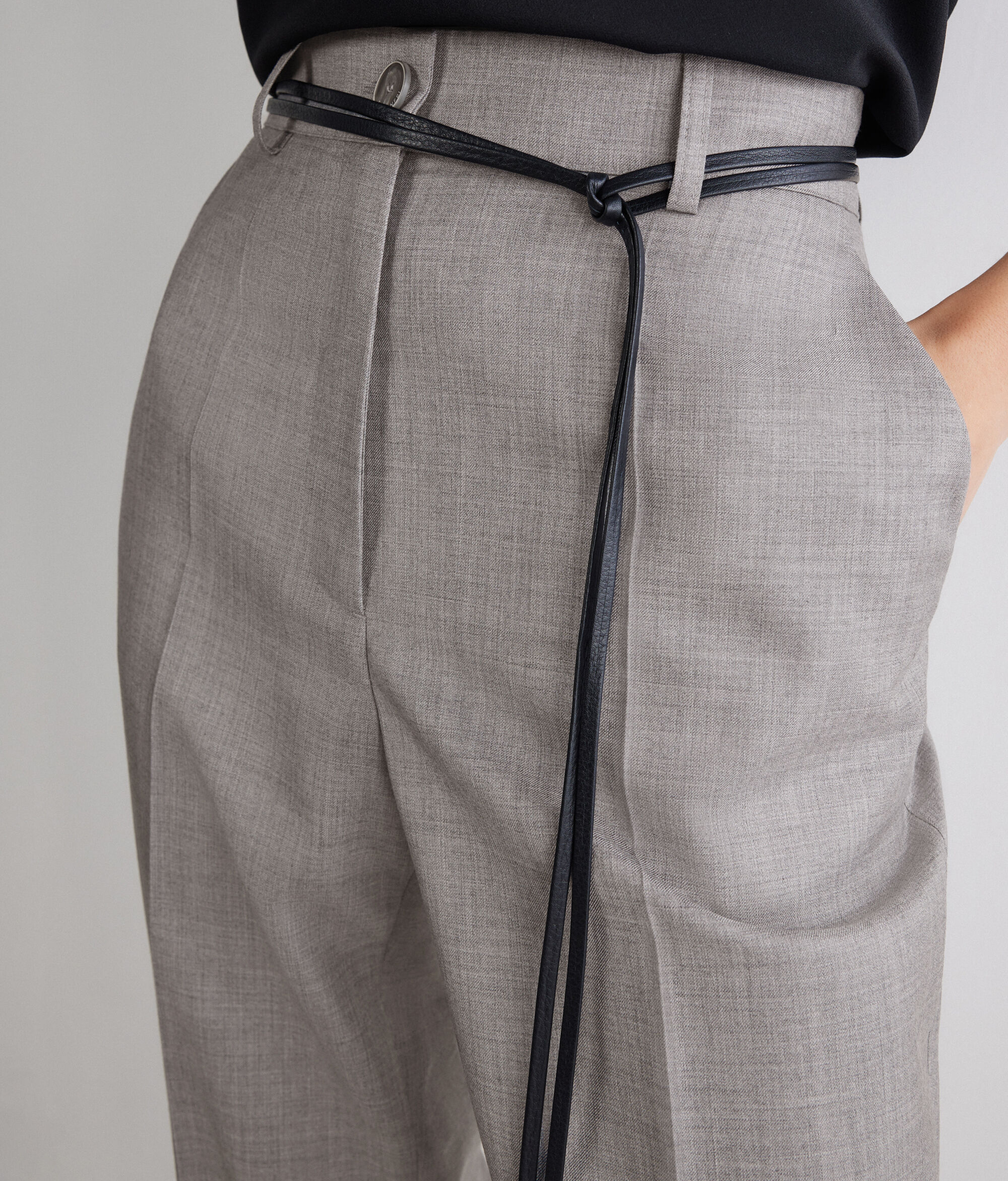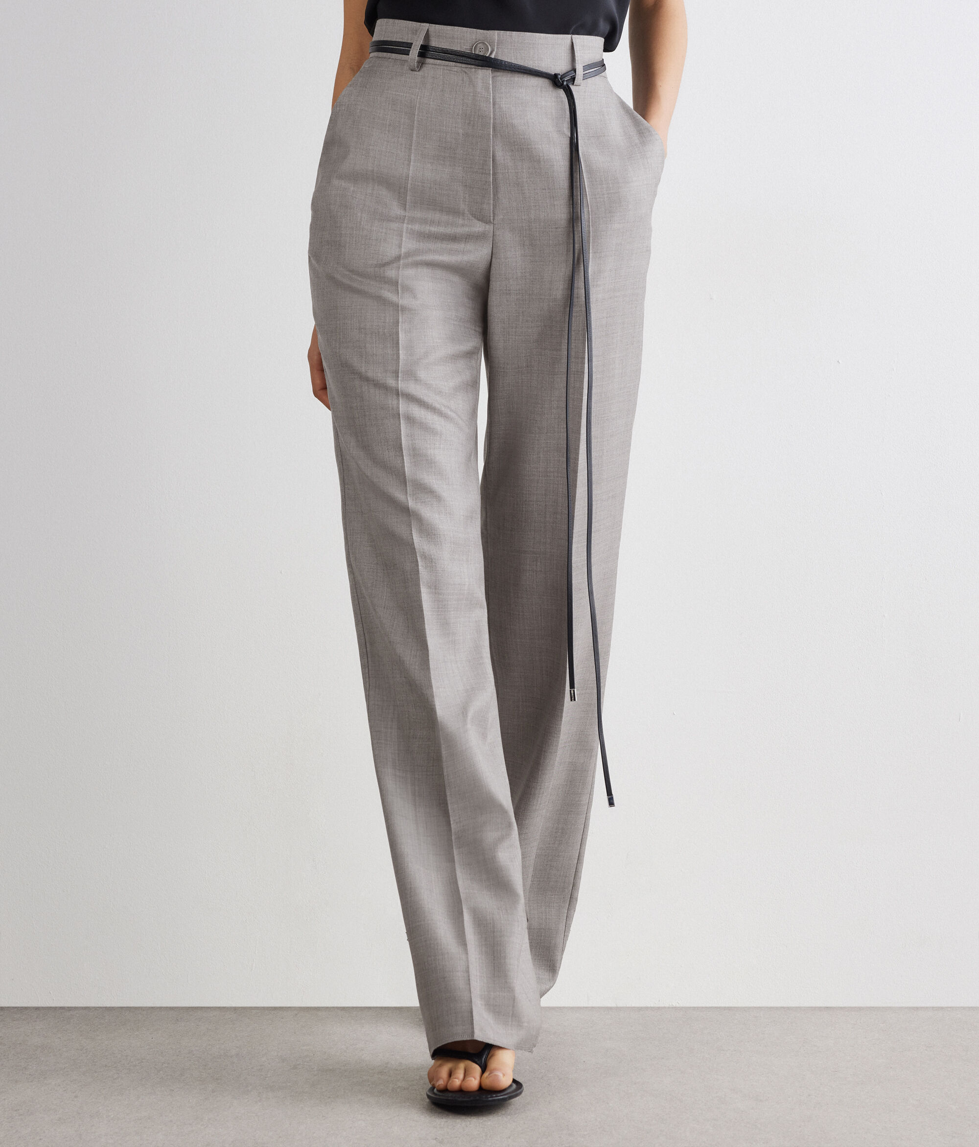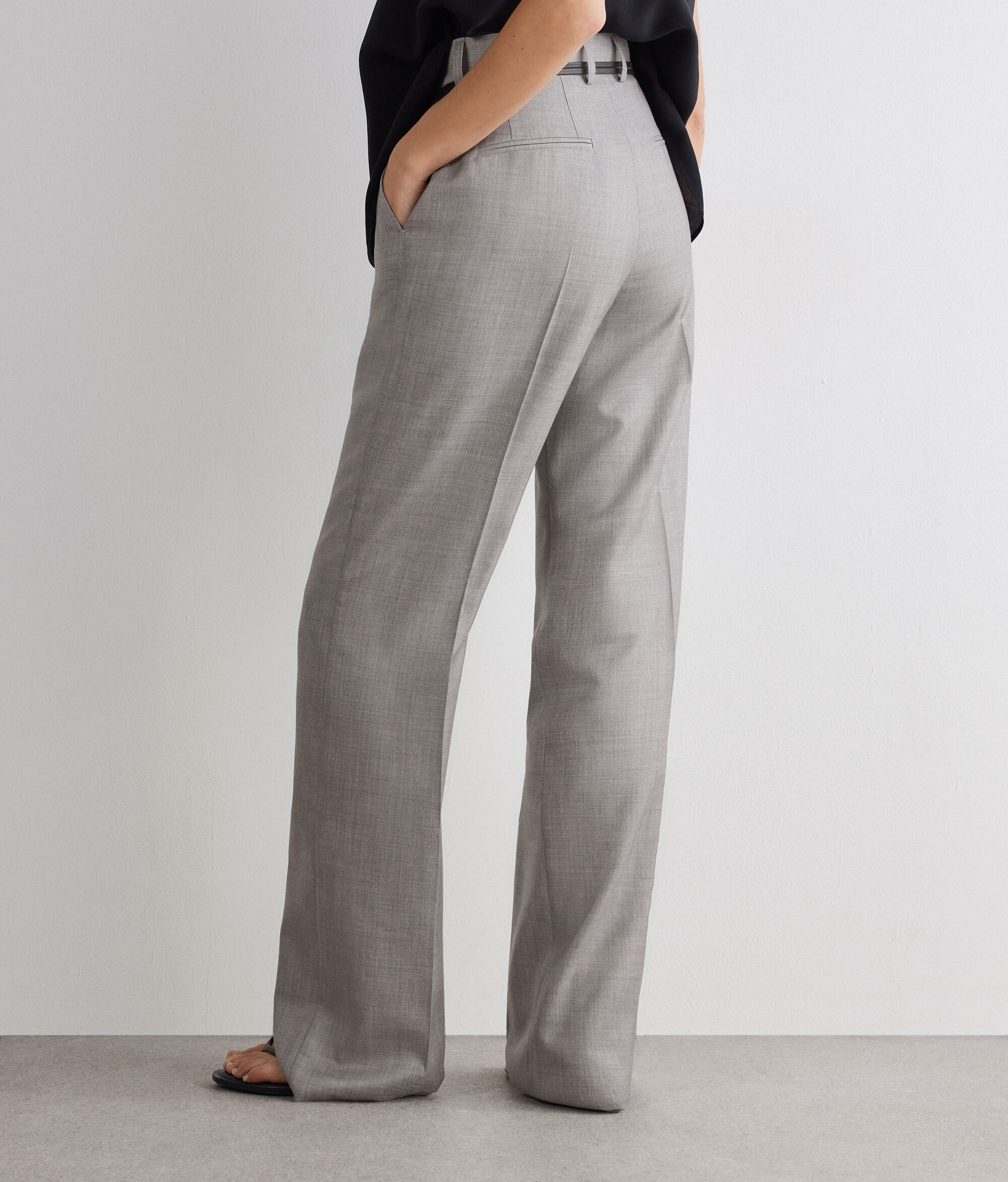 Pantalon style tailleur en cachemire et soie à coupe droite, rehaussé de plis marqués à l'avant et à l'arrière. La fermeture éclair, le rabat et le bouton ainsi que la taille à passants structurent ce modèle, complété par des poches italiennes sur le devant et des fausses poches arrière à double passepoil.
