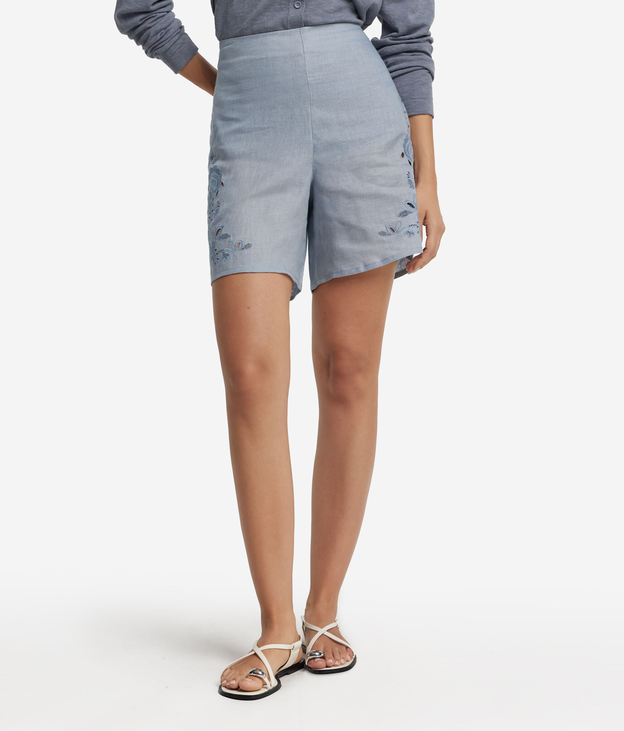 Ce short pur lin frais et féminin allie grâce et simplicité. Sa longueur au-dessus du genou souligne sa légèreté, tandis que des broderies florales sur le devant lui apposent une touche romantique. Une fermeture éclair invisible au dos préserve ses lignes épurées, tandis que sa coupe standard garantit une liberté de mouvement agréable et une élégance naturelle.