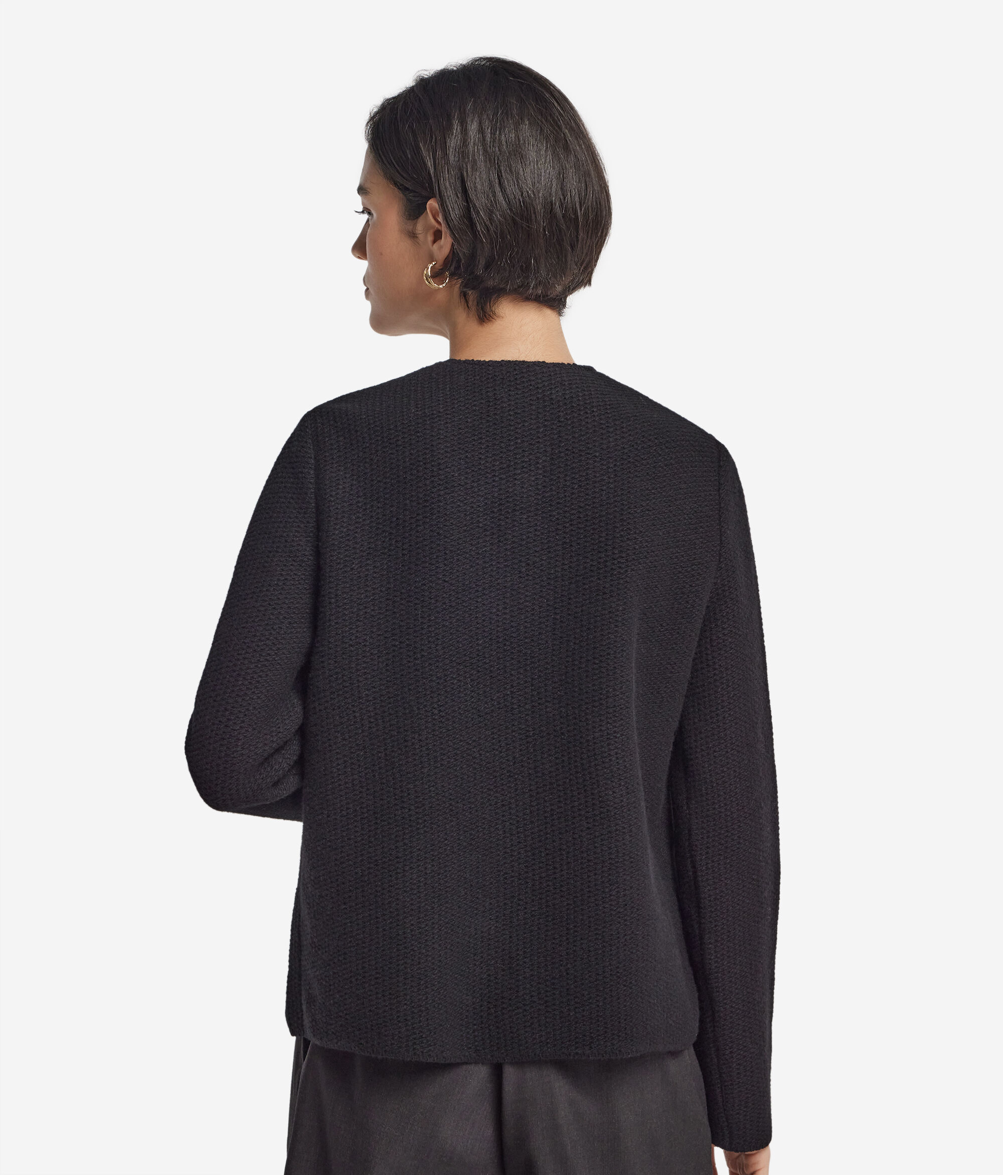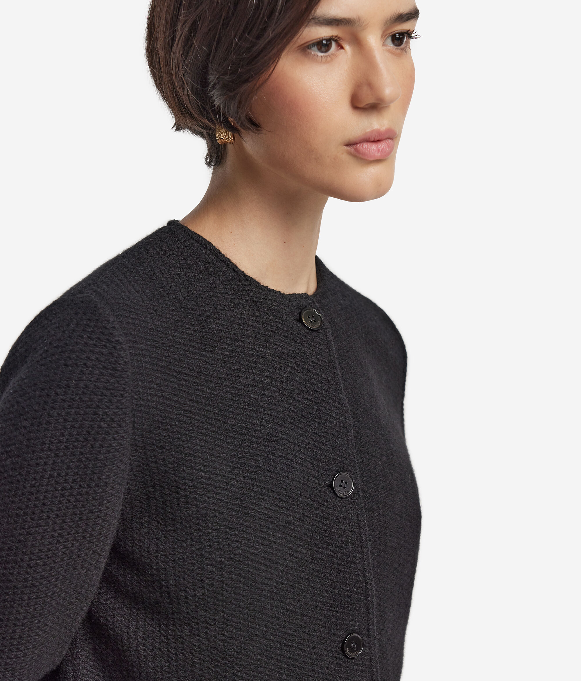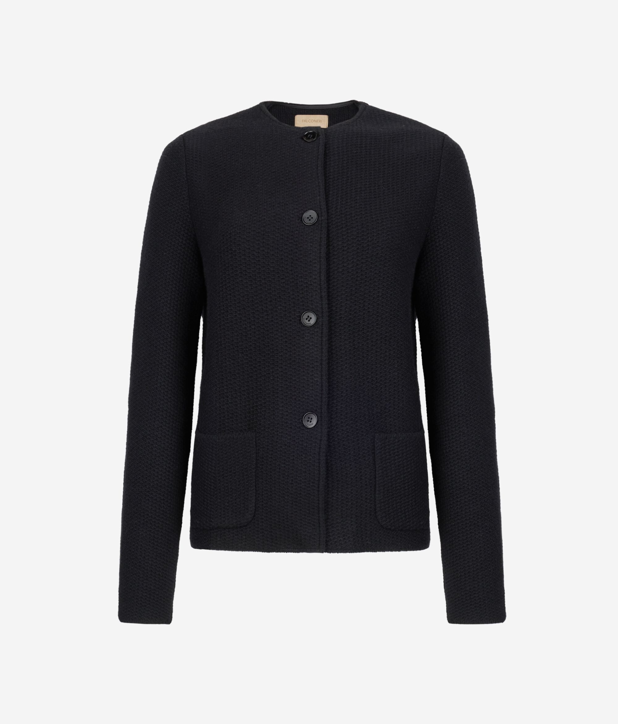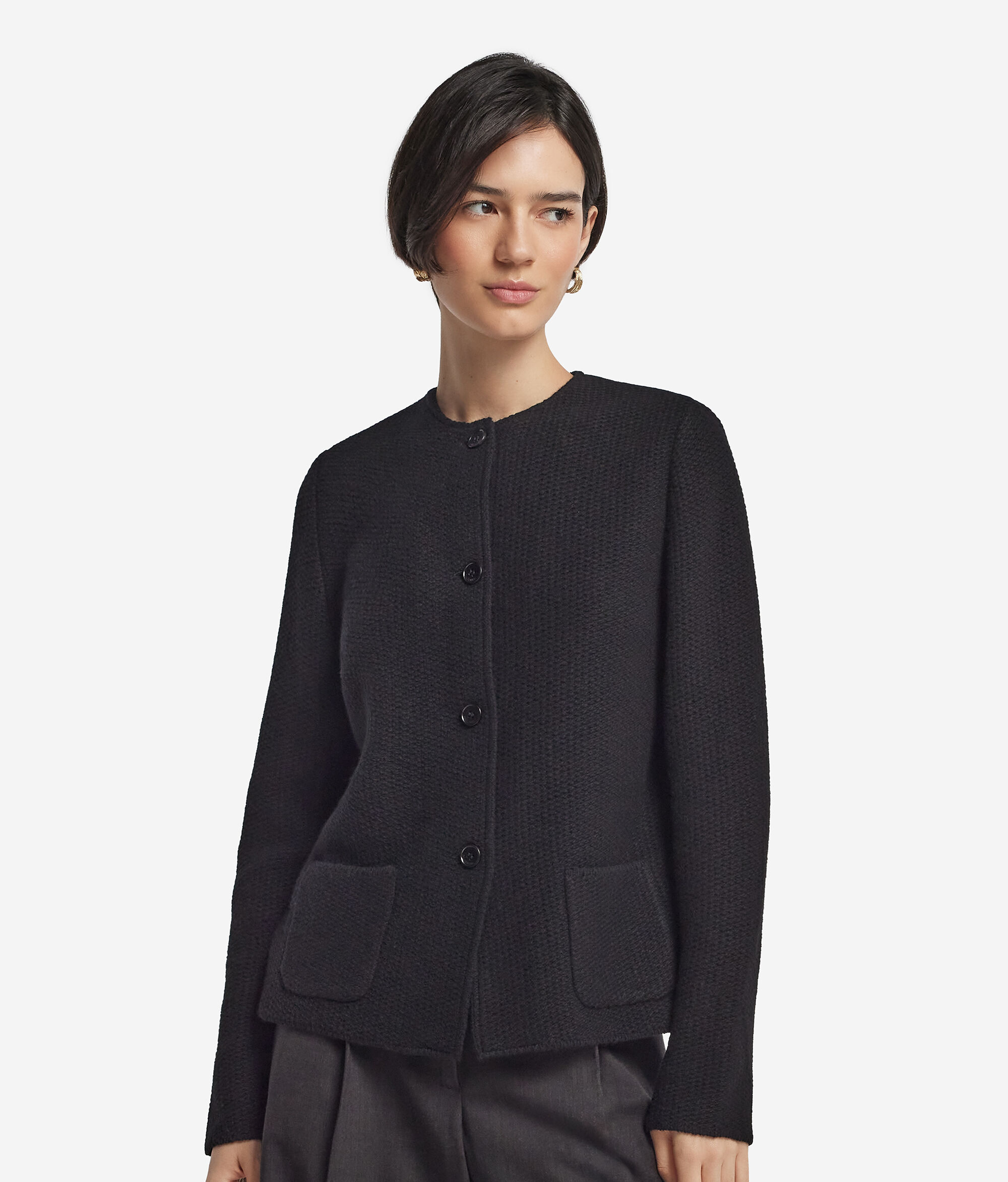 Crafted from a luxurious blend of wool and ultrasoft cashmere, this knitted jacket combines elegance and comfort. The classic crew neck and front button closure create a sleek and versatile appearance. Front patch pockets add a functional detail, while the regular shoulders and long sleeves provide a comfortable, balanced fit. With an above-the-hip length and a Regular Fit. We recommend sizing up one to two sizes for the best fit, it is the perfect garment for those seeking a balance between style and everyday practicality.