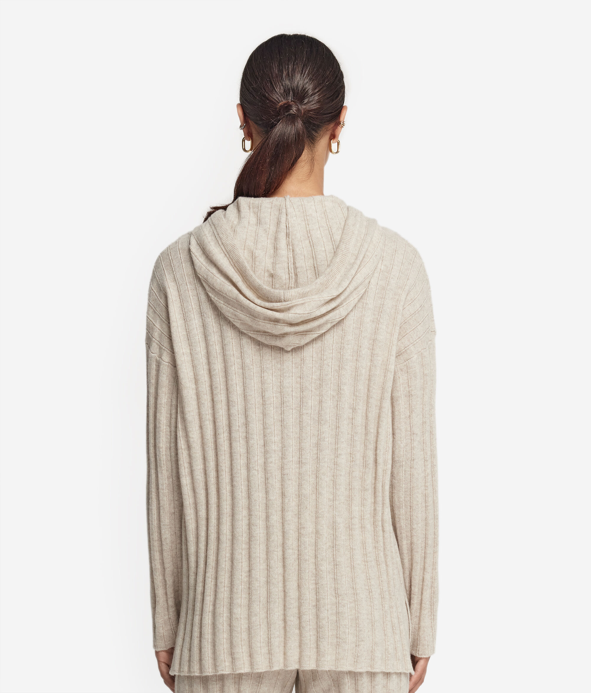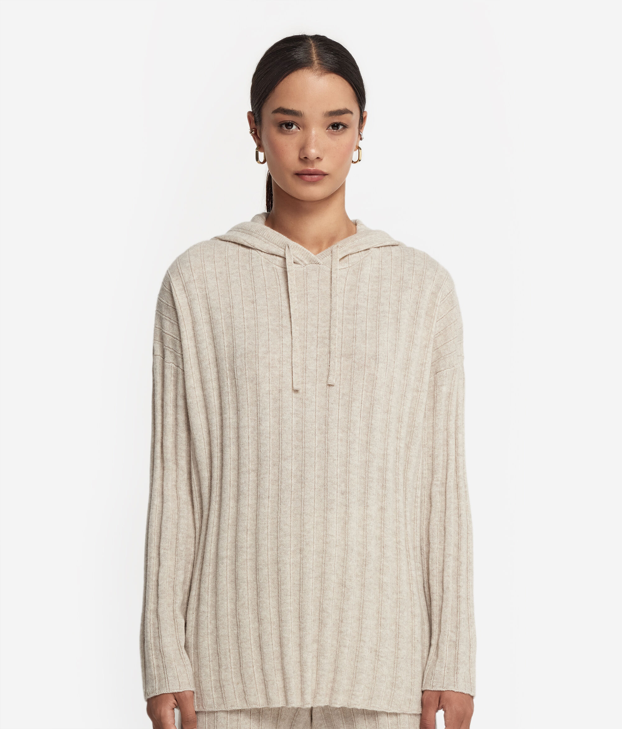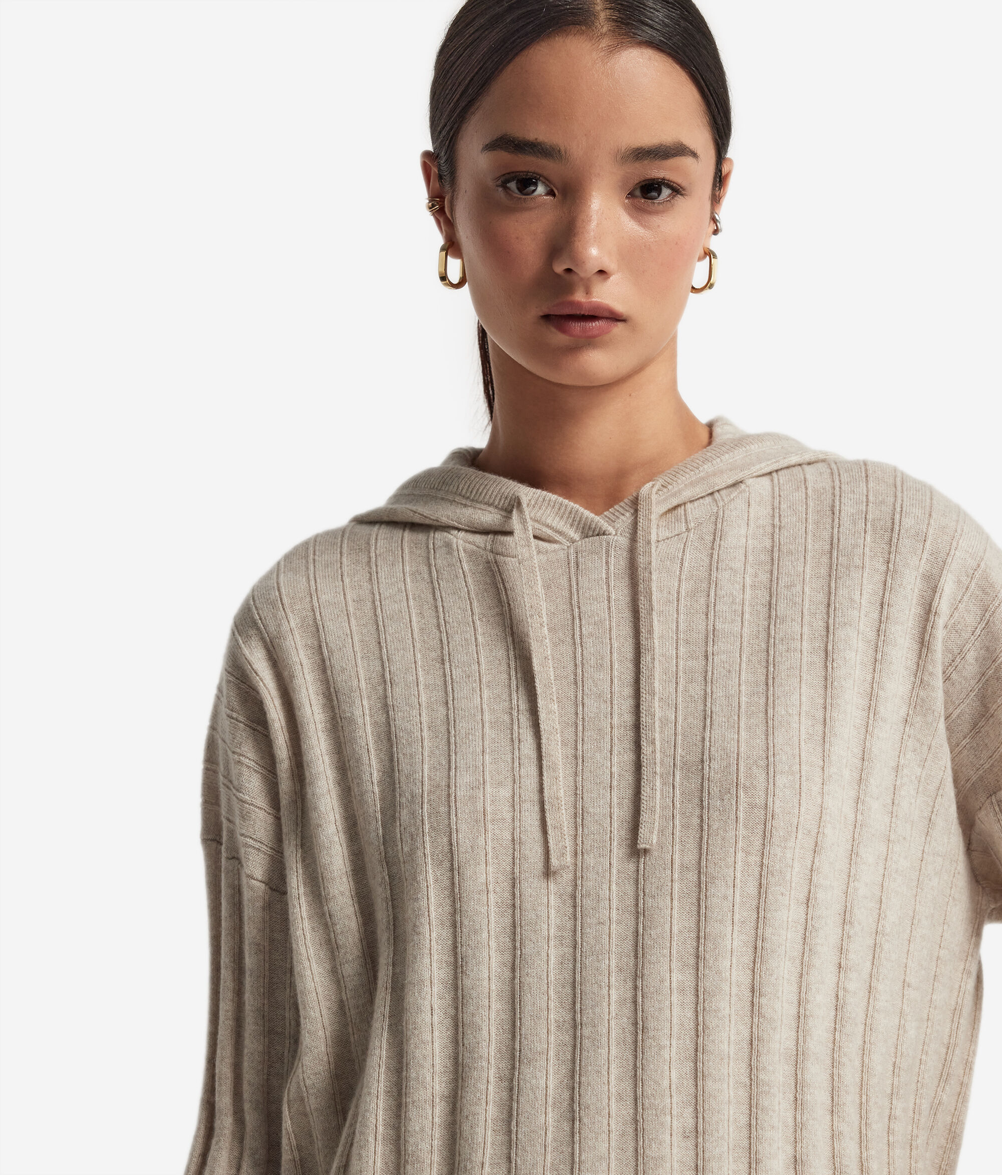 Discover the comfort and casual elegance of this sweatshirt, made from luxurious Ultrasoft cashmere. The garment features an adjustable drawstring hood and a ribbed design to help lend texture and sophistication to the fabric. Attention to detail is shown through the two side slits and ribbed trim on the hood. The loose, relaxed fit with dropped shoulders creates a casual, contemporary look, perfect for spending some downtime.