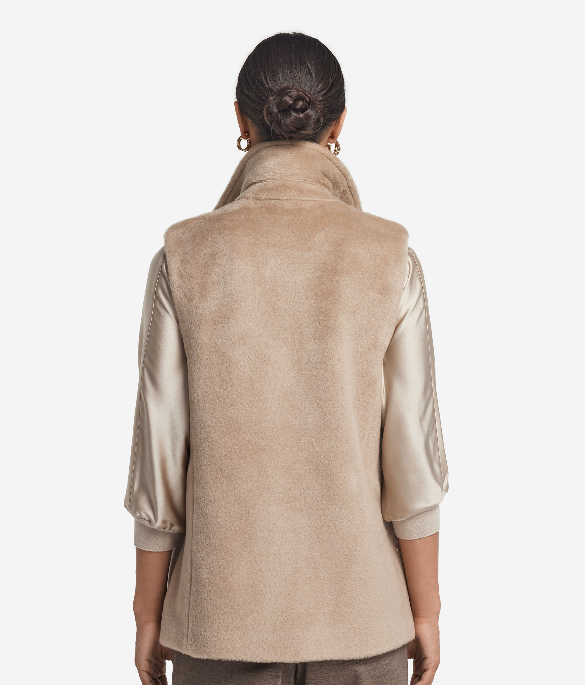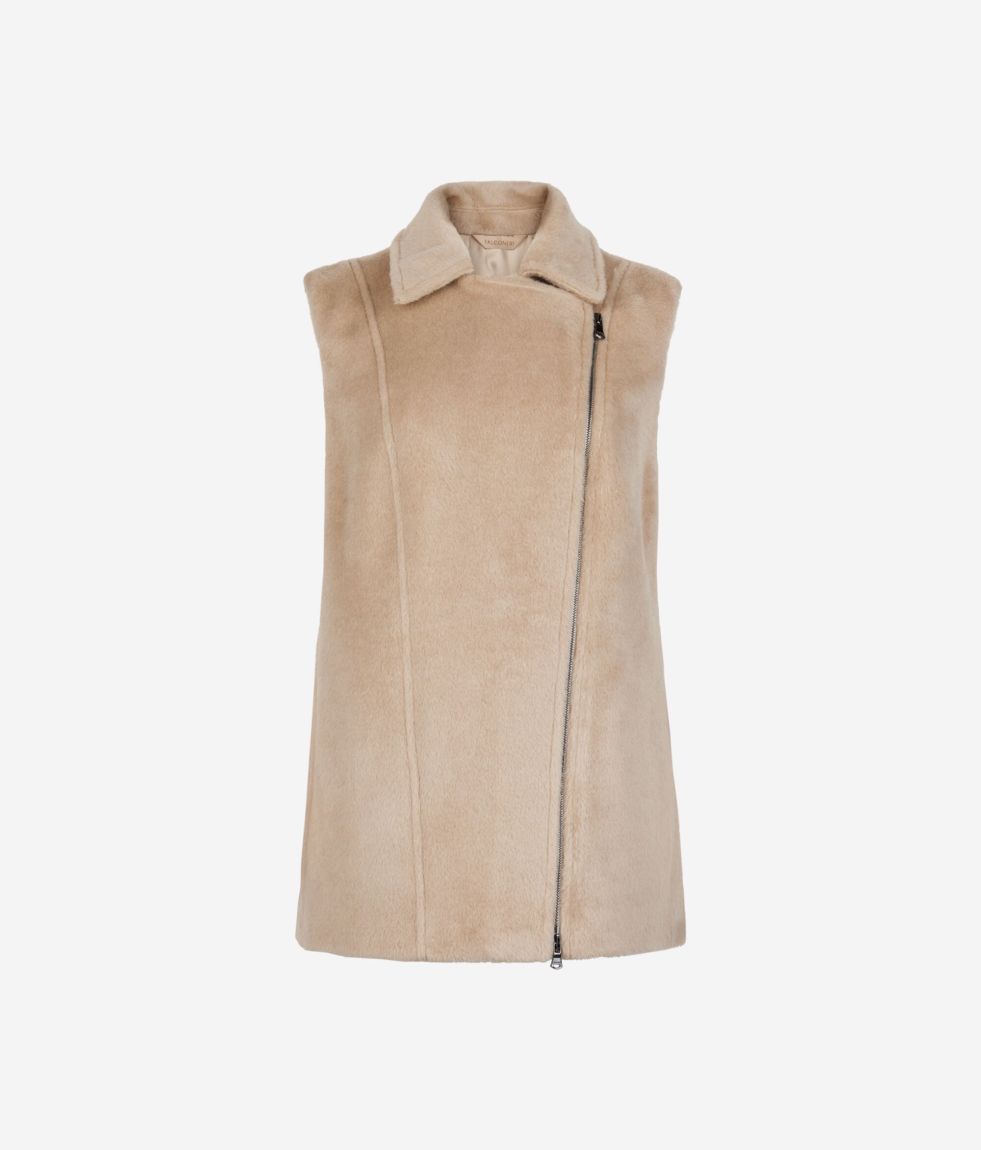 With a bold, refined style, this sleeveless biker jacket blends character and softness, with a fur-effect fabric crafted from fine alpaca wool. The design is enriched by a wide lapel collar and a diagonal metal zip, for a bold, characterful touch. The welt pockets on the sides maintain a sleek, functional line, perfectly harmonising with the balanced silhouette that complements the overall design.