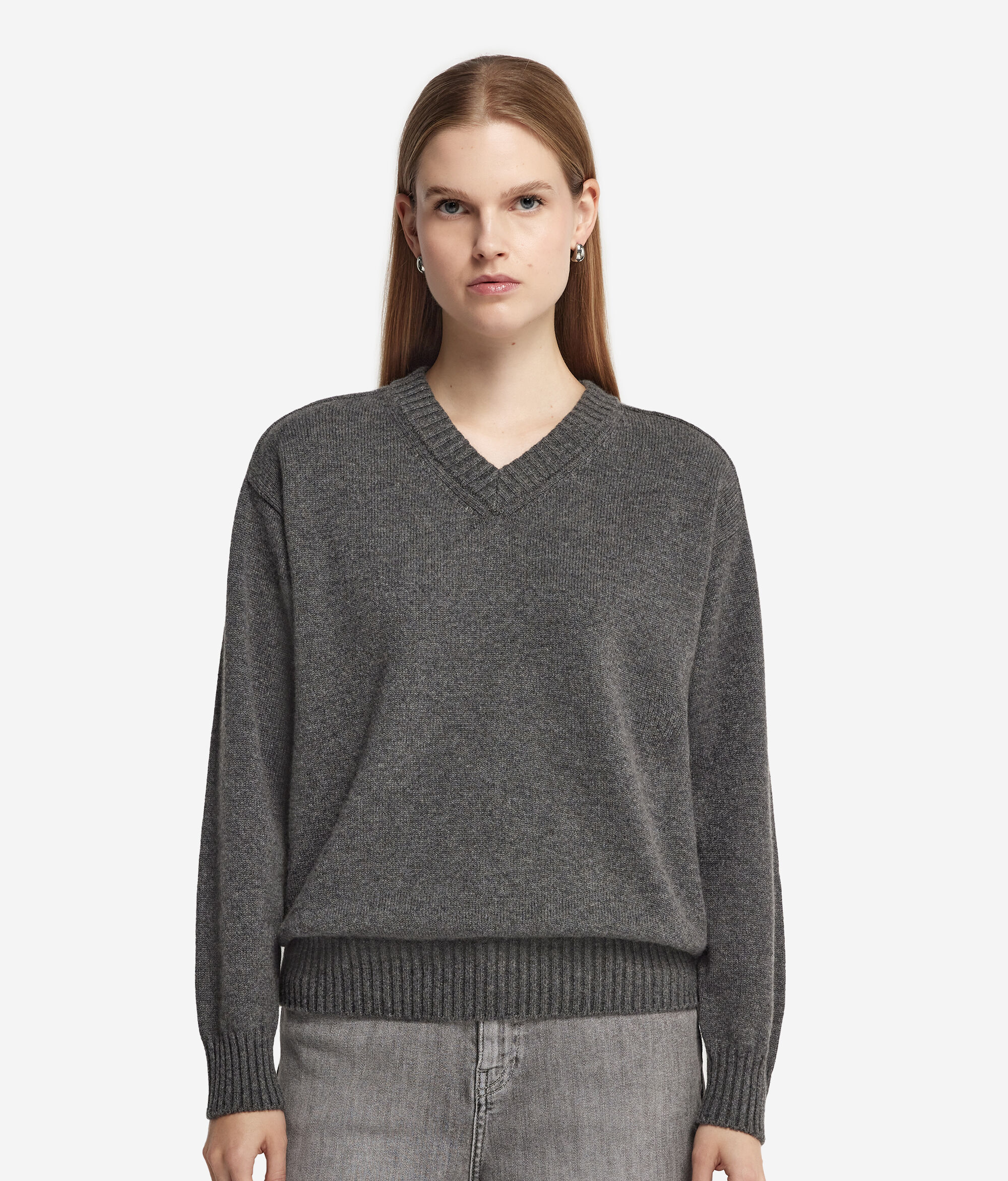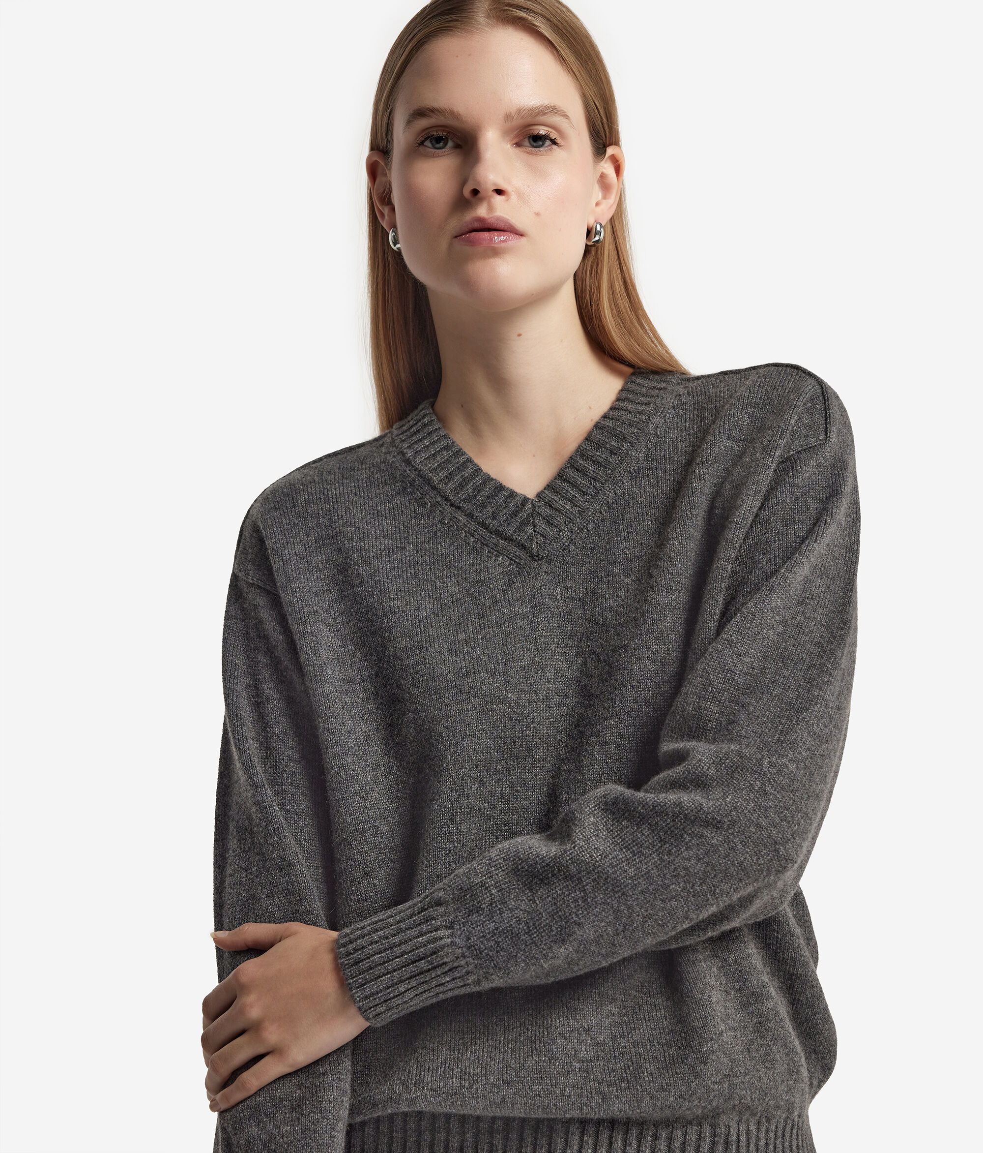 The natural fibres of Ultrasoft Cashmere create an exquisite, enveloping texture for this elegant V-neck jumper. The ribbing on neckline, cuffs and edge enhances its essential design, while the softness of the yarn exalts its relaxed volumes. The dropped set-in sleeves give the garment a touch of informal elegance.