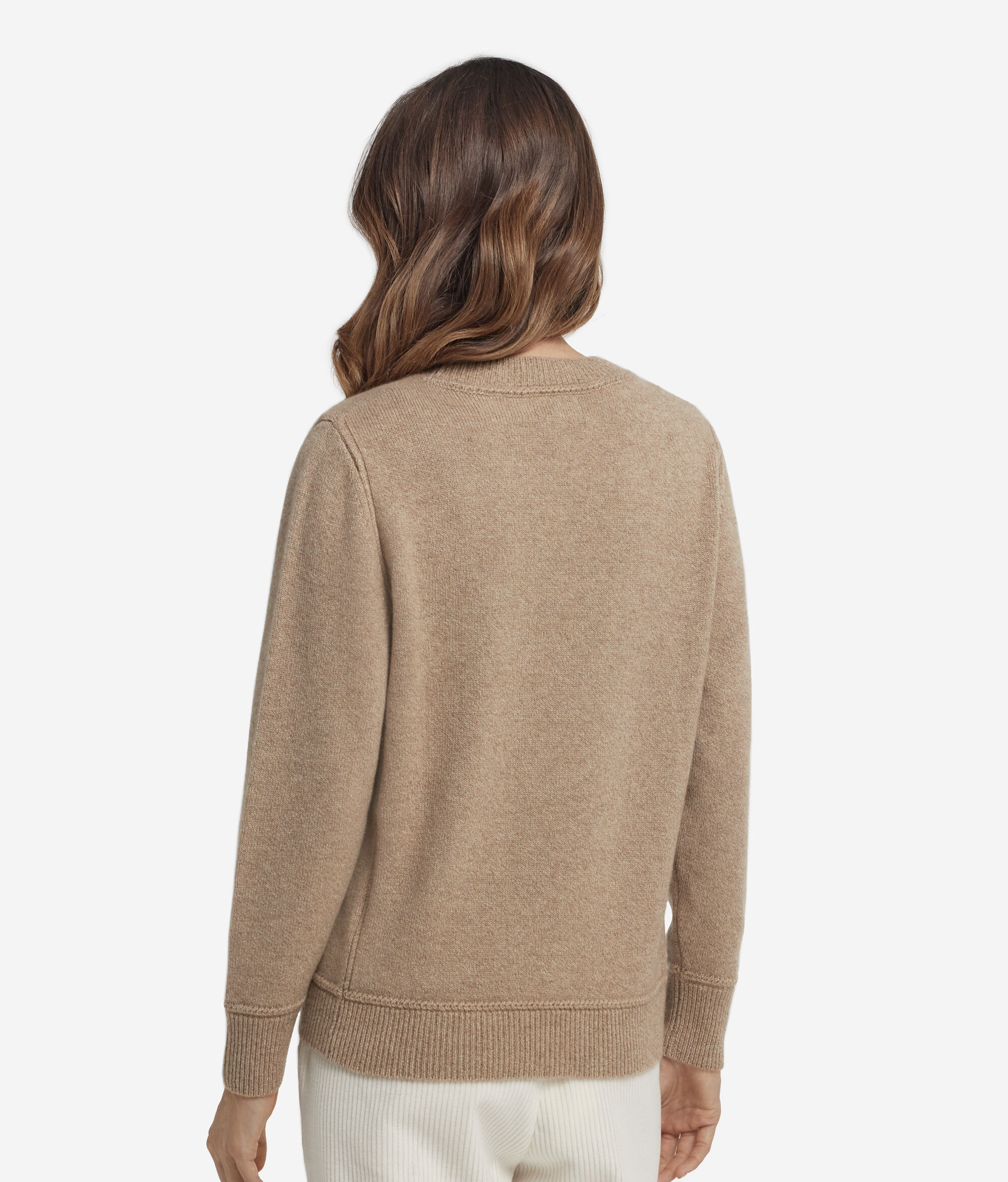 Simple and refined, this round-neck jumper in Undyed Ultrasoft Cashmere enhances the purity of the natural fibre, left in its original shade to enhance its softness and authenticity. The regular fit and defined shoulder offer refined harmony, enriched by braid details on the collar, shoulders and hem. Ribbed finishes complete the design with understated precision. An essential piece, designed to transition through the seasons in style.