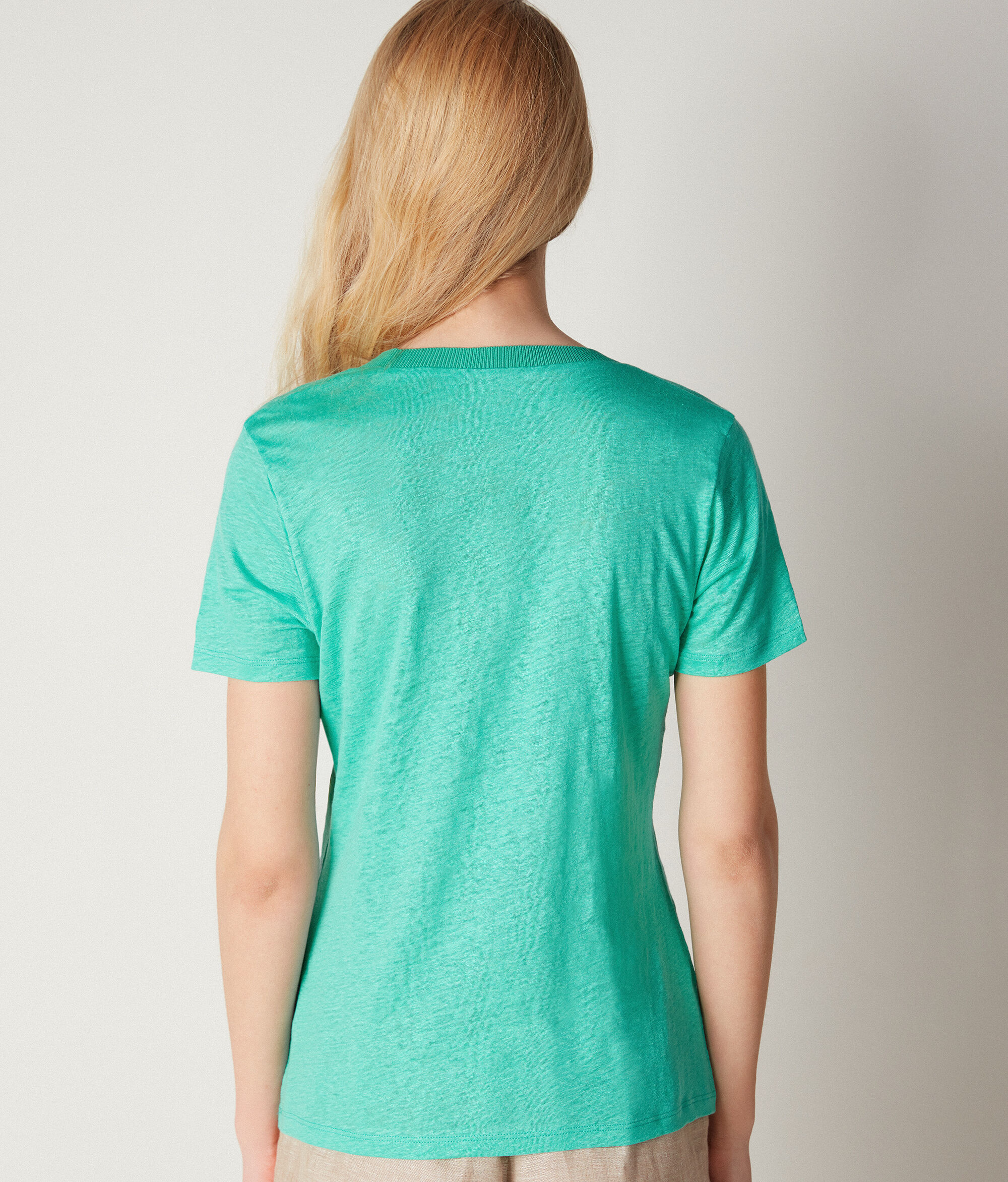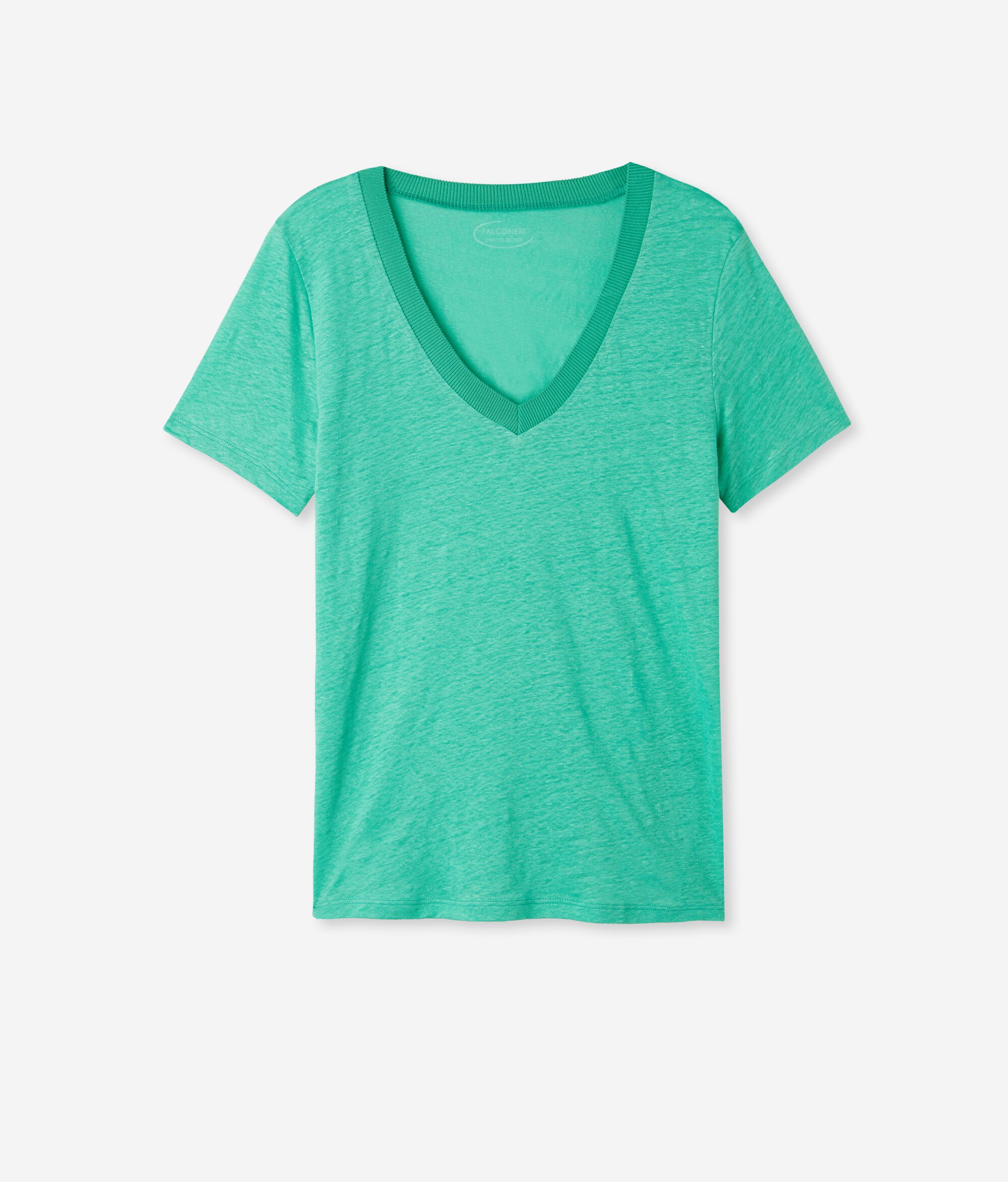 Ένα απαραίτητο και ευκολοφόρετο ρούχο για την ανοιξιάτικη σεζόν και τα ζεστά βράδια του καλοκαιριού, το t-shirt από λινό ζέρσεϊ με λαιμόκοψη V εμπλουτίζεται με τις κομψές λεπτομέρειες που χαρακτηρίζουν το brand Falconeri. Η πλεκτή μπορντούρα με ύφανση ριμπ στη λαιμόκοψη ολοκληρώνει το ρούχο με μια έντονα θηλυκή λεπτομέρεια.