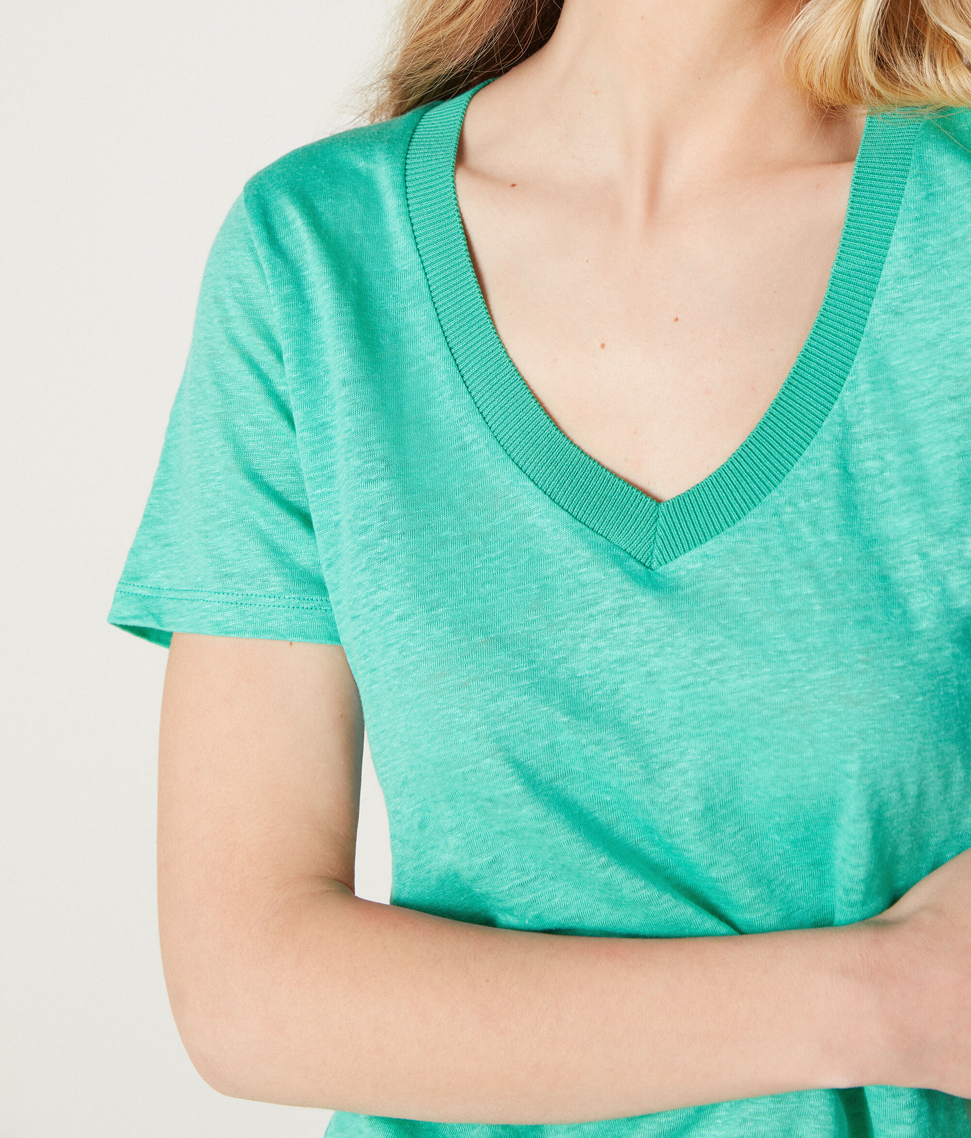 T-shirt με Λαιμόκοψη V από Λινό με Πλεκτή Μπορντούρα