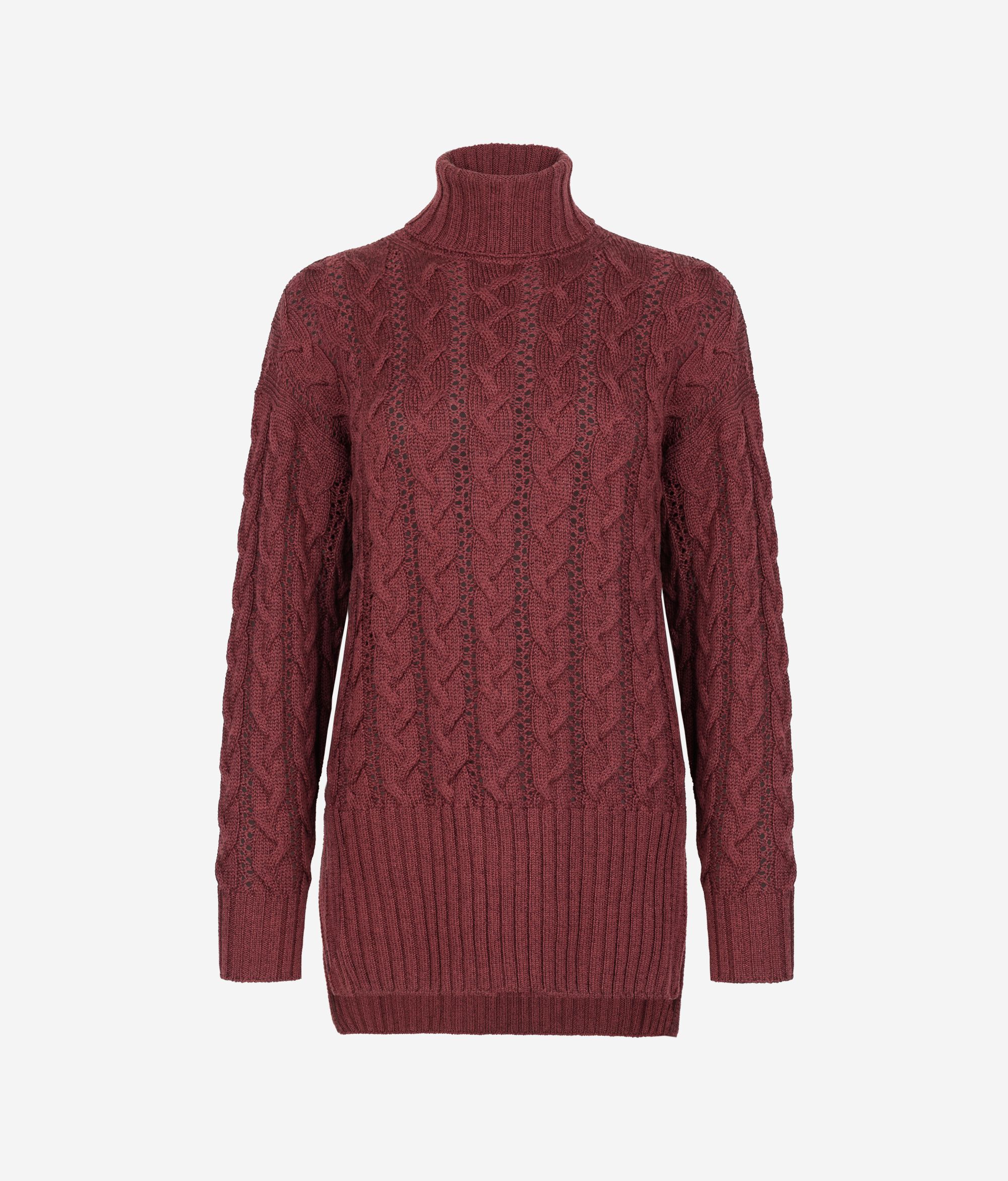 Izrađena od lureks vune, ova dolčevita kombinira mekoću i suvremeni šarm. Vertikalne pletenice vitkije oblikuju siluetu, dok bočni prorezi i asimetrična duljina ispod bokova stvaraju pokret i modernost. Rebrasti detalji na dekolteu, manžetama i rubu upotpunjuju svestran, elegantan i neodoljiv odjevni predmet za hladnije dane.
