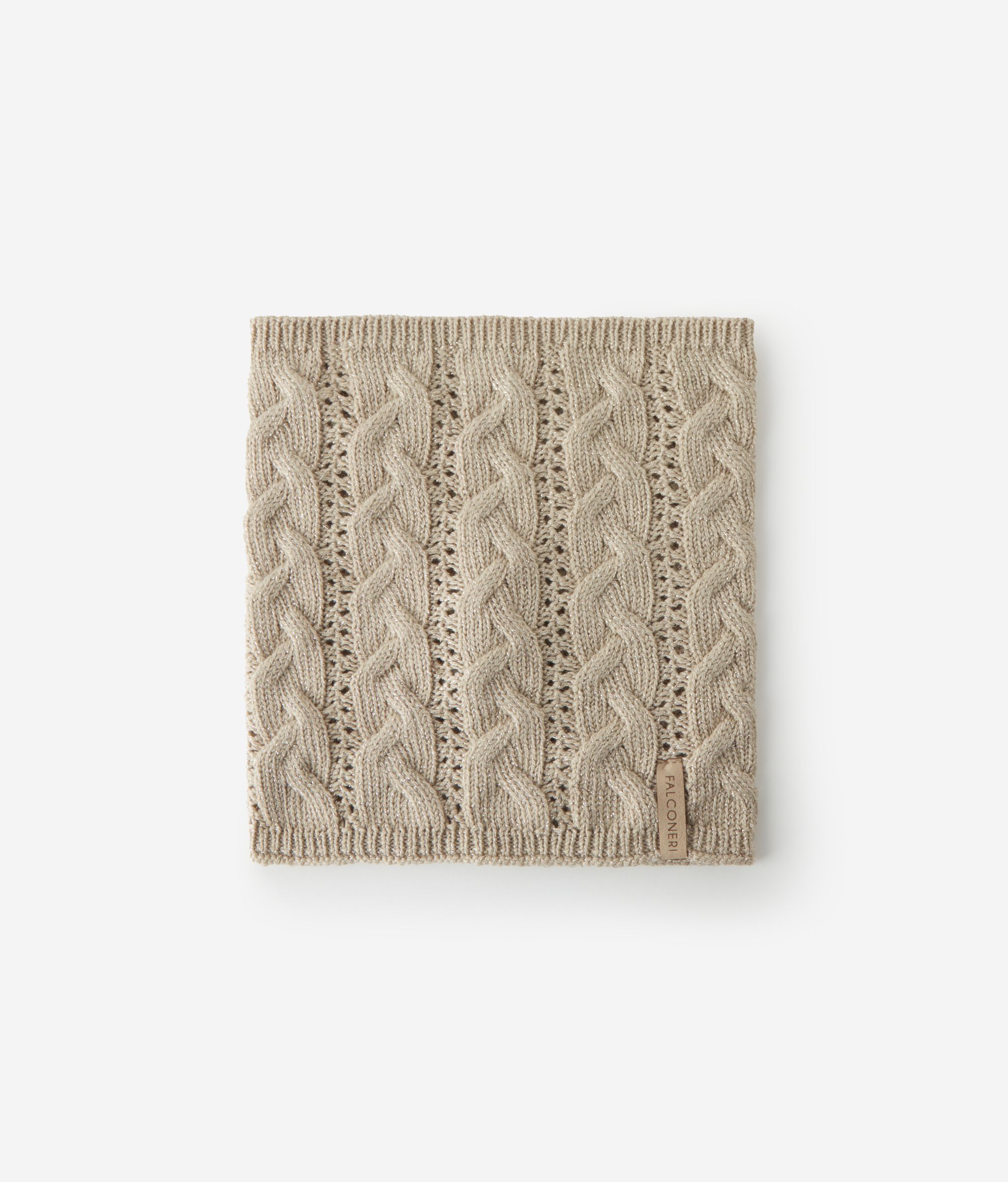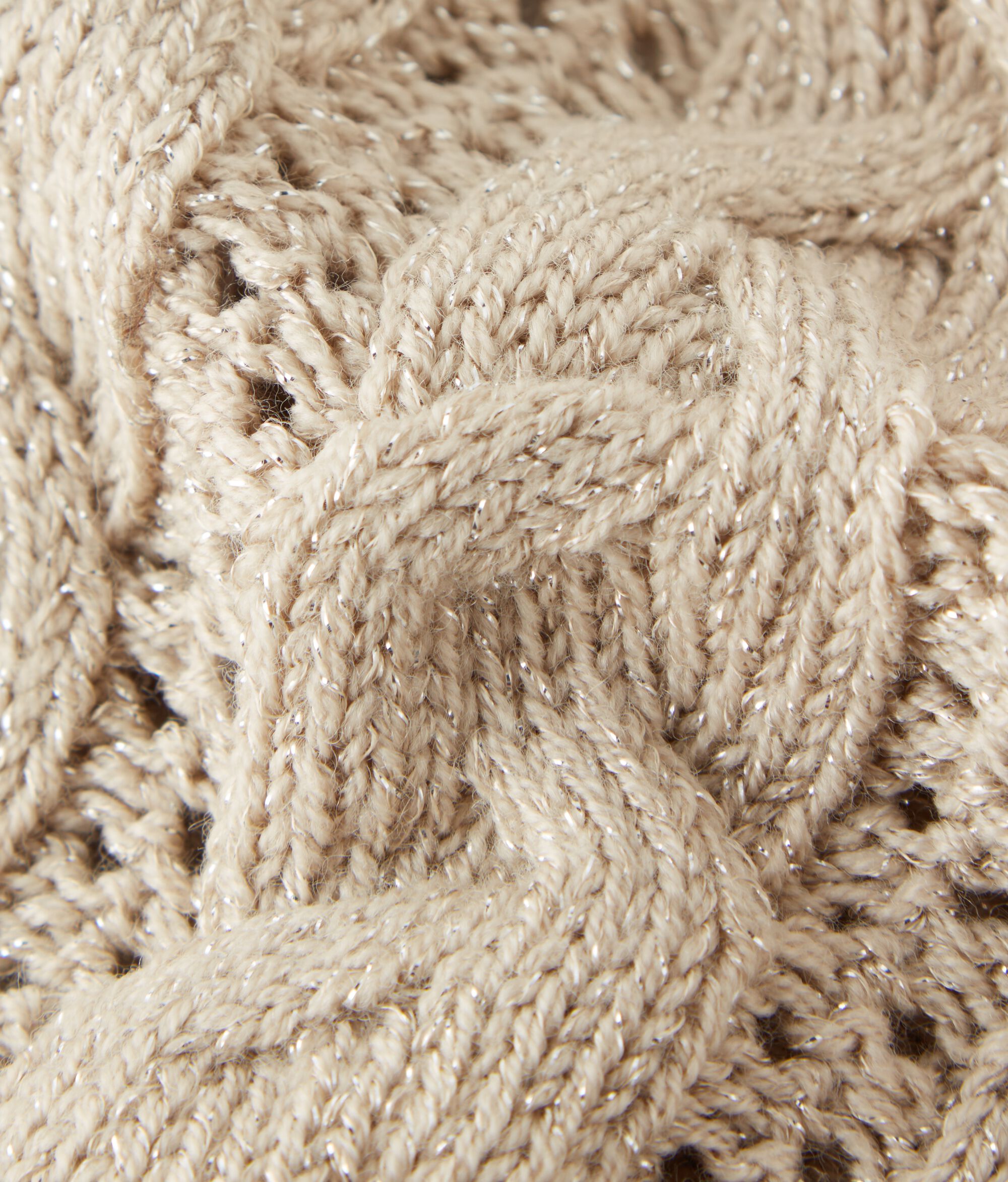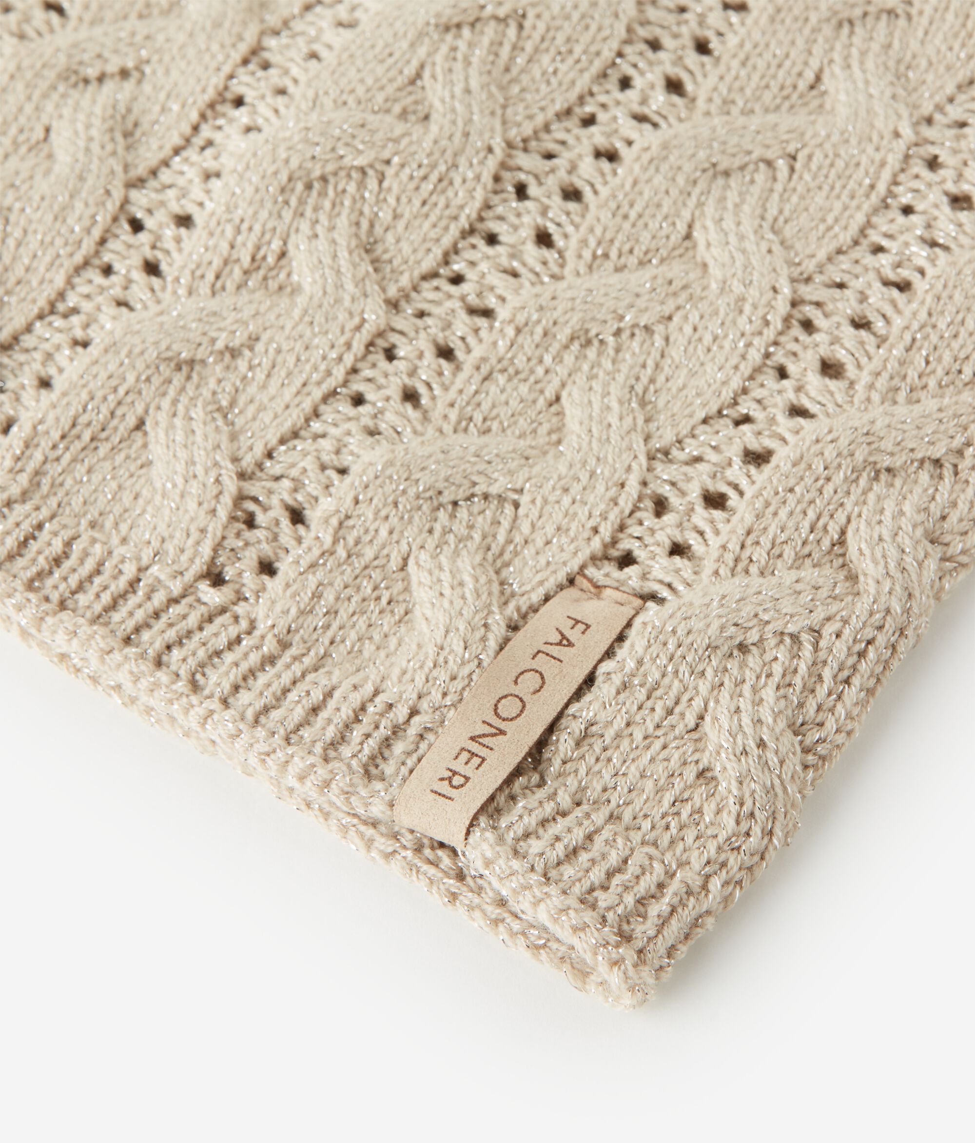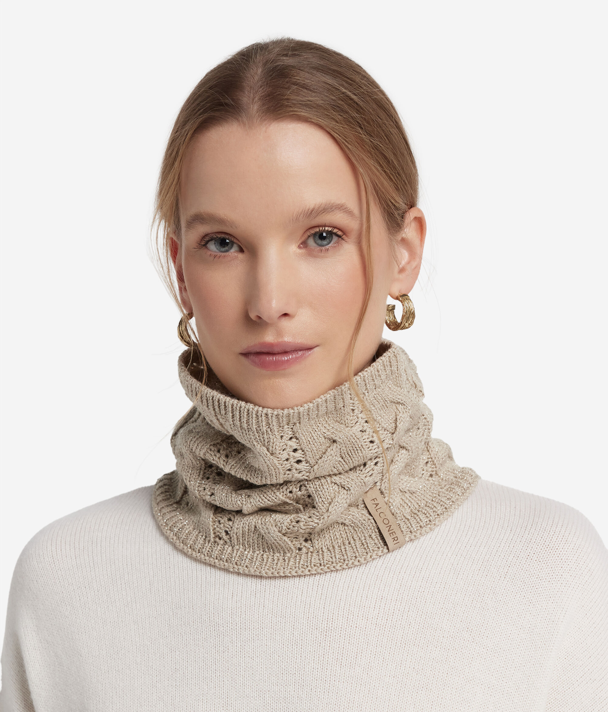 Dodatak koji spaja toplinu i stil: izrađen od lamé vune, ovaj grijač za vrat hvata svjetlost s nježnim sjajnim efektom, dok rupičasto pletivo i vertikalne pletenice daju odjevnom predmetu teksturu i pokretljivost. Elegantan i moderan, dizajniran je kako bi u hladnijim danima dao dodir sofisticiranosti i prepoznatljivosti.