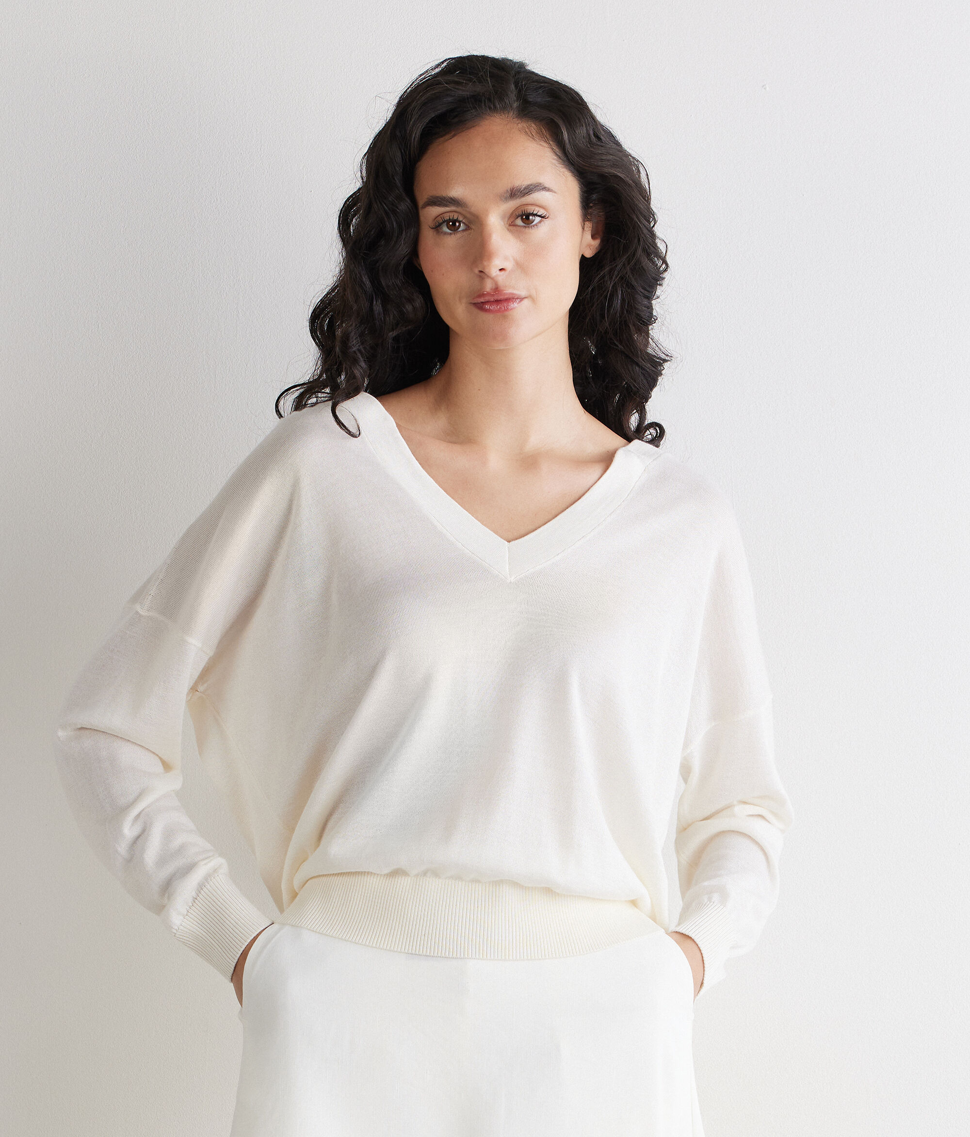 Cashmere and silk sweater with a light and sensual luxury. The double V-neck plays with depth and highlights the décolleté, while the dropped shoulders and relaxed fit define a casual, contemporary silhouette. The hip-length design enhances its versatility, making it a key piece with versatile appeal, to be interpreted with style in every season.