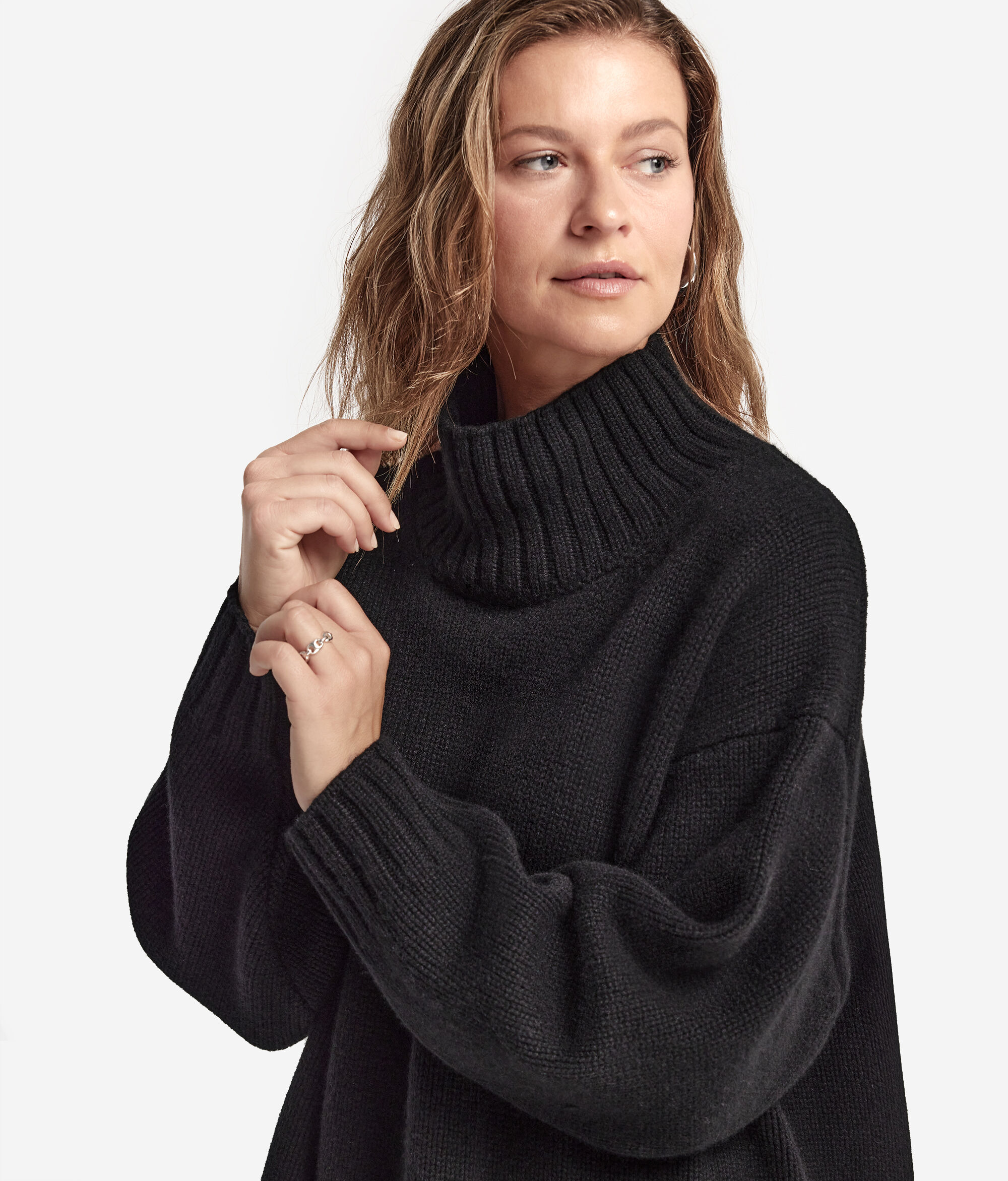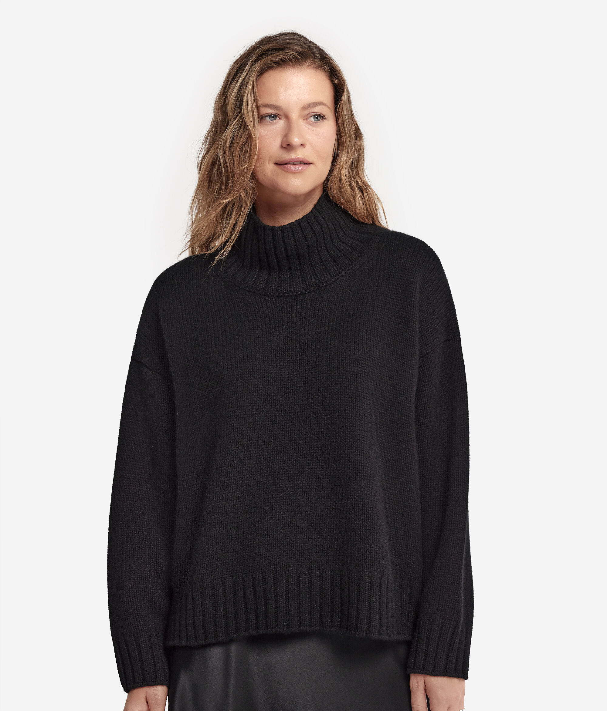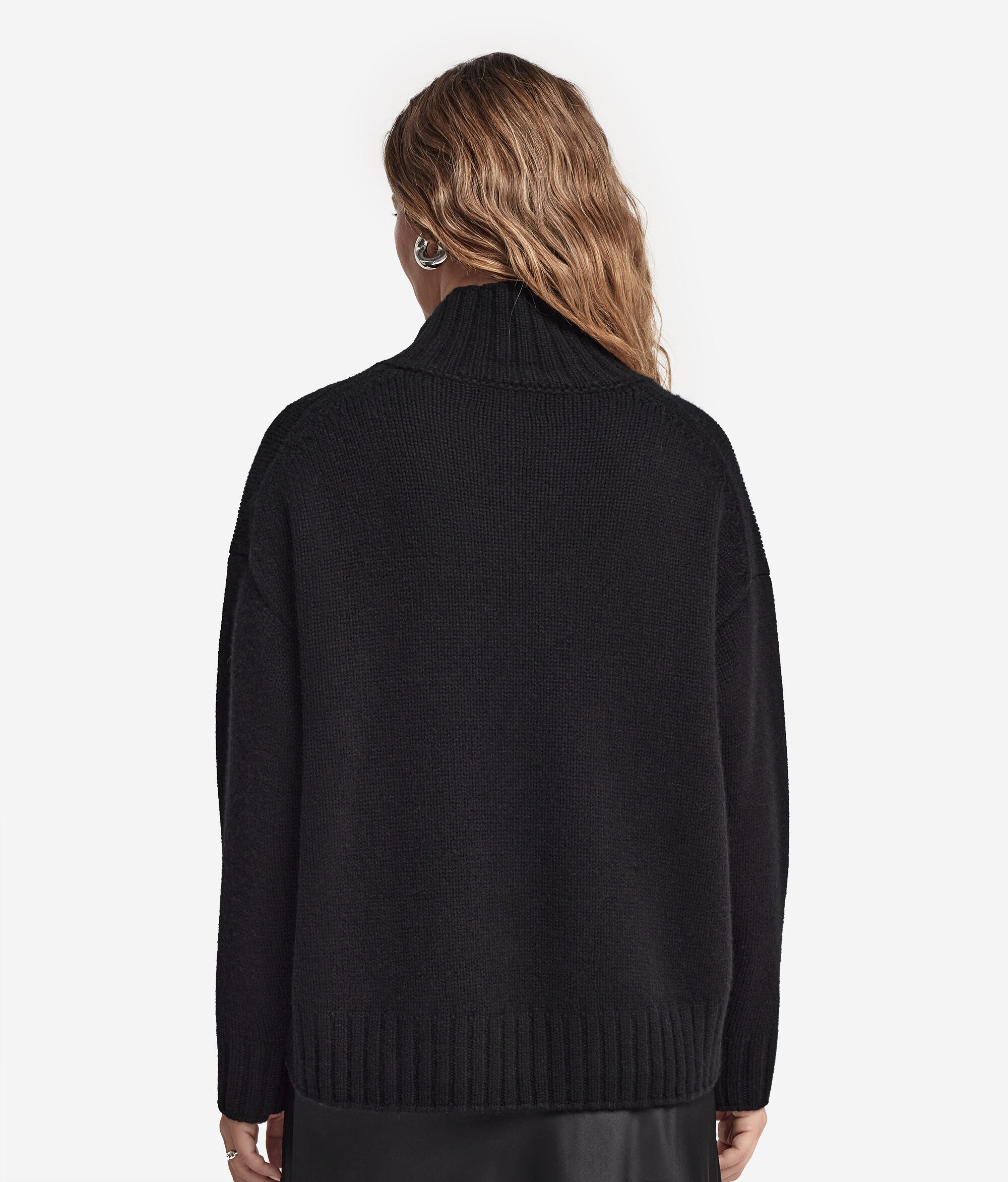 The good quality of Ultrasoft Cashmere Tricot comes together with contemporary lines in this funnel-neck jumper. Its classic flair is combined with the natural softness of the yarn and its loose fit, with dropped shoulders, which contributes to making the garment comfortable for everyday wear.