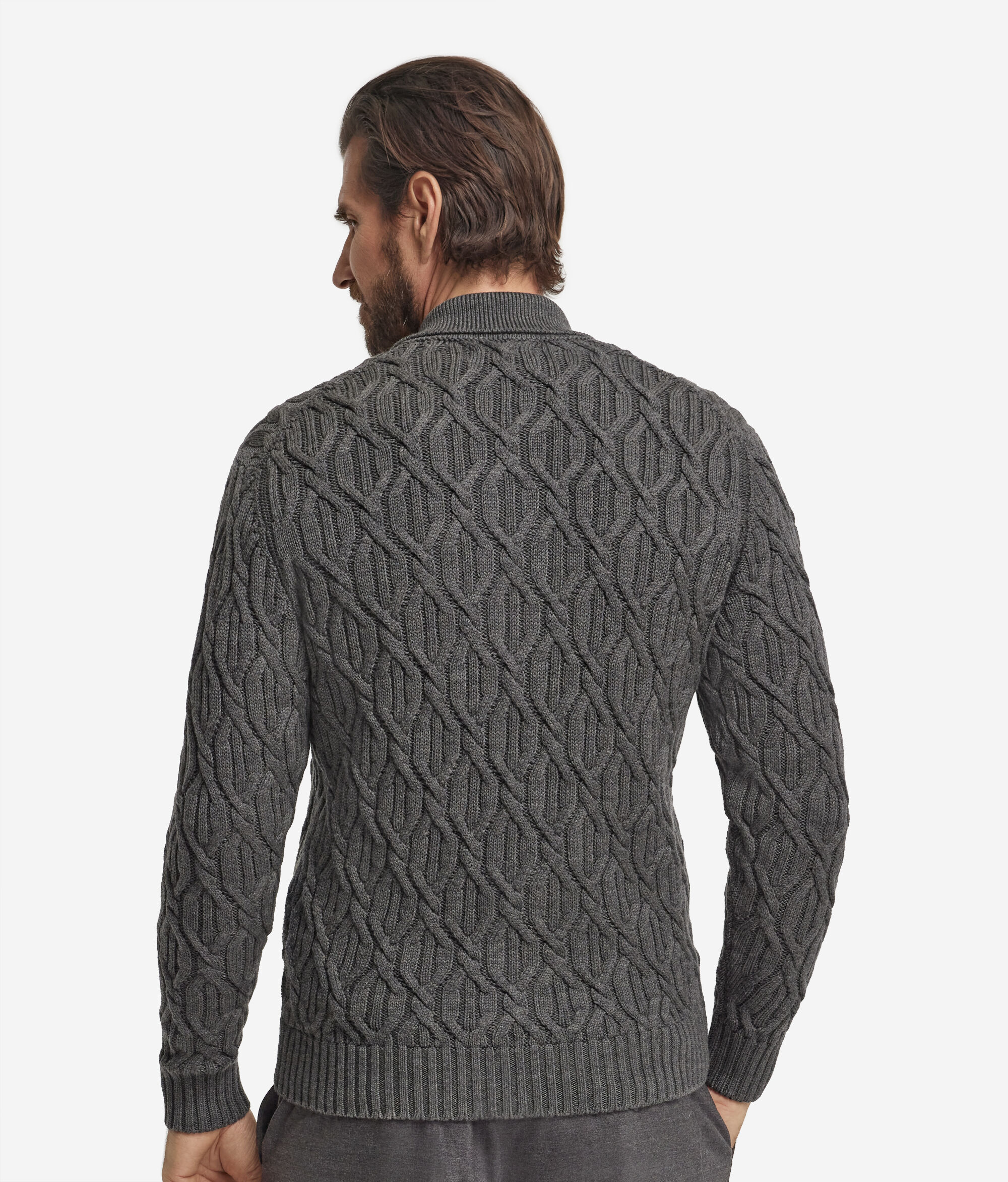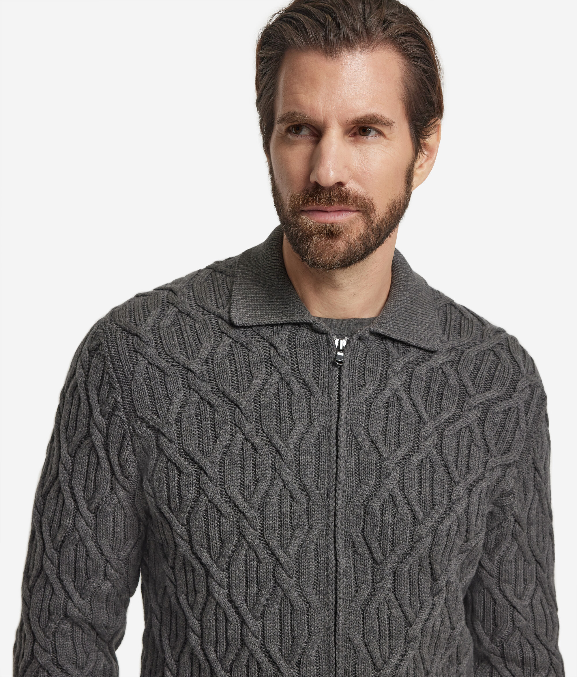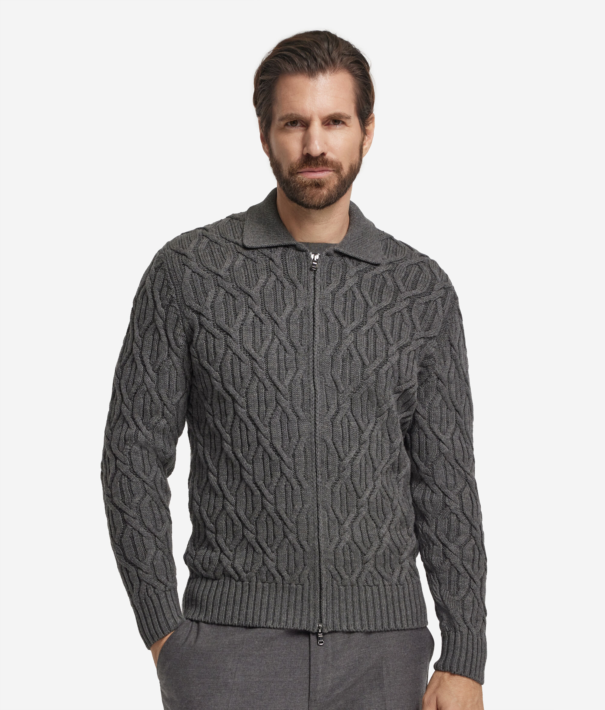 A szövet eleganciája és a modern vonalvezetés keverednek ebben a kötött gyapjú kardigánban, amelyet látványos fonott minta díszít. A bordázott gallér és az elülső cipzár modern és funkcionális stílust kölcsönöznek, míg a kissé bő szabás sokoldalúságot biztosít, ideálissá téve a lezser, mégis kifinomult összeállításokhoz.