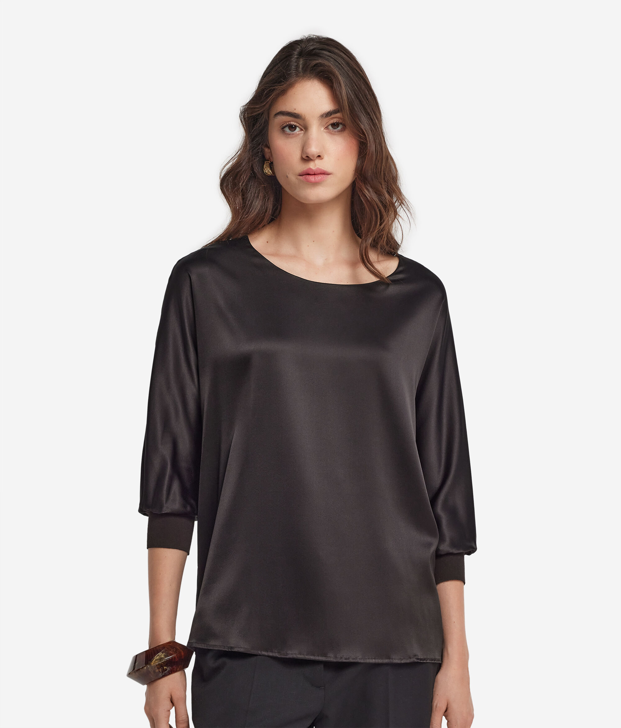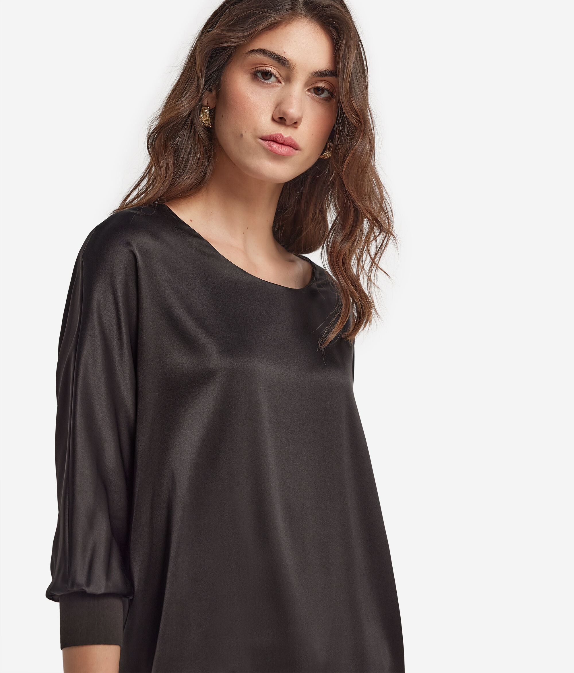 Kifinomult és elegáns stílus jellemzi ezt a selyemszaténből készült kerek nyakú pulóvert. Az alapvető dizájnt választékos részletek gazdagítják, mint például a kötött mandzsetta és a kimonóujj, amelyek könnyedséget és karaktert adnak hozzá. A laza fazon aktuális hatást ad hozzá, kiemelve a lágy és nőies sziluettet.