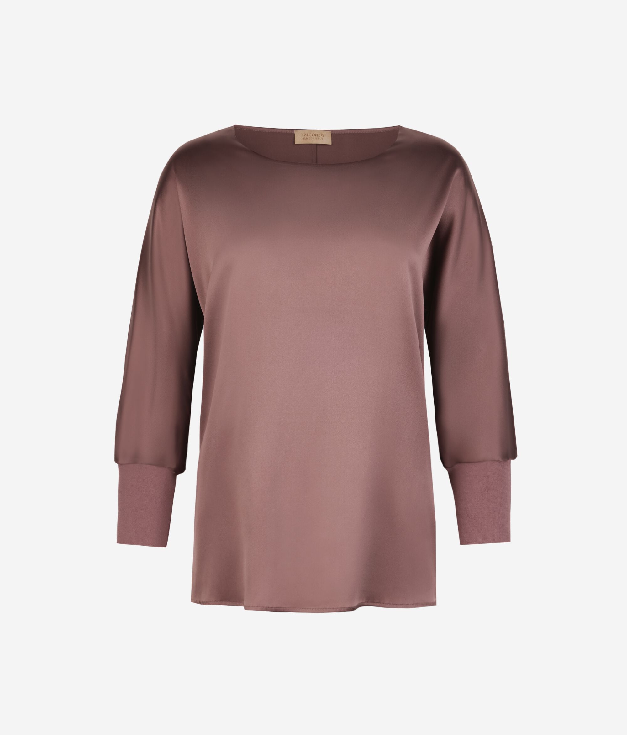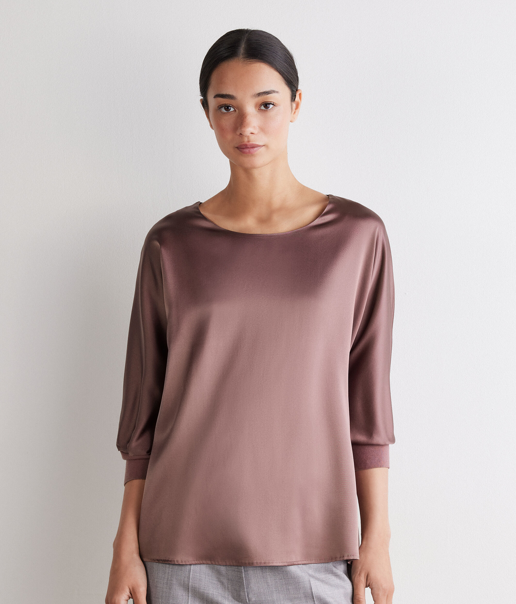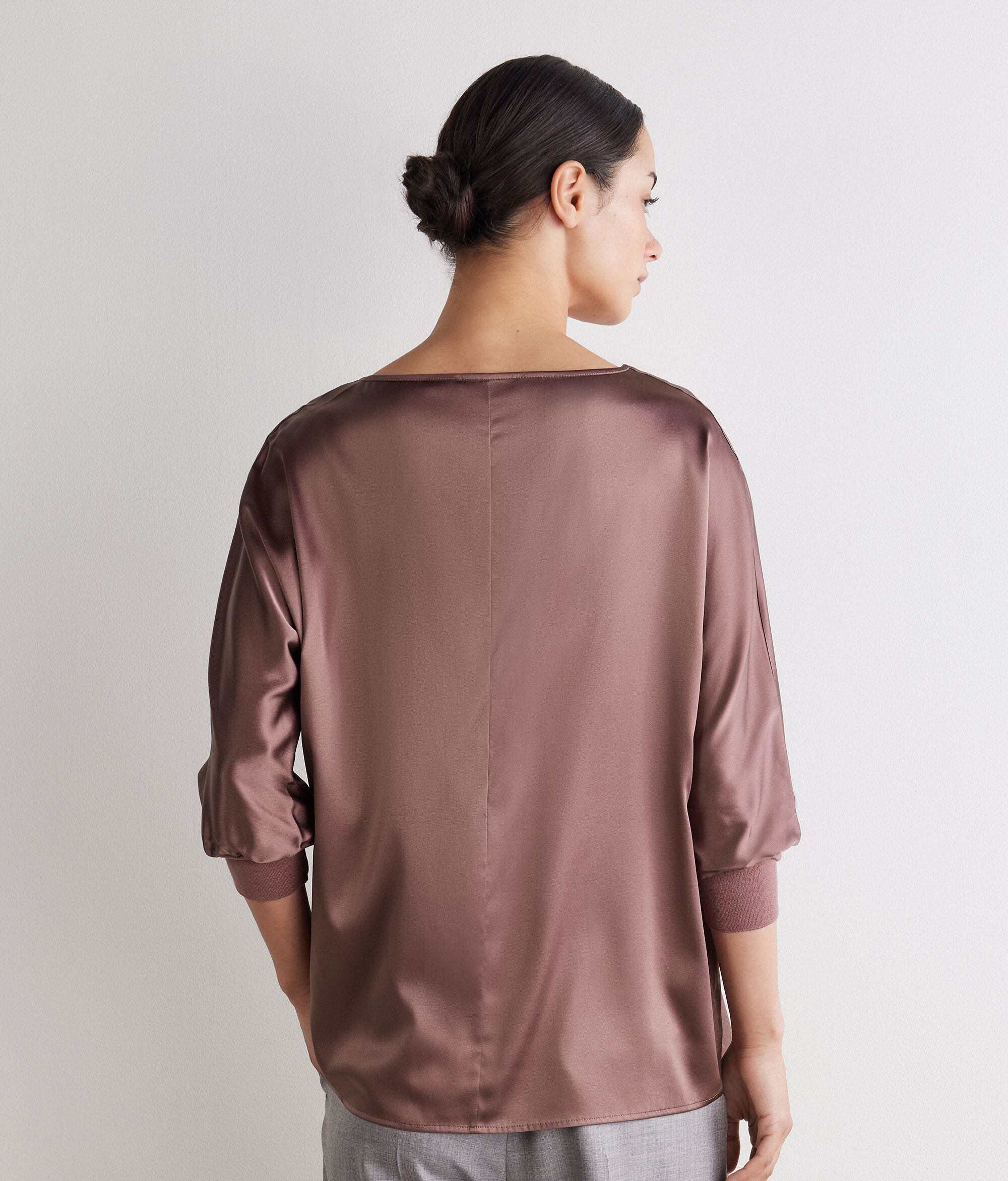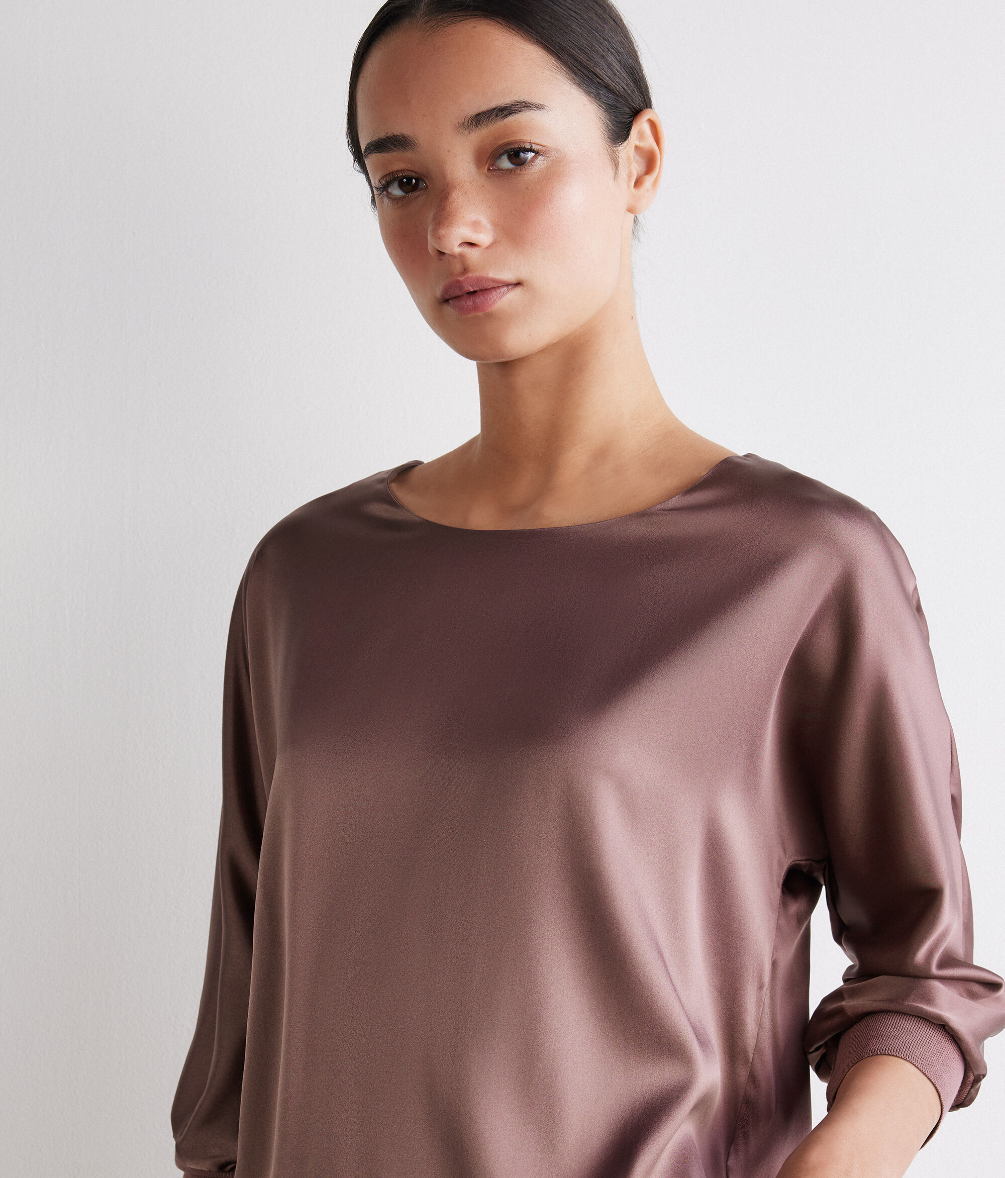 Kifinomult és elegáns stílus jellemzi ezt a selyemszaténből készült kerek nyakú pulóvert. Az alapvető dizájnt választékos részletek gazdagítják, mint például a kötött mandzsetta és a kimonóujj, amelyek könnyedséget és karaktert adnak hozzá. A laza fazon aktuális hatást ad hozzá, kiemelve a lágy és nőies sziluettet.