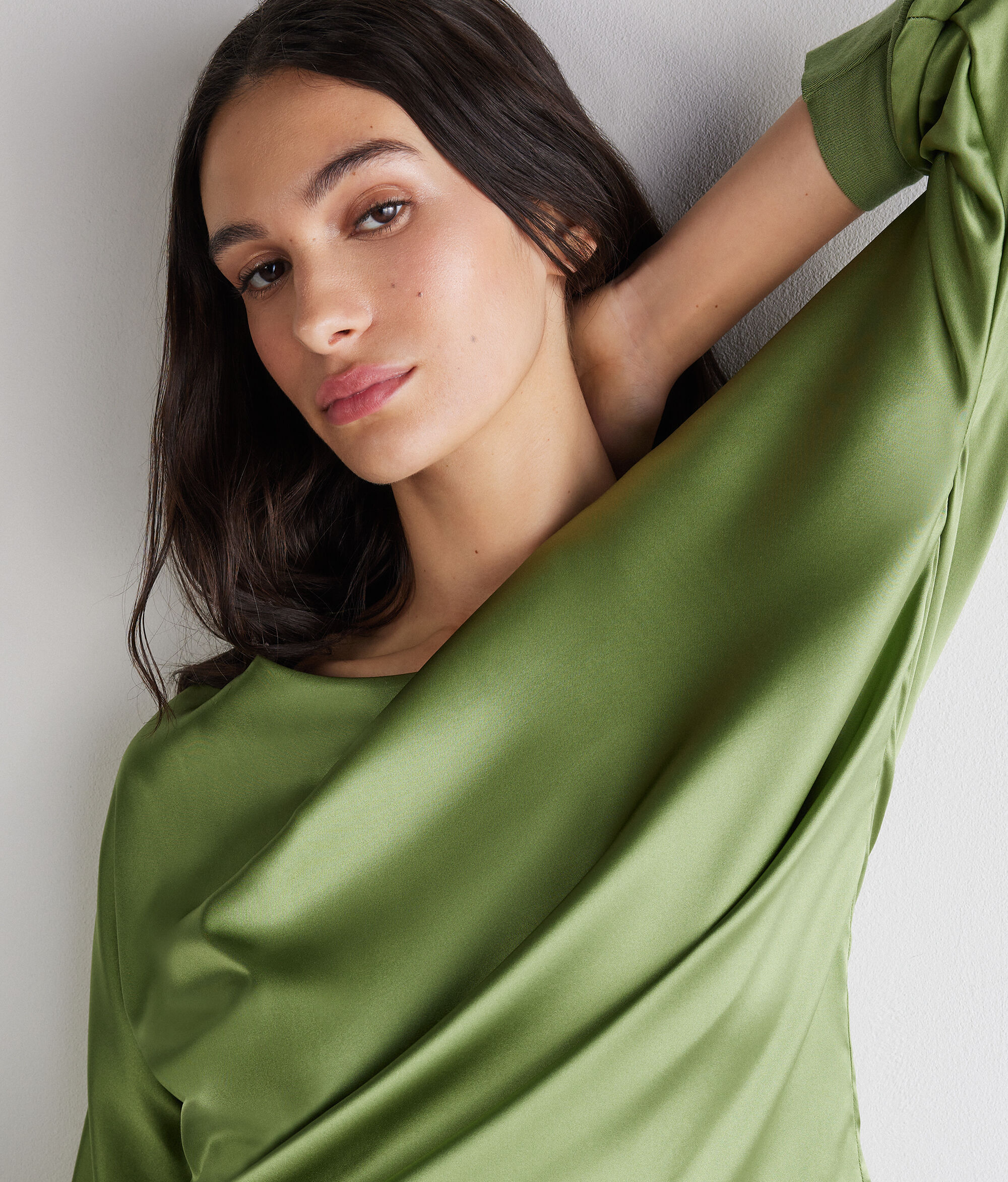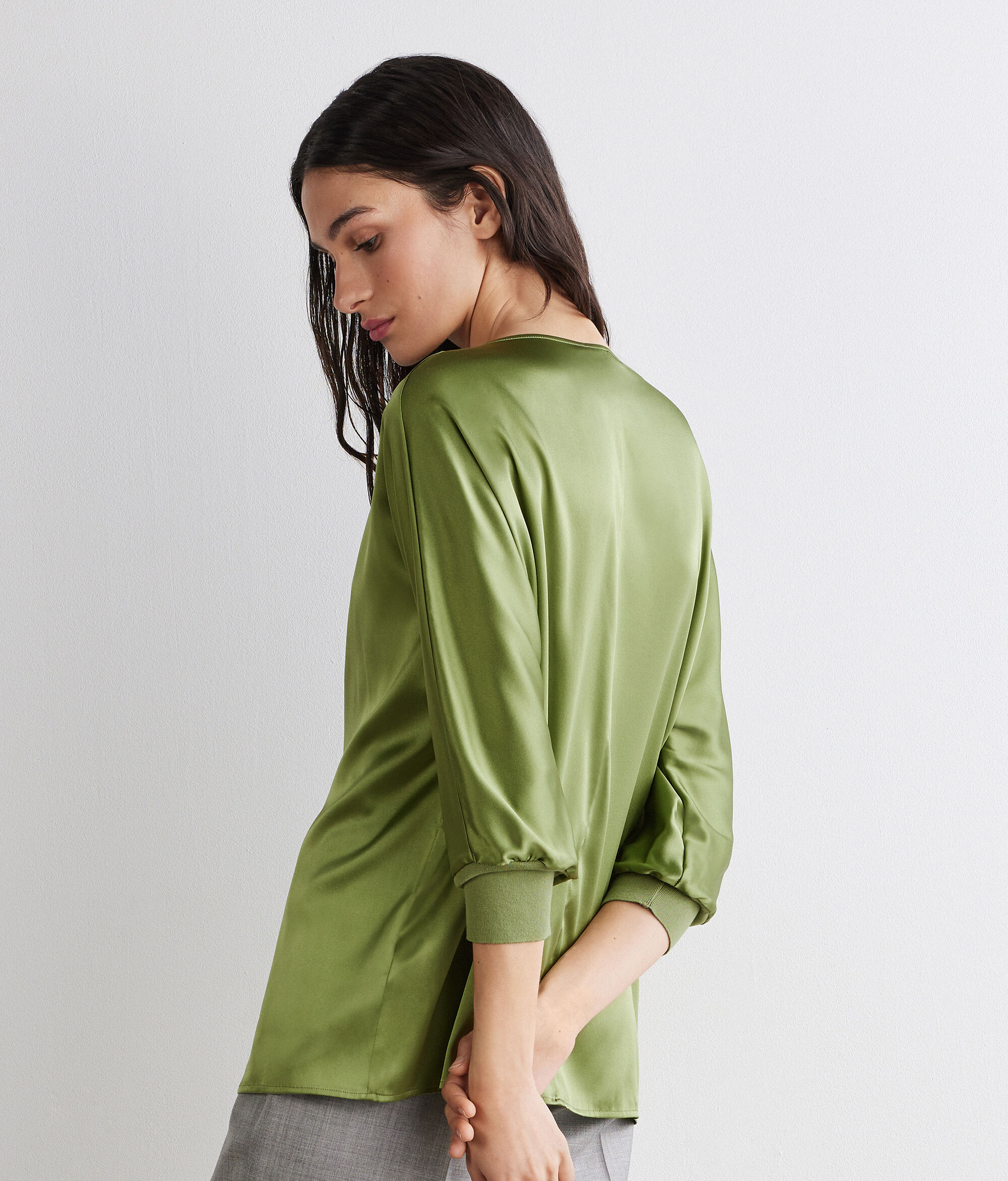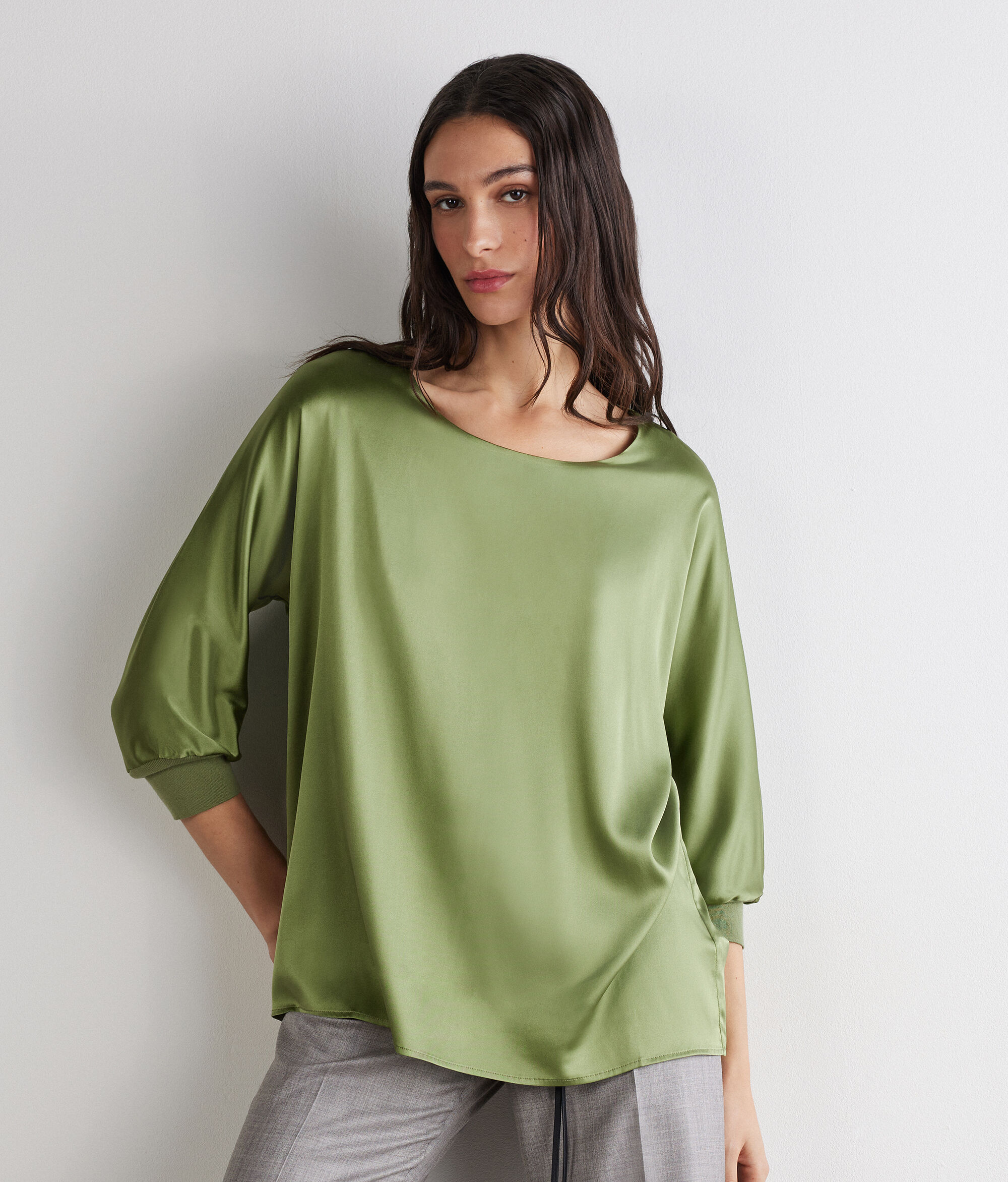 Kifinomult és elegáns stílus jellemzi ezt a selyemszaténből készült kerek nyakú pulóvert. Az alapvető dizájnt választékos részletek gazdagítják, mint például a kötött mandzsetta és a kimonóujj, amelyek könnyedséget és karaktert adnak hozzá. A laza fazon aktuális hatást ad hozzá, kiemelve a lágy és nőies sziluettet.
