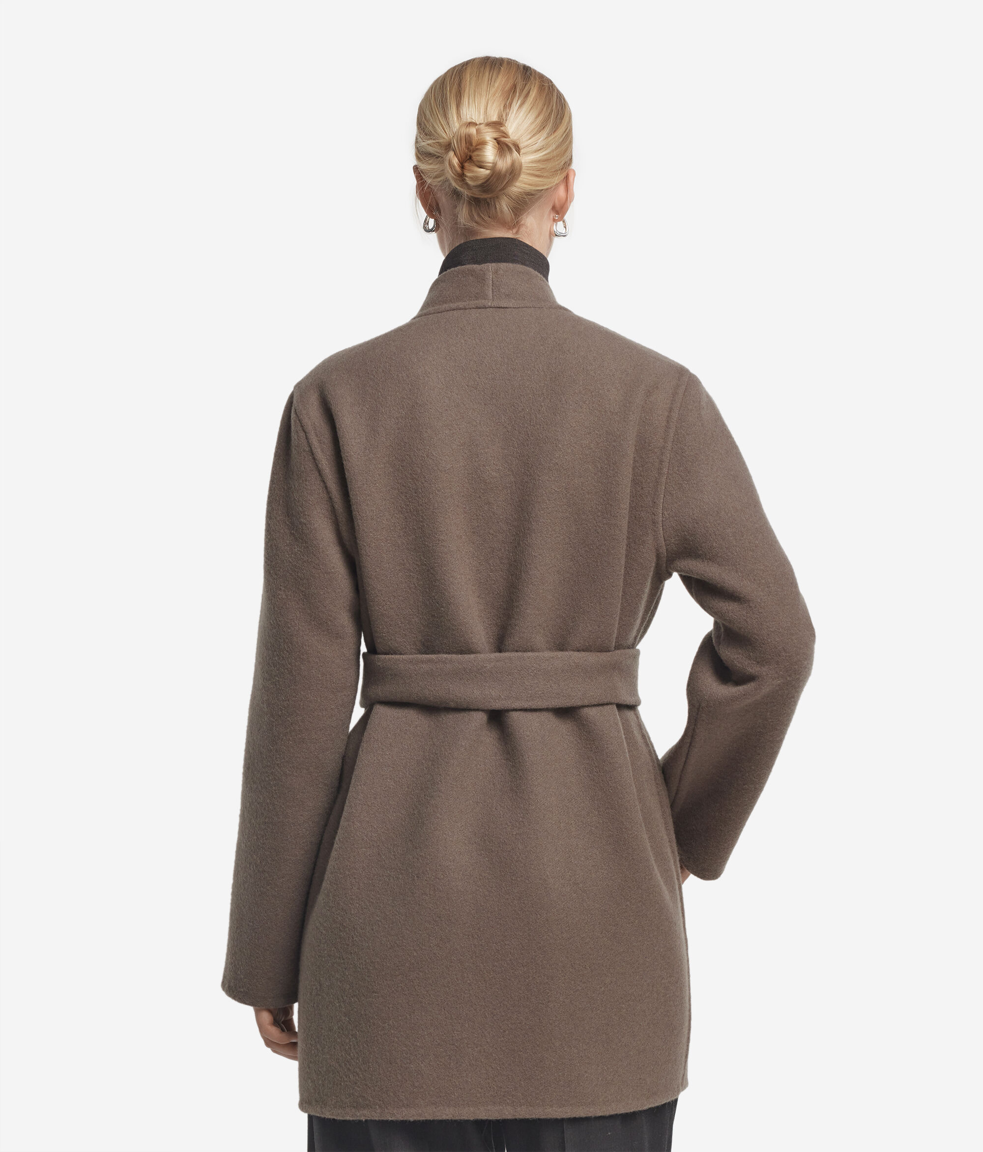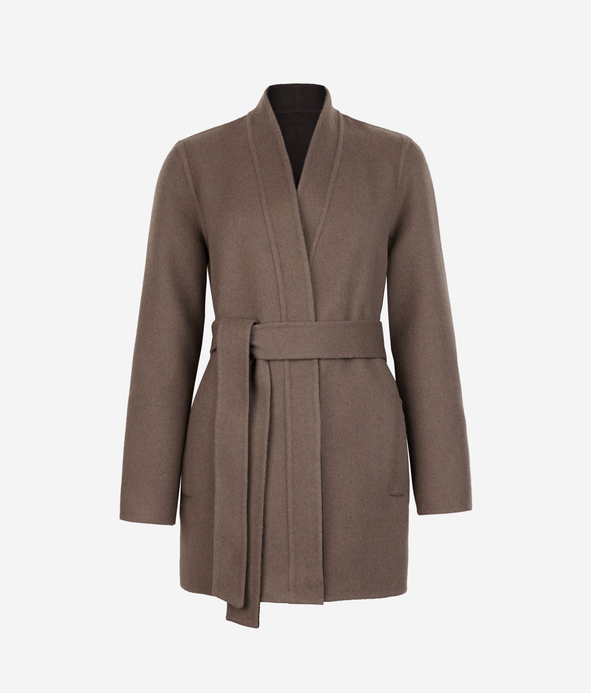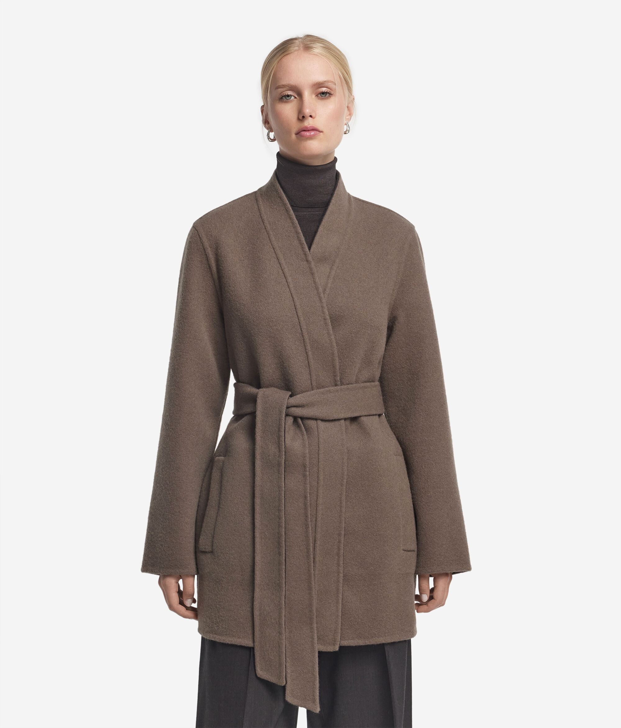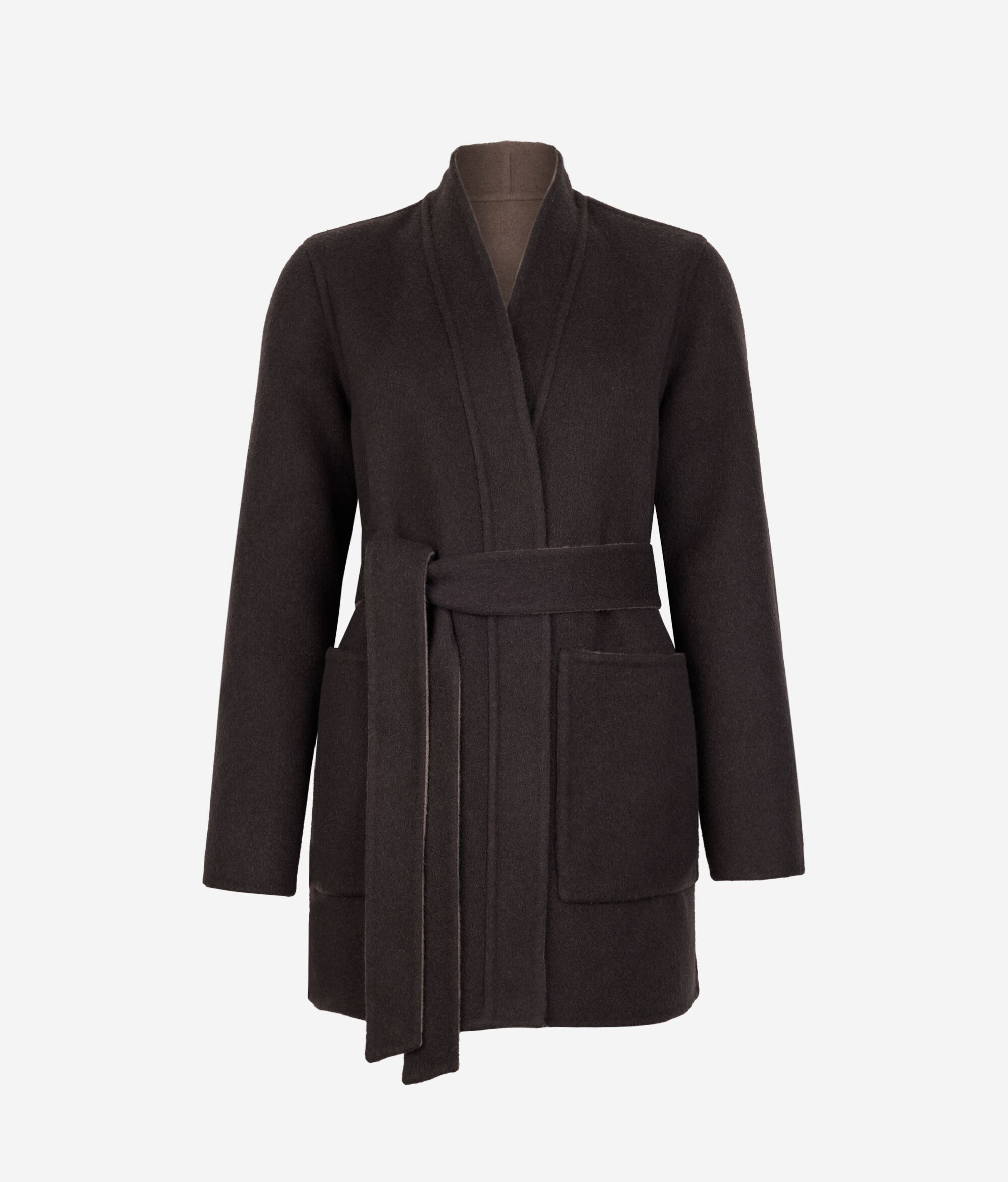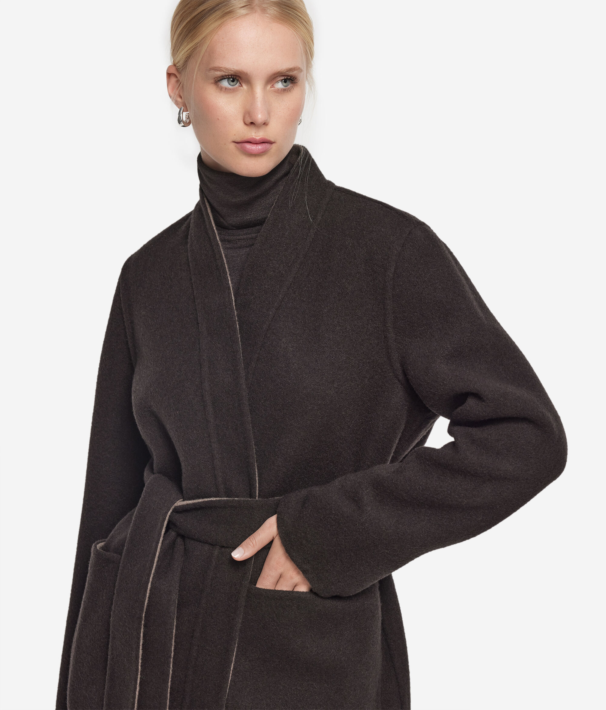 Kifinomult és kellemes viselet ez a minőségi kasmírból készült kifordítható kabát, amely a kényelem és az elegancia ötvözete. Az elegáns gallér és a foltzsebek stílusosan egészítik ki a kissé bő szabást, amelyet a derékon található öv tesz igazán tetszetőssé. Csípő alatti hossza kiemeli az alakot, jellegzetesen letisztult és elegáns ruhadarabbá téve.