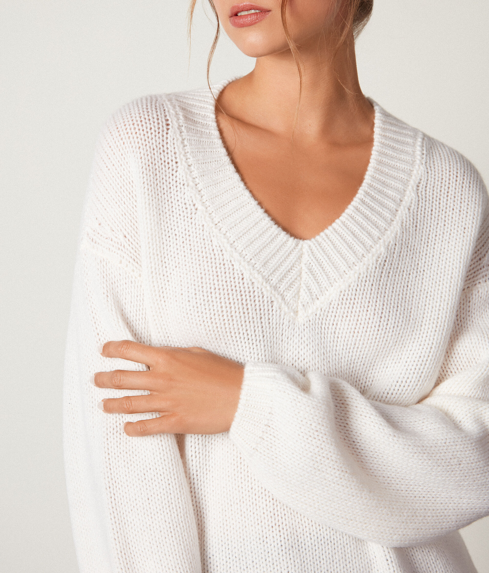 • Több szállal készült ultrakönnyű kasmírból • V-nyakú • Hosszú ujjak • Kissé ejtett vállak • A nyakkivágásán, az ujjvégeken és az alján bordázott kialakítású • Kissé bő fazon