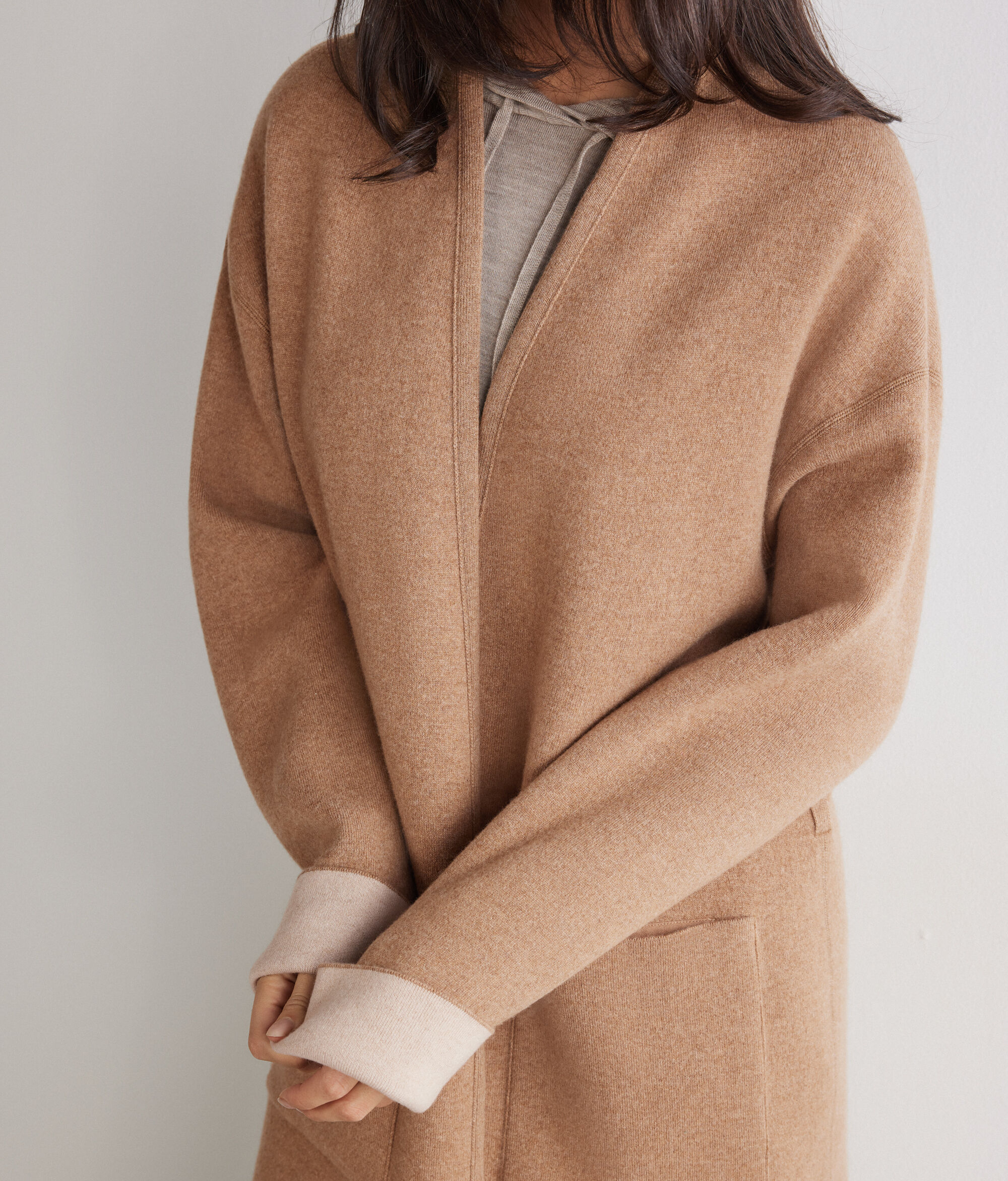 Kifordítható kabát, amely az elegáns és kifinomult stílus szóvivője, a tiszta kasmír szövetével kiemeli a klasszikus szabásvonalakat, a derékon található bőrövvel pedig előtérbe helyezi az alakot.