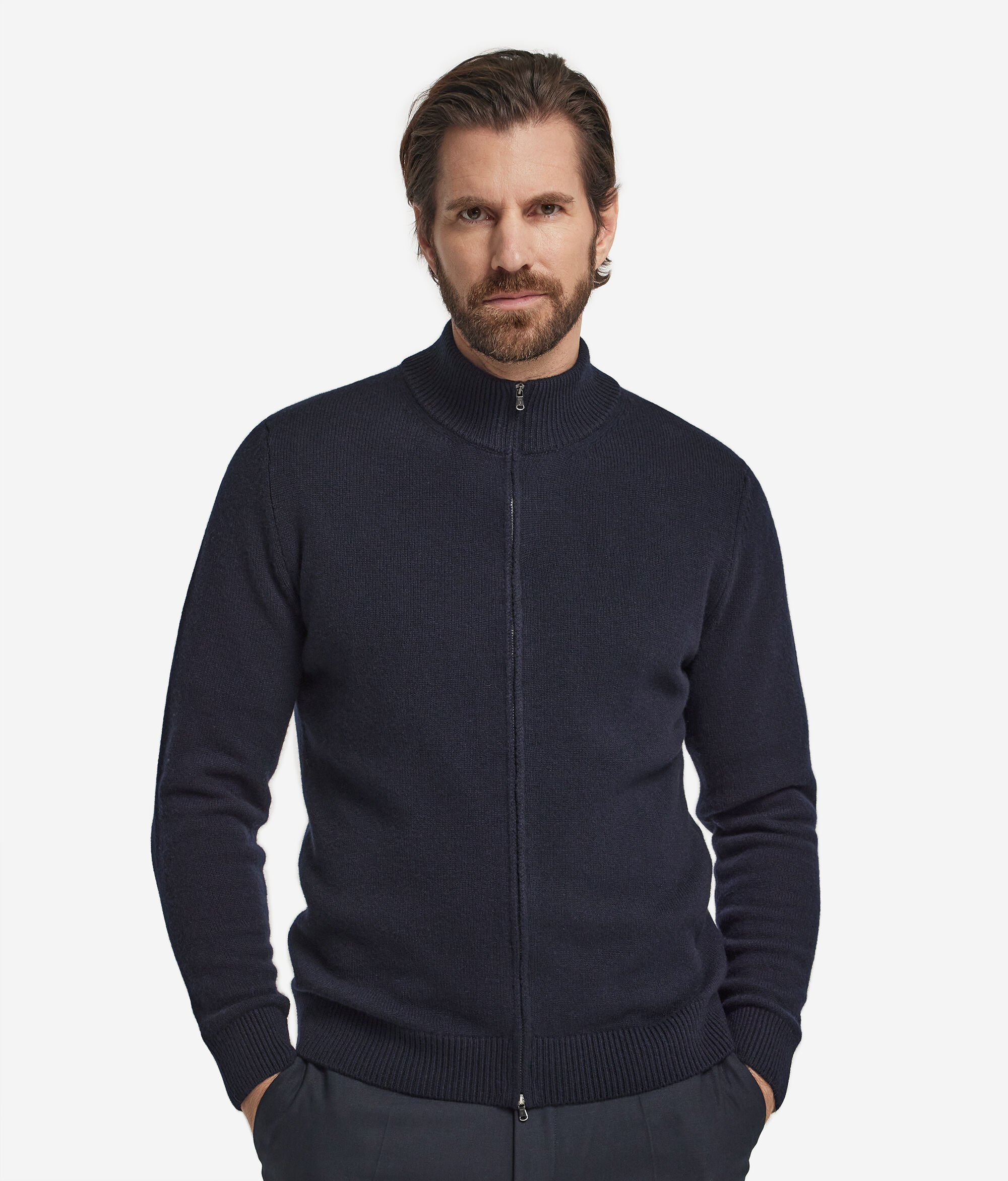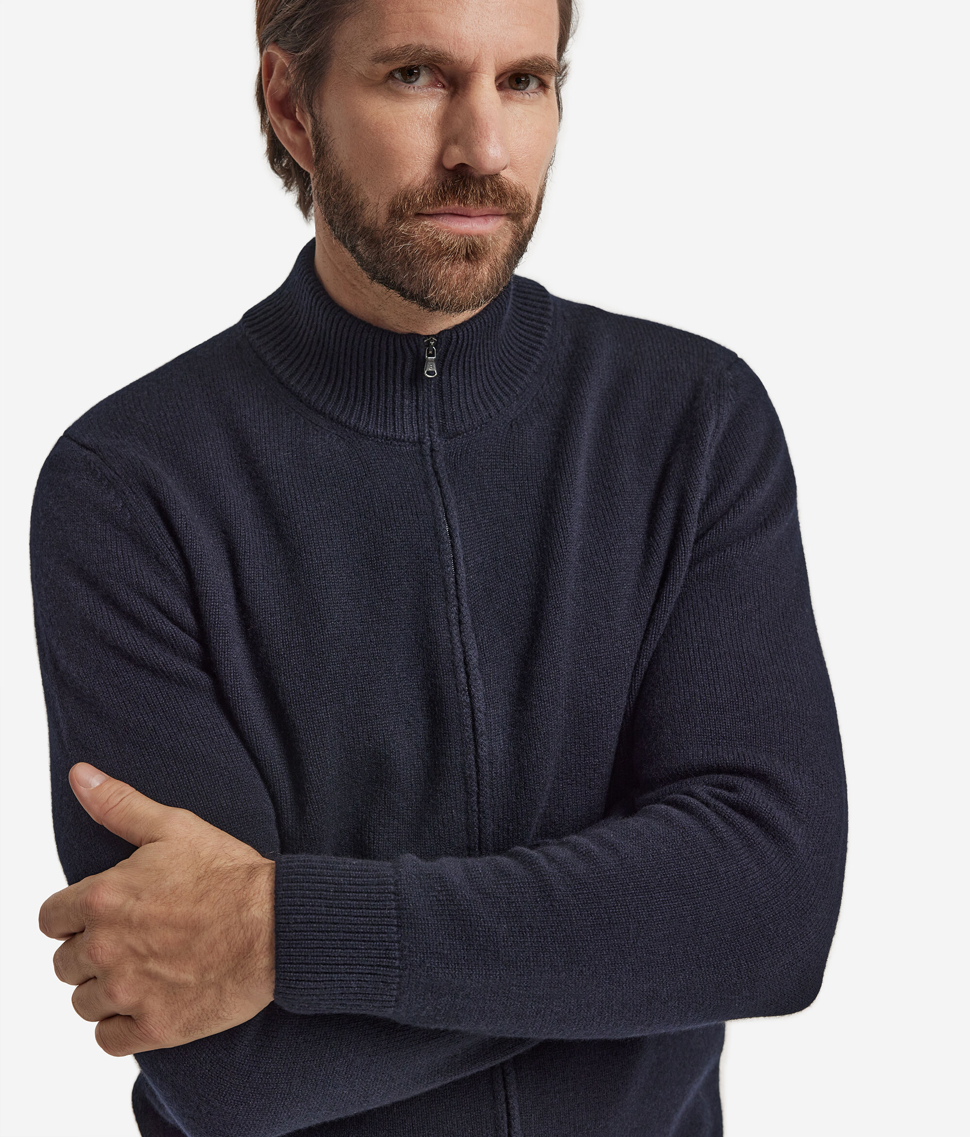 Finom Ultrasoft kasmírból készült kardigán, amely az elegancia és a kényelmet nyújtó puhaság ötvözete. A középen elhelyezkedő cipzár modern megjelenéssel fokozza a praktikus jellemet, míg a hagyományos szabás letisztult és sokoldalú sziluettet biztosít.