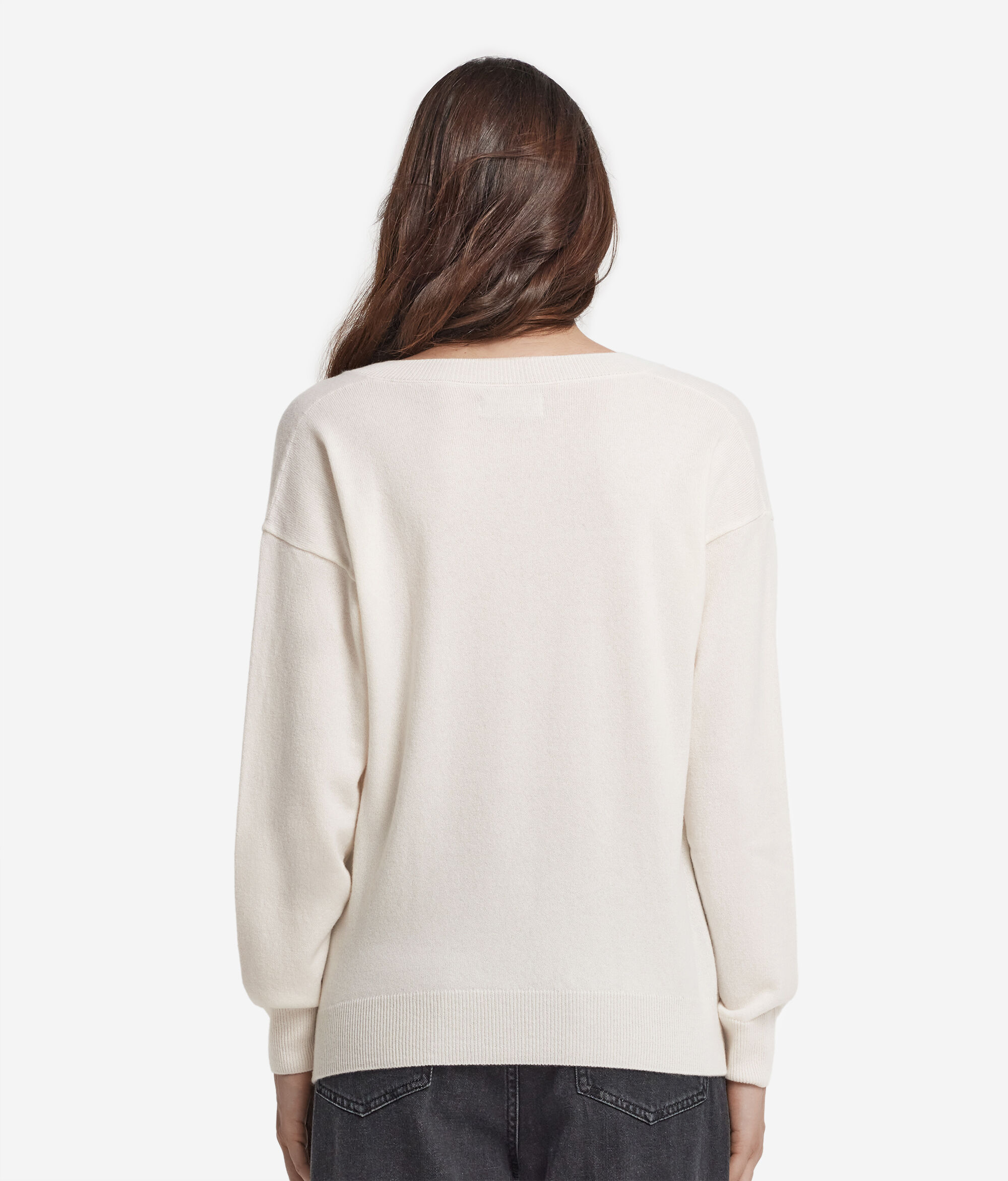 Puha Ultrasoft Kasmírból készült, V-nyakú pulóver, amely a leghidegebb napokon ruhatára kulcsfontosságú darabjává válik majd. Az alján, az ujjvégeken és a nyakkivágásán bordázott kialakítású, ami még különlegesebbé teszi. Az ejtett vállak és a bő szabás könnyed és természetes viseletet kölcsönöz, tökéletesen tükrözve napjaink modern stílusát.