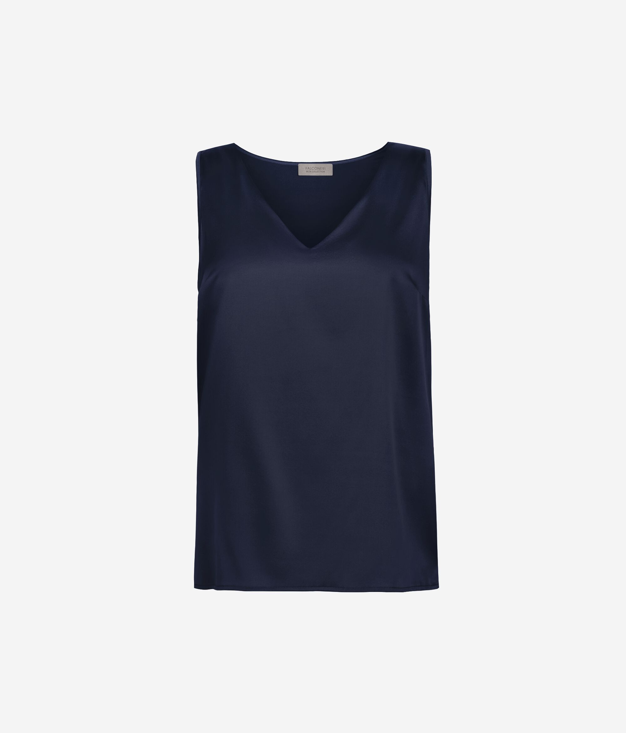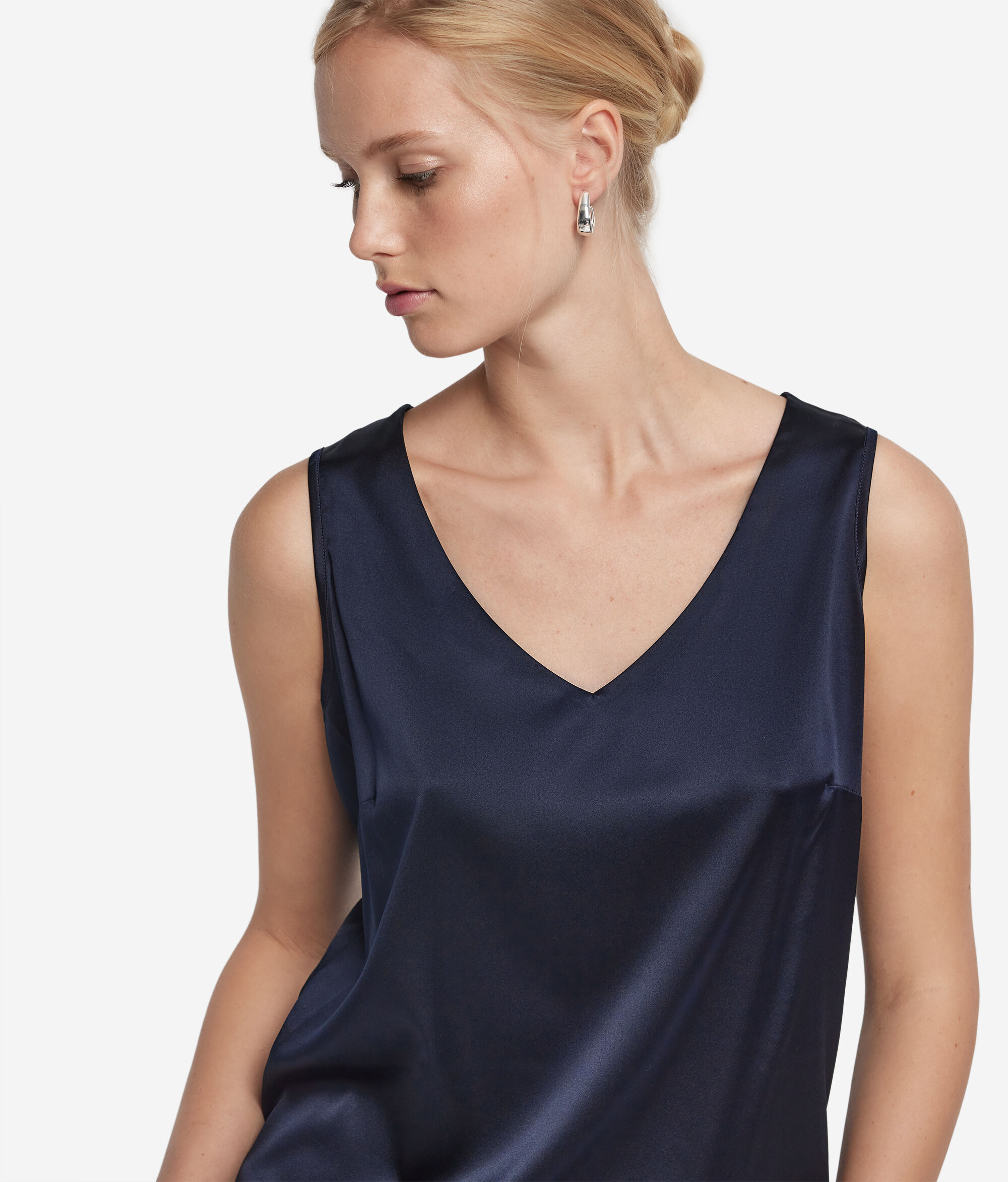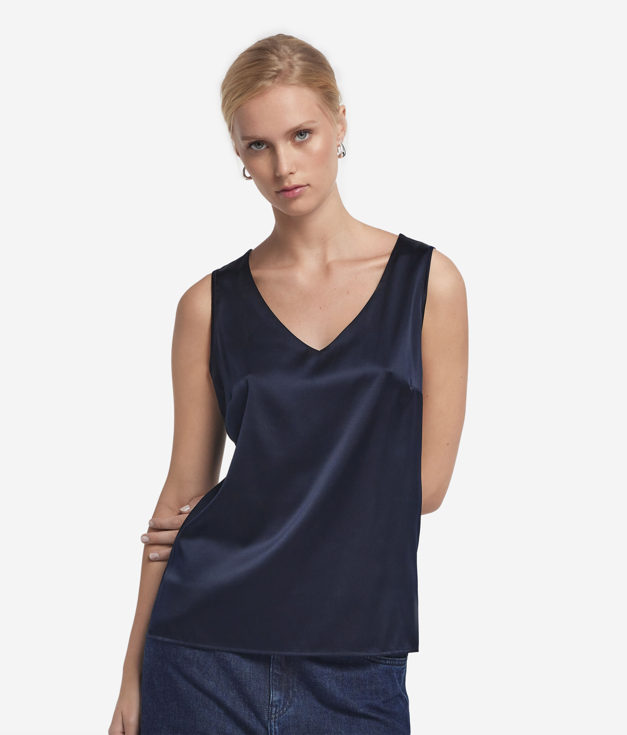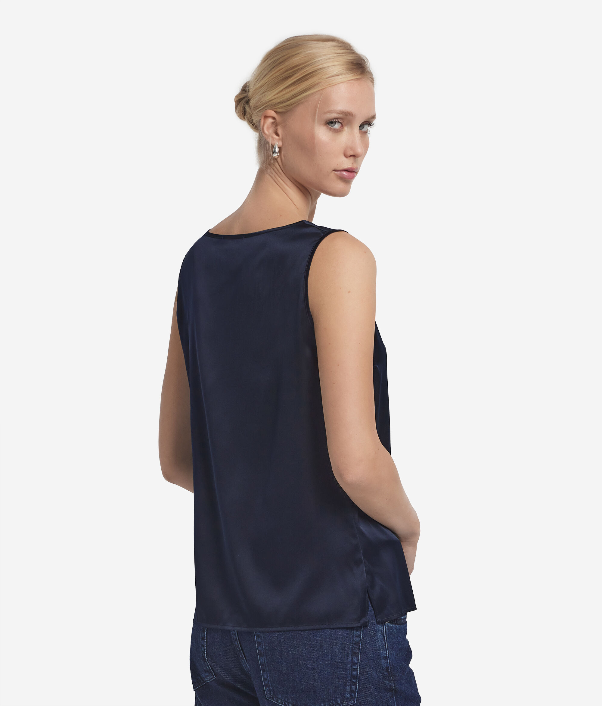 Fényes és könnyed anyagával ez a lezser szabású tiszta selyem top kiemeli a szövet szatén kidolgozásának színárnyalatait, csillogó hatást keltve. Elegáns, széles szívalakú nyakkivágása harmonikusan hangolja össze szabását és hosszát, igazán nőies modellé varázsolva a legkifinomultabb összeállítások részeként.