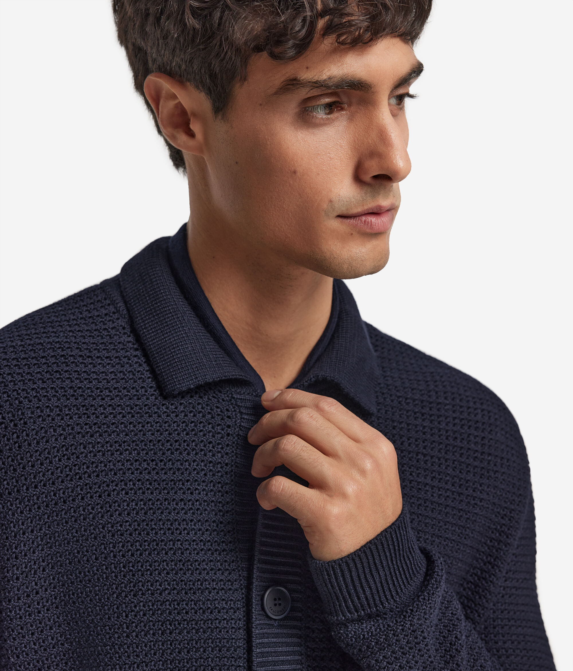 Design pulito e texture materica definiscono questa giacca camicia in maglia di lana. Il colletto strutturato e l’abbottonatura monopetto disegnano una silhouette essenziale e raffinata, valorizzata dalla vestibilità regolare. Capo estremamente versatile, si indossa con disinvoltura da solo o come capospalla leggero, ideale per look stratificati e minimal chic.