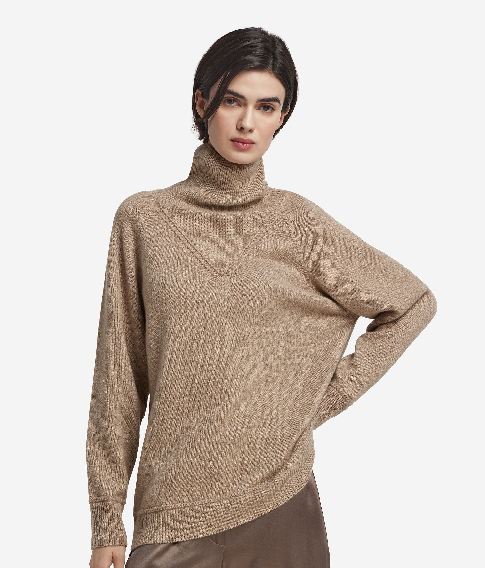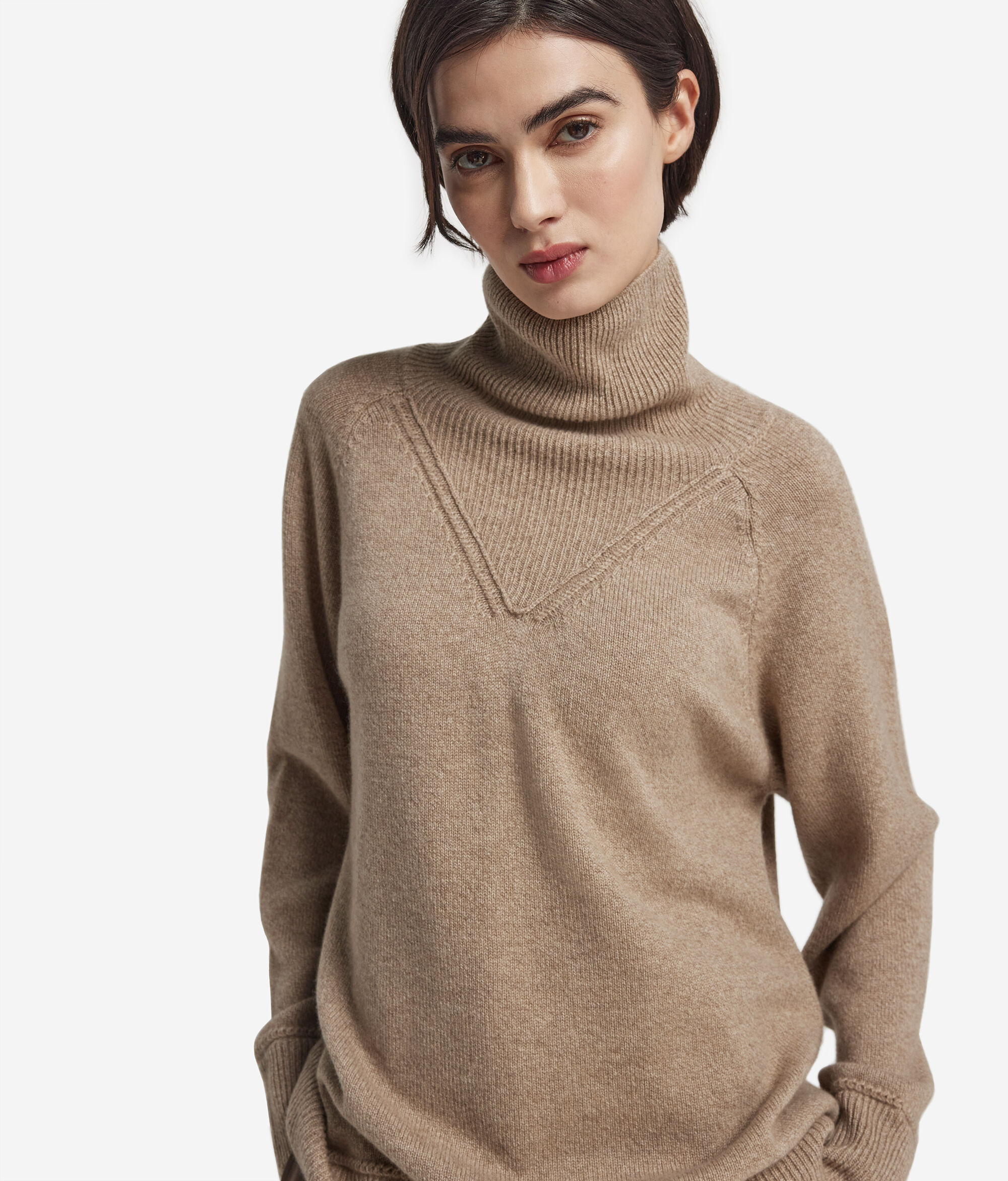 Realizzata in pregiato Cashmere Ultrasoft Undyed, questo dolcevita avvolge con la sua morbidezza naturale e non tinta. Il collo alto con dettaglio a V reinventa un classico con un tocco inatteso ed elegante. Le maniche lunghe con spalla raglan donano fluidità e comfort, mentre il dettaglio con treccina e le costine su collo, polsini e bordo, rivelano la cura artigianale che definisce il capo. La lunghezza al fianco e la vestibilità morbida la rendono un capo essenziale, capace di elevare qualsiasi outfit minimal e sofisticato.